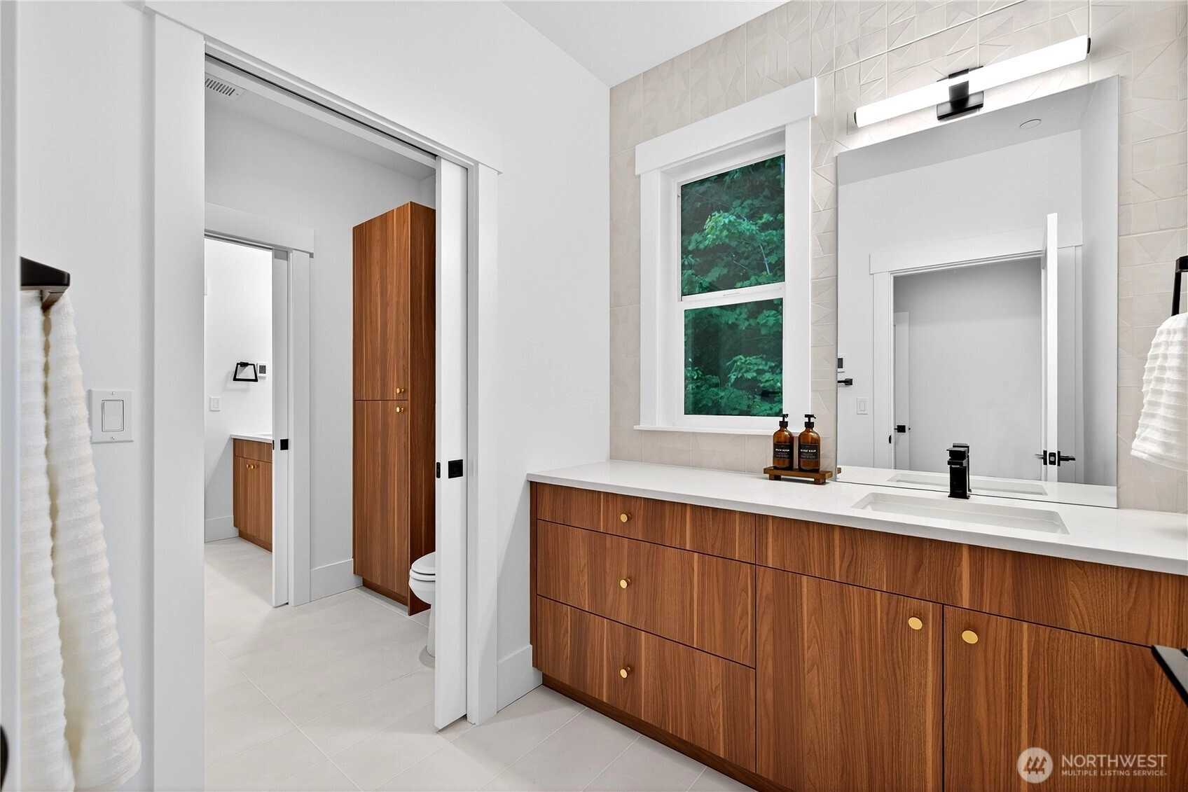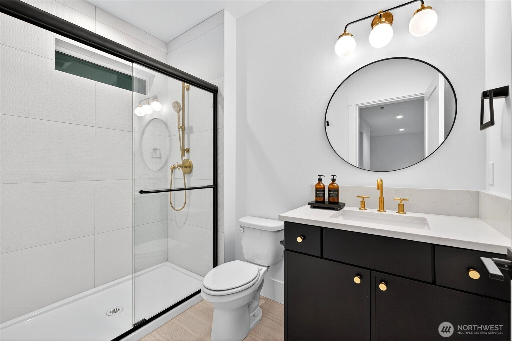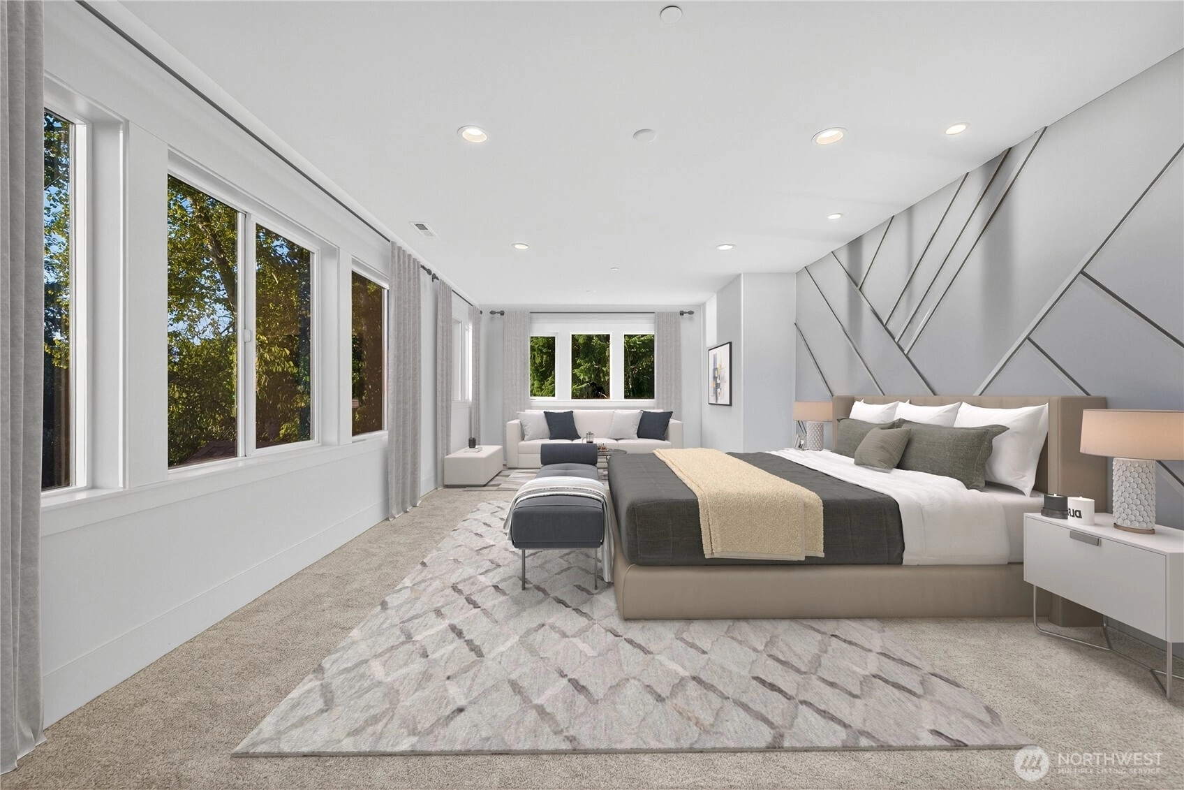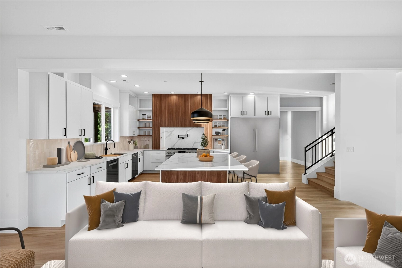 Exceptional luxury new construction in Sammamish’s Inglewood (Sammamish Sunset) neighborhood w/ sweeping Lake Sammamish views from every level. This 6,301 sqft home offers 6 beds, 5 baths, open-concept gourmet kitchen w/ high-end appliances, formal dining, sunlit great room, private office & guest ensuite. Easy main-level garage access means no stairs from car to kitchen, a rare find for the area. Two fridges on main, W/D on each floor, & tri-zone heating/cooling. Upper-level primary includes, spa-like bath w/ soaking tub (enjoy expansive lake views here too!) & large walk-in closet. Lower level includes rec room w/ wet bar & gym. Heated floors in multiple bathrooms, solar panels, & covered outdoor living. Top-rated Lake Washington schools.