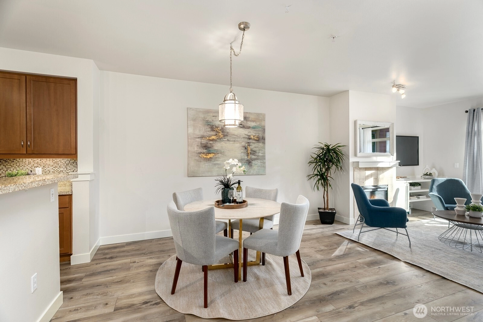 Welcome to Verdeaux, a sought-after modern upscale community with elevator access and secure indoor entry. This spacious, move-in-ready 2BD + office nook / 2BA condo is quietly tucked away at the back of the building, offering exceptional privacy and peaceful greenbelt views. Ideally situated on an accessible first-floor level with no steps, the home features 9-foot ceilings, a bright open floor plan, and a cozy gas fireplace. Recently refreshed with brand-new wide luxury vinyl plank flooring and fresh interior paint, the home feels both contemporary and inviting. The generous primary suite includes a walk-in closet, additional storage, and a spacious 5 piece ensuite bath. The chef’s kitchen is well-appointed with granite countertops, gas cooking, stainless steel appliances, and a breakfast bar, seamlessly connecting to the living and dining areas—perfect for entertaining or everyday comfort. Enjoy indoor-outdoor living with two private covered balconies, ideal for relaxing among the trees. Additional features include a full-size washer/dryer, secure building entry, a gated garage w/ elevator access, one underground garage parking space plus one dedicated exterior space, and guest parking. Community amenities include walking trails, pickleball/tennis court, playground, picnic areas, BBQ stations, and a gazebo. Pet-friendly with no rental cap, no special assessments, and a strong HOA. Prime location near I-405, Park & Ride, Downtown Kirkland, Bothell, Totem Lake shopping.