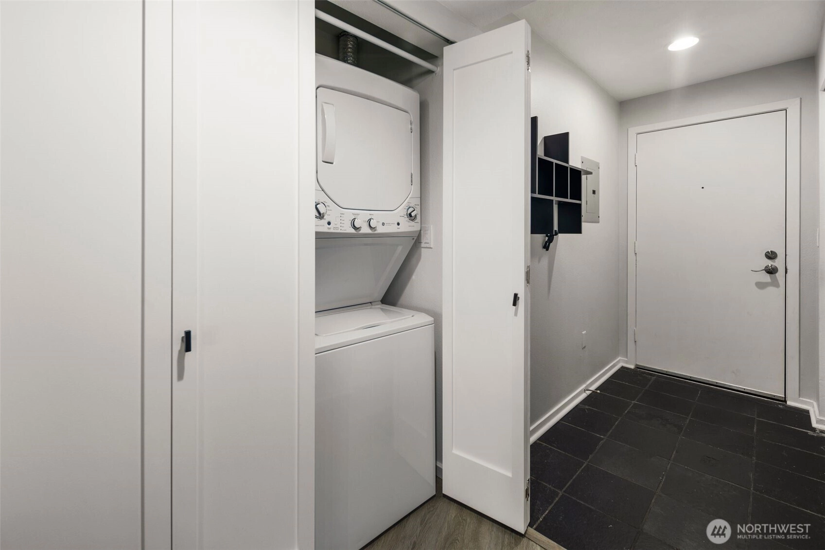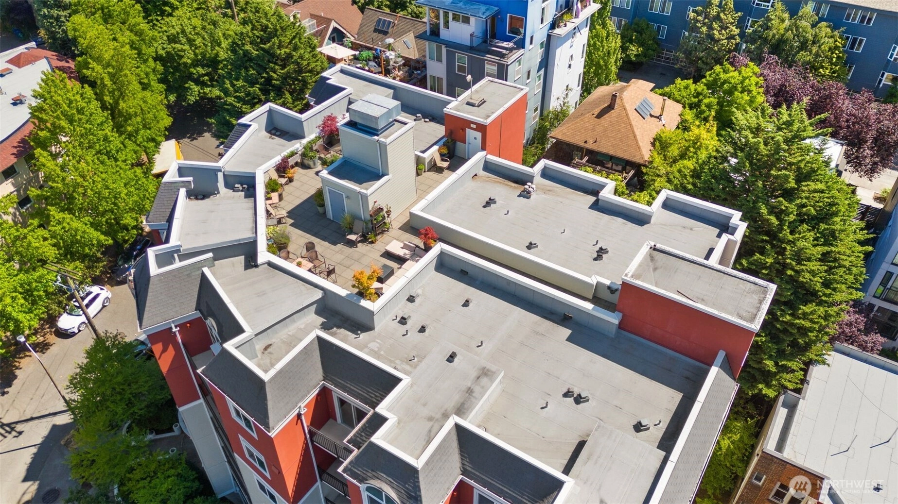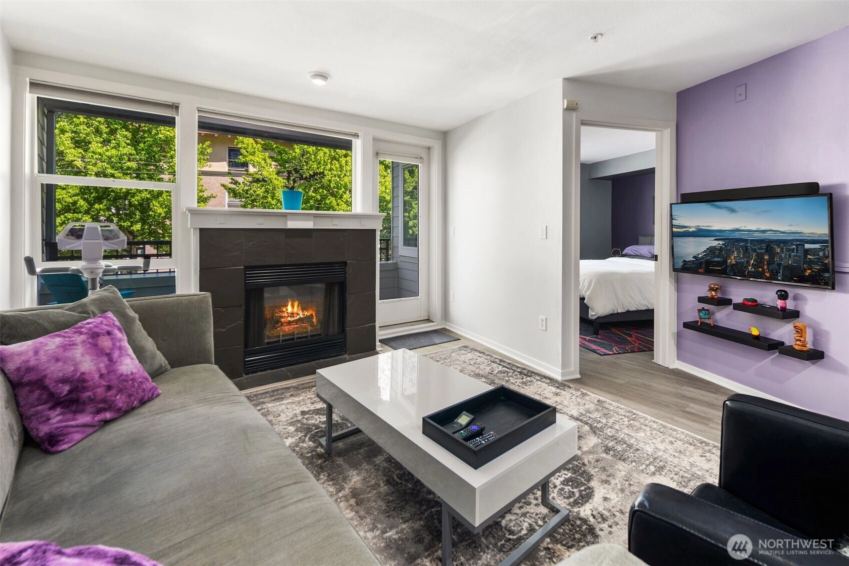 In an excellent location, this updated 1 bed/1 bath condo offers 634 SF of stylish comfort. Floor-to-ceiling windows fill the space with light, highlighting newer countertops, black stainless appliances, updated flooring, modern fixtures, and a soothing color scheme. Enjoy the gas fireplace and relax on your cozy covered balcony. The bedroom features a generous walk-in closet and a well-appointed updated bathroom. Includes one assigned parking spot in a secured garage. The building offers an inviting lobby and a stunning rooftop deck with city views, mountains, Lake Union, Puget Sound and Space Needle. Just blocks from the Broadway light rail station, restaurants, shops, trolley and downtown Seattle—urban living at its best.