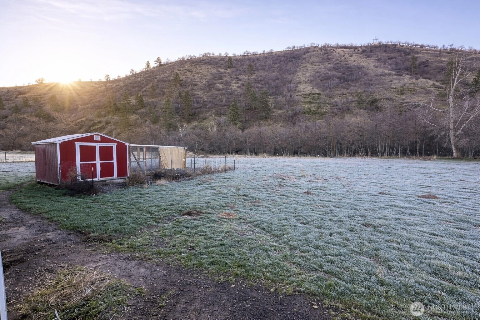 Versatile country property with a large pole building and beautiful rural setting just outside of Waitsburg. The pole building includes 1,800 sq ft of open gravel-floor machine shed space plus a 1,320 sq ft enclosed concrete-floor area, insulated and equipped with a bathroom, offering great potential for a shop, workspace, or future apartment (buyer to verify). Set on enriching acreage with open views, established fencing, and a peaceful river nearby, the land offers room to enjoy and use. The 2-bed, 1-bath home features a comfortable layout with a spacious living room, functional kitchen, wood stove for supplemental heat, and both front and back decks to take in the surroundings. A solid opportunity for those looking for space, flexibility, and quiet country living.