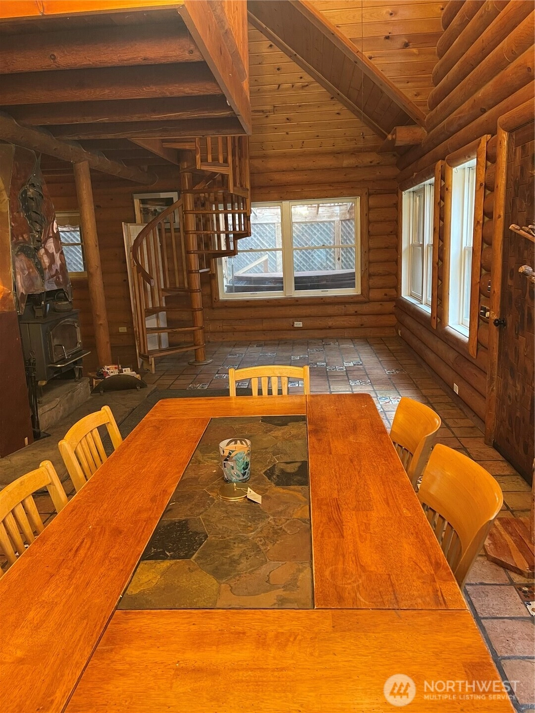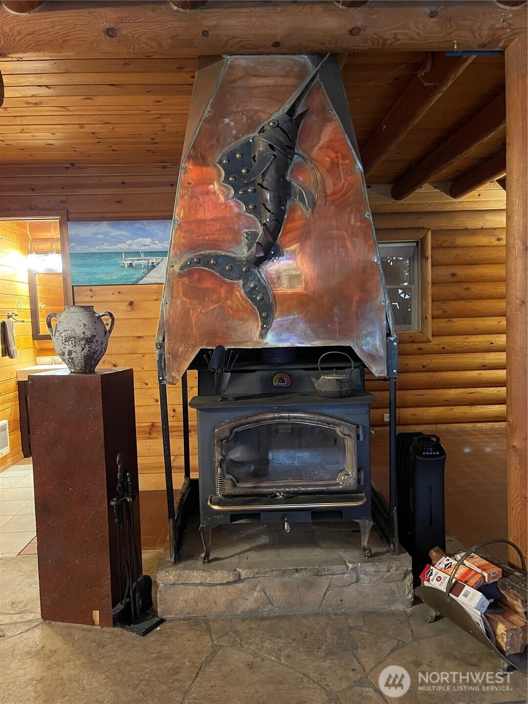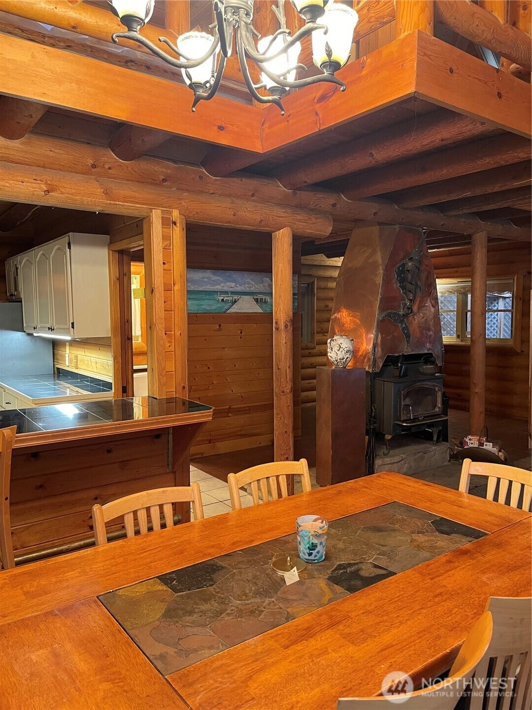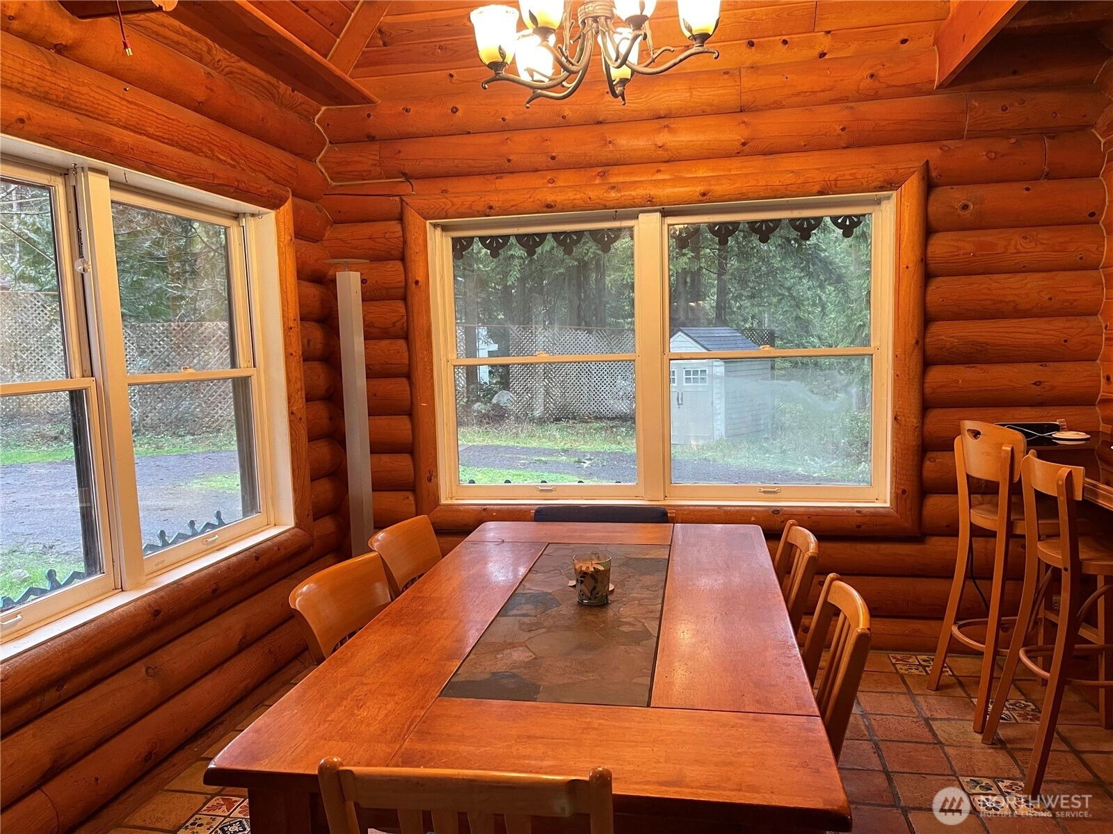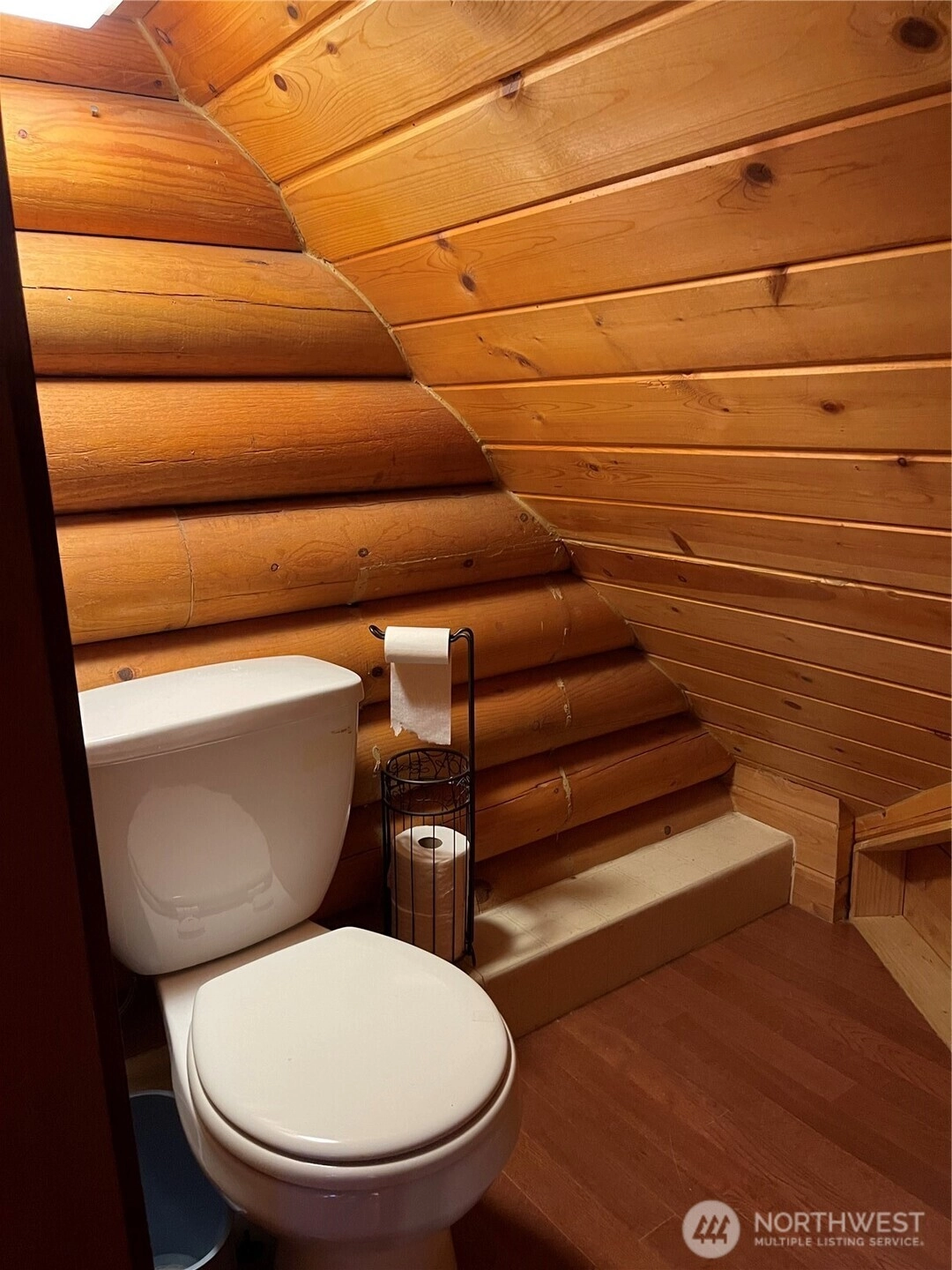 Charming Adirondack rustic log cabin located close to town is ready for your personal touches. Large partially wooded lot with 2 bedroom septic provides room for expansion. Main floor offers a surprisingly spacious kitchen, eating bar, dining space and living room w/beautiful wood stove, a full bath and semi-private sleeping space as well as a full laundry/utility room with access to the outside. The loft space includes a private half bath, Bed & wardrobe. Upstairs also has access to the outside with stairs down to private back deck which leads to an enclosed Spa area that features a sauna, hot tub and outdoor shower. Carport for additional dry storage. Nice front deck on the sunny side of the house is good for BBQing and entertaining. Large fire pit area and beautiful old growth cedars on the mossy hillside. Make this affordable property your cozy home or your next investment.