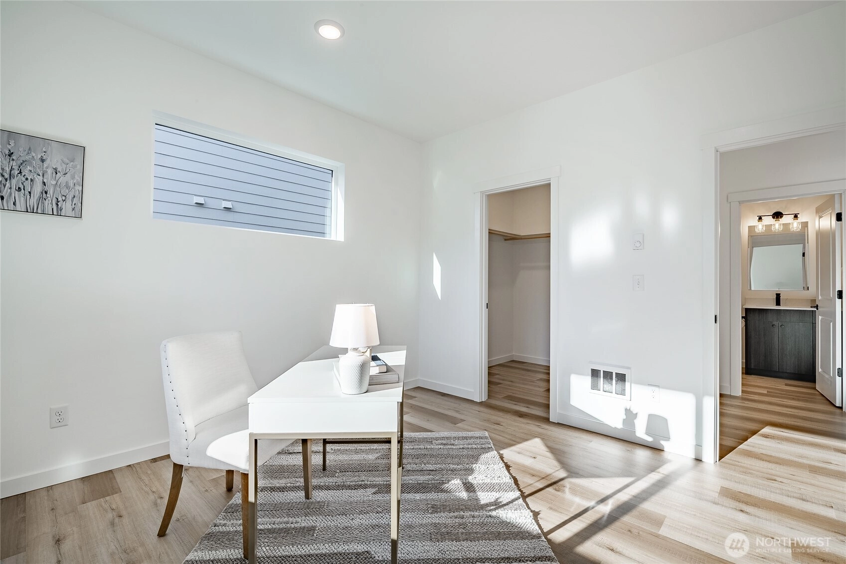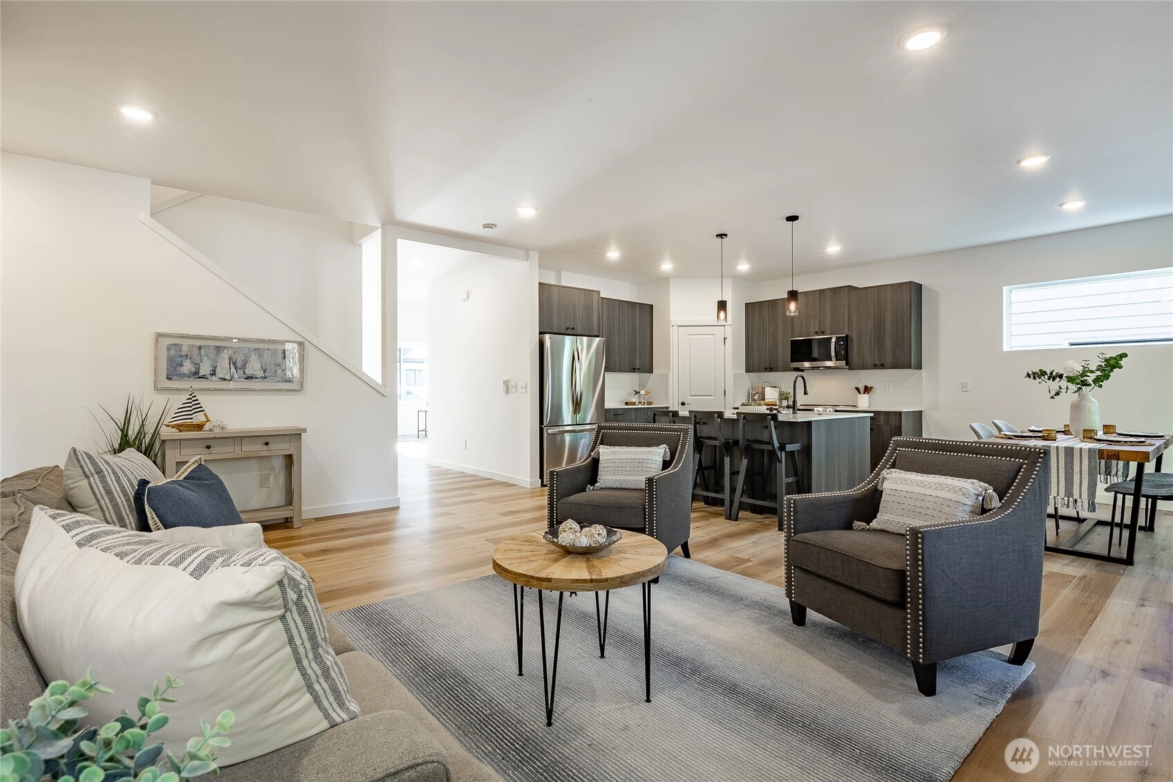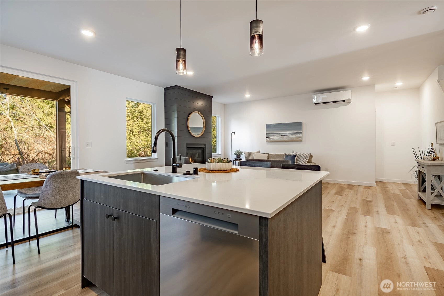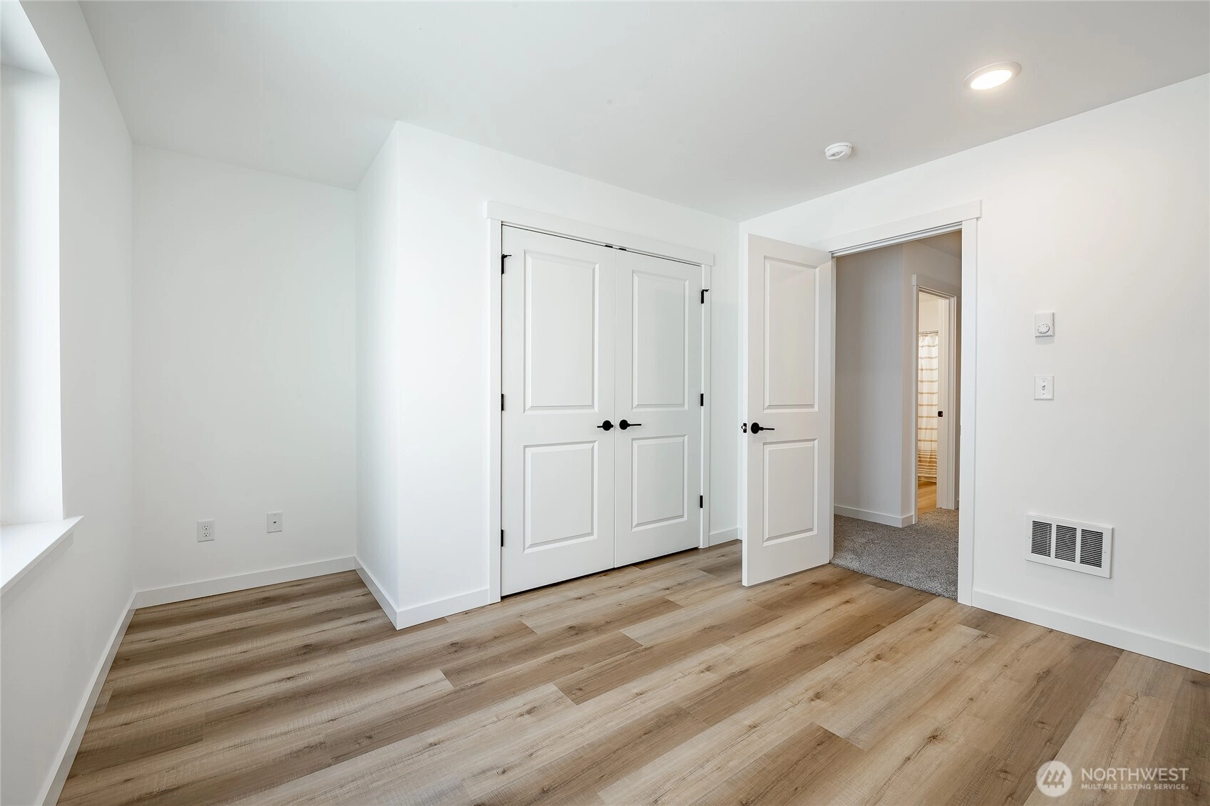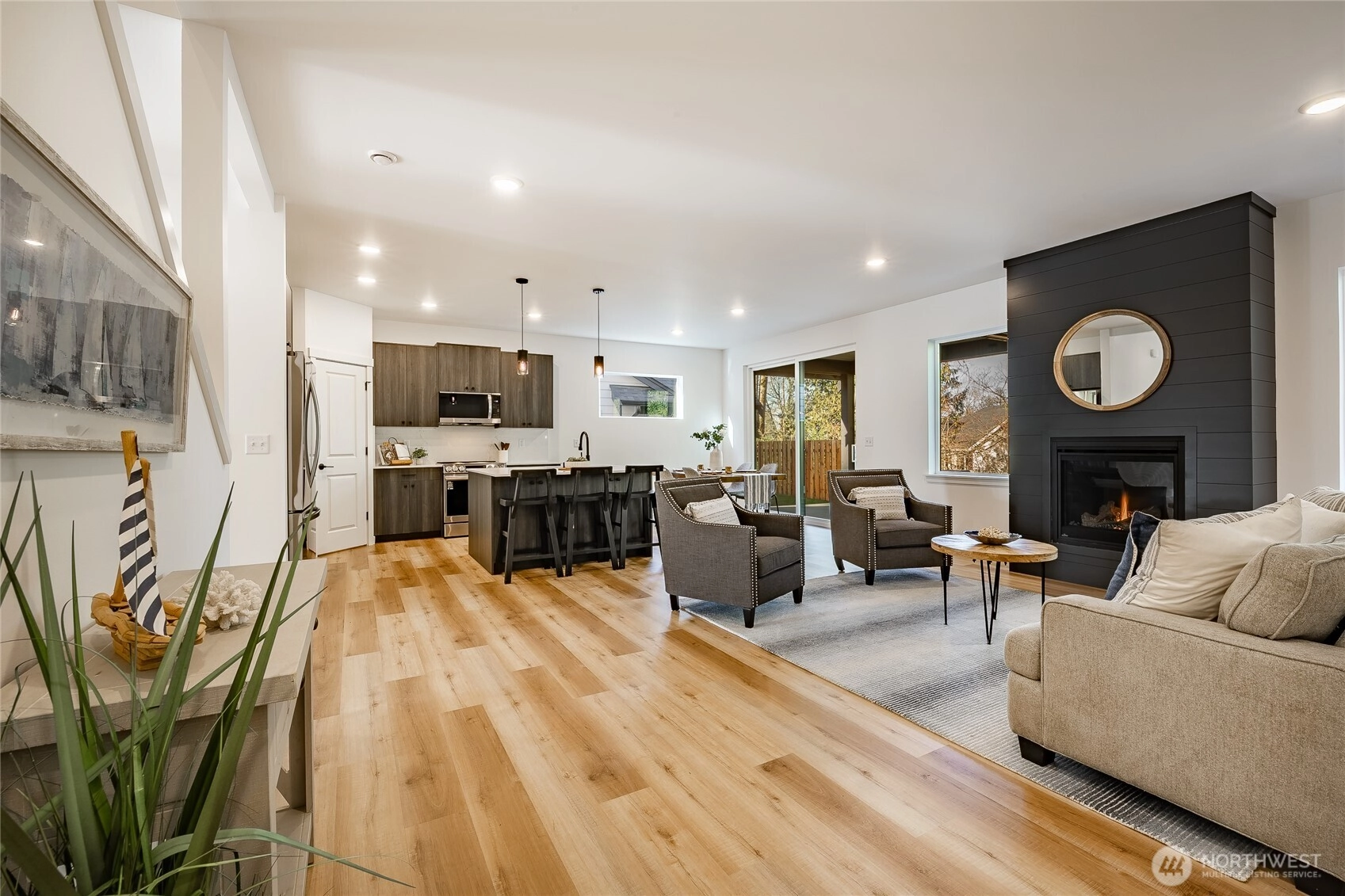 Enjoy effortless cross-border convenience paired with thoughtful design in this Pacific floorplan at The Ridge. Located just minutes from downtown Blaine, I-5, and the border, this home offers flexibility for those who value easy travel, commuting, and connection on both sides. With four bedrooms total, the primary suite is on the main floor and features a large walk-in closet, dual vanity sinks, and a walk-in tile shower. A flex bedroom or office on the main level sits across from a 3/4 bathroom, ideal for guests or everyday living. The open main living space features tall ceilings, a propane gas fireplace, and a functional kitchen with quartz countertops, island seating, and a walk-in pantry. Upstairs, two additional bedrooms share a full bathroom, offering separation and privacy. Covered outdoor living extends your space year-round. Slab-on-grade construction and mini-split heating and cooling via heat pump provide comfort and efficiency. The Ridge offers a peaceful residential setting with close access to amenities, travel routes, and daily essentials. Preferred lender savings include a 1% lender credit plus a $5,000 seller credit from the builder.
