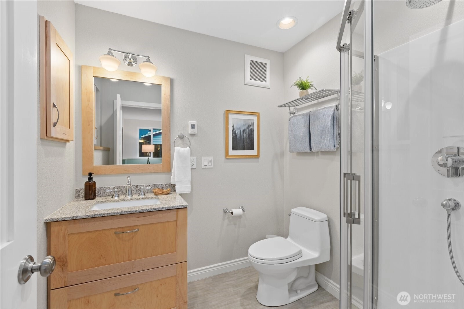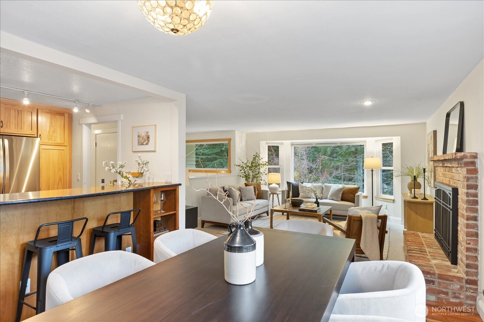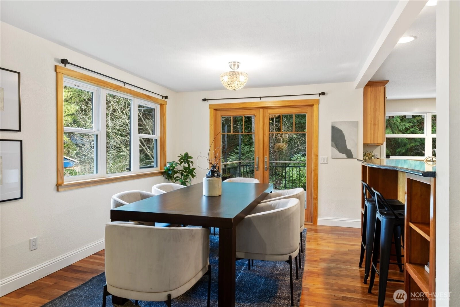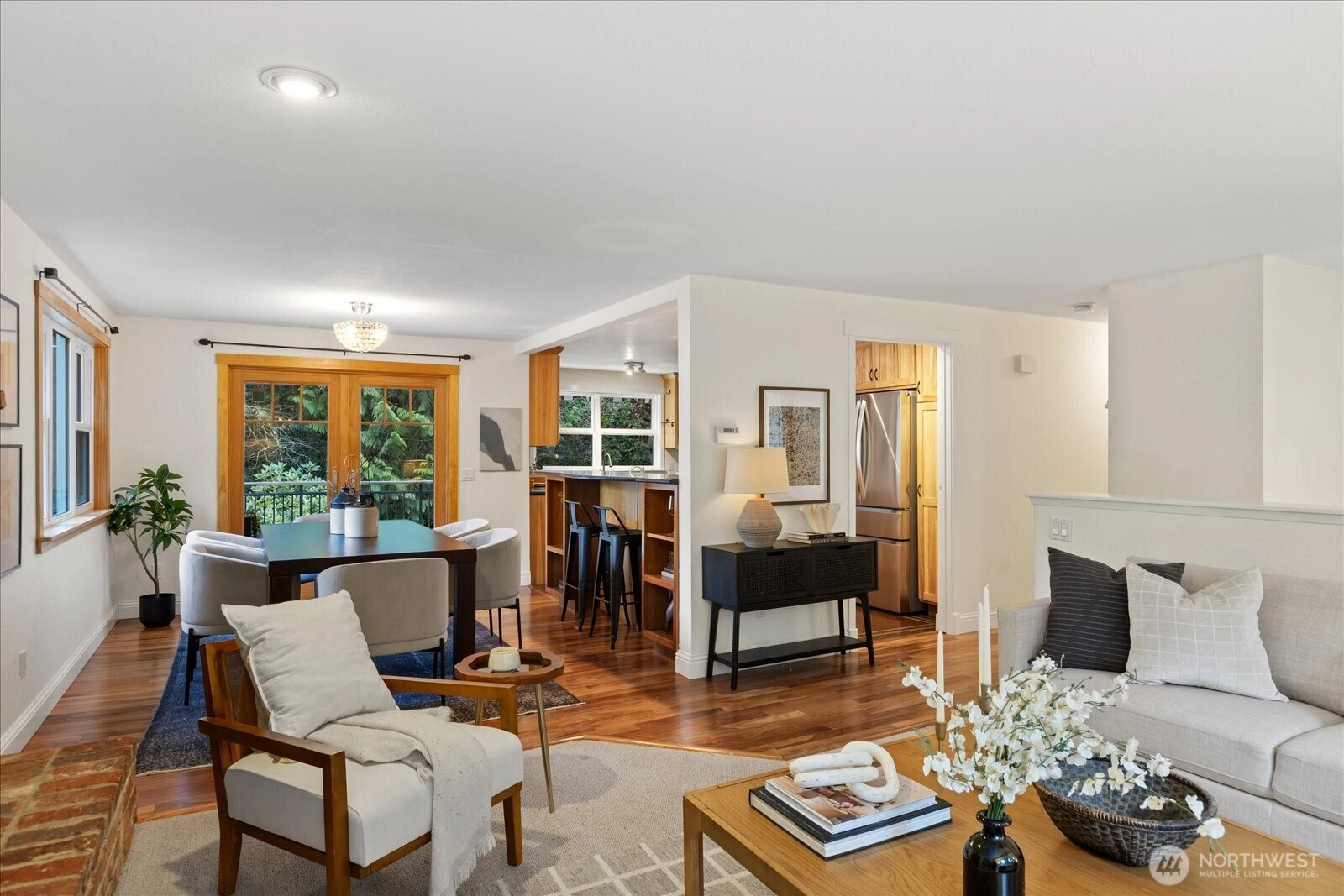 Located in quiet yet convenient Maplewood neighborhood of Edmonds. Set among the trees, this 3 bed home has been meticulously cared for and updated. Large open kitchen features solid wood cabinets and stone counters with picture window at the sink looking to peaceful, private yard. Dining with french doors to newer tiled, oversized deck with gas hookup for grill. Cozy living room with west windows and gas fireplace. 3 beds include an en-suite 3/4 in primary. Downstairs features a large family room with updated 3/4 bath and laundry area. French doors off family room leads to oversized, covered, stone patio for year round outdoor use. Large 2 car garage with plenty of depth for storage features tankless H2O and 240V EV charger-ready. South facing side yard with raised beds. Front and back landscaping with in ground sprinklers. Fully fenced north side yard with deck access, perfect for a dog run. Updated roof(50 year rubber tile), windows, plumbing and electrical. Freshly painted exterior. Across the street from access to Pine Ridge Park trails and pond. Minutes to downtown Edmonds, beaches, ferry, shopping/dining and more!
