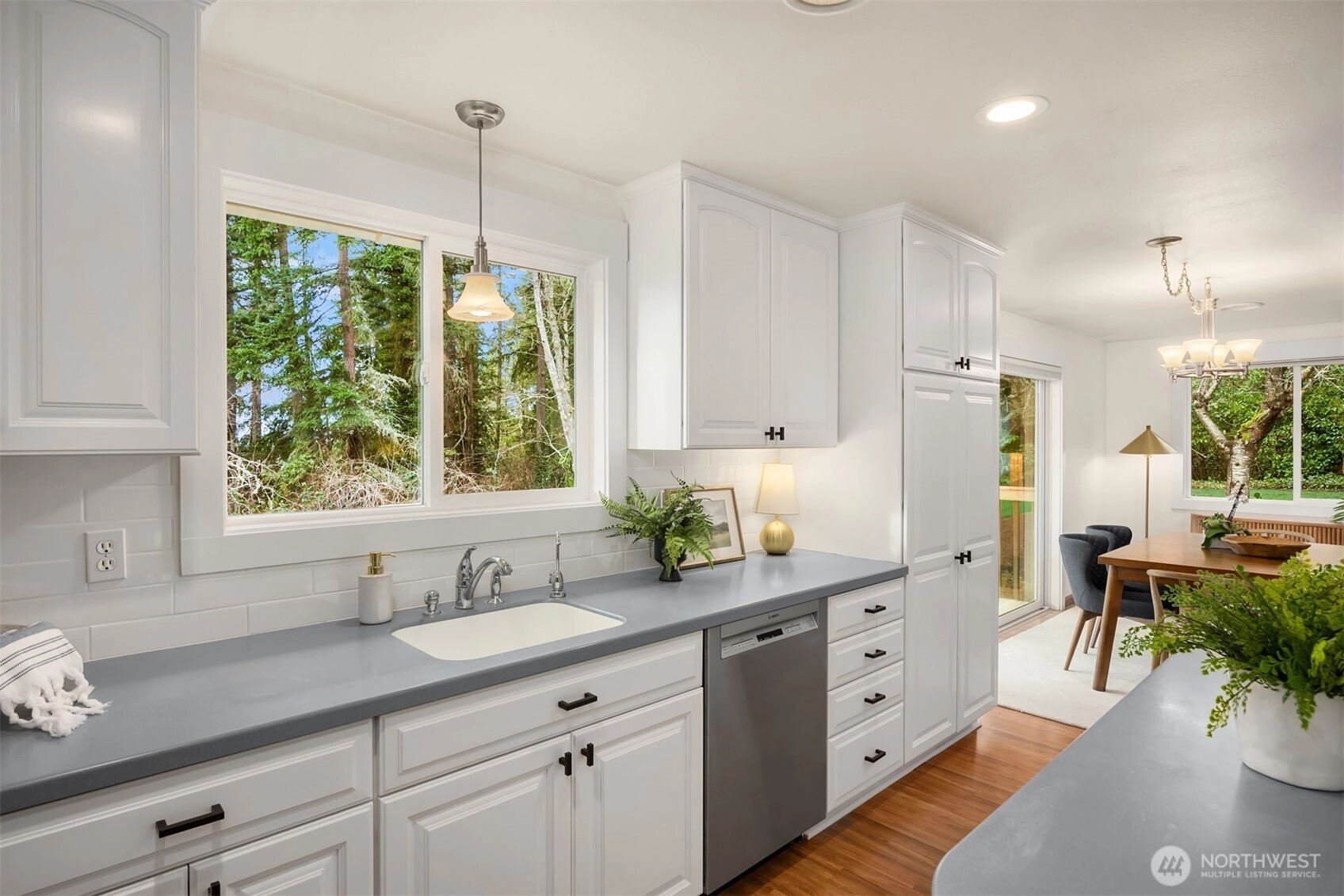 Sweet, sun-filled, and effortlessly charming, this beautifully remodeled home offers exceptional convenience whether you’re heading north toward Poulsbo or south to Winslow and the ferry. Located just minutes from award-winning Xalilc Elementary, the setting blends everyday ease with the calm of island living. Inside, the home has been thoughtfully updated from top to bottom and is truly turnkey. The main level features a light-filled living room and an updated kitchen that flows seamlessly into the great room and out to a sun-drenched deck—perfect for morning coffee before the ferry, summer dinners, and relaxed weekends at home. The spacious primary suite on the main floor includes a walk-in closet and a beautifully remodeled en-suite bath, creating a peaceful retreat. The lower level offers wonderful flexibility with two additional bedrooms, a dedicated office, and a generous bonus room—ideal for guests, hobbies, or work-from-home. Laminate hardwood floors run throughout, complemented by fresh interior paint, new millwork, updated doors and closets, and freshly painted kitchen cabinetry. Both the primary and lower-level bathrooms have been fully remodeled with timeless finishes. Outside, a fully fenced yard with established gardens creates a private, welcoming outdoor retreat. Major updates include a newer metal roof, a new deck, and extensive interior improvements—allowing the next owner to simply move in and enjoy. Stylish, inviting, and easy to love.