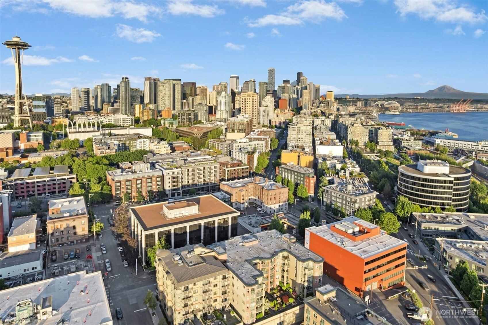 Stunning Elliot Bay and Olympic Mountain views from this bright Selano condo at the nexus of Lower Queen Anne, Belltown, and South Lake Union. Wind down watching ferries glide past Olympic Mountain sunsets from your living area and private deck, then wake up to Elliott Bay views and the iconic PI Globe from your primary bedroom. This condo is refreshingly quiet. Freshly painted with brand-new carpet and sleek engineered hardwoods, this home blends clean design with everyday comfort. The versatile second bedroom is ideal for a home office or guest space, with its own 2nd deck. In-unit washer/dryer, secured garage parking, and private storage add convenience. Pet-friendly, no rental cap, and LOW HOA DUES for the area — this is city living, streamlined.