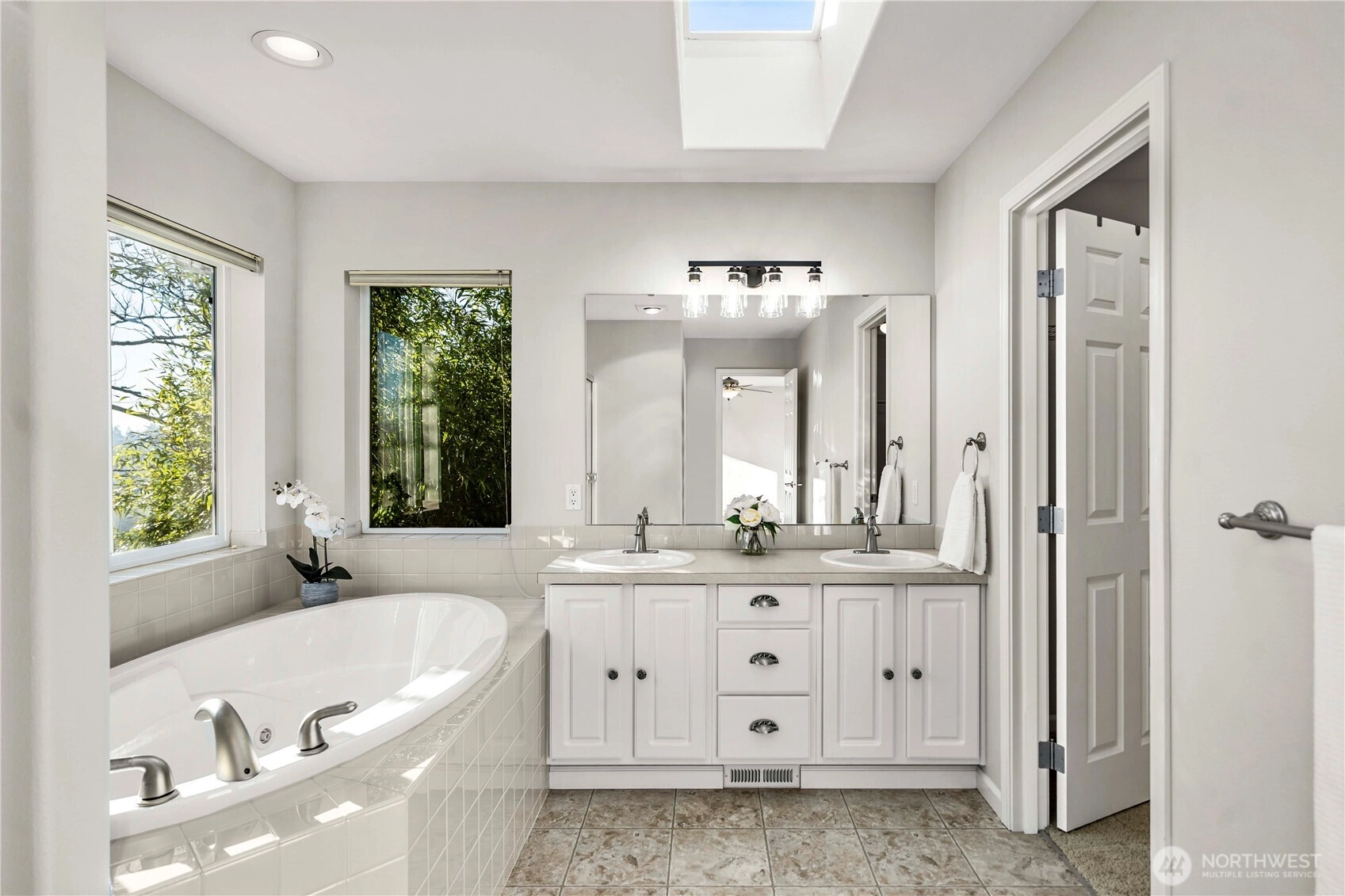 Bath Off Primary Ceiling Fan(s) Double Pane/Storm Window Dining Room Fireplace French Doors Jetted Tub Security System Skylight(s) Sprinkler System Walk-In Closet(s)