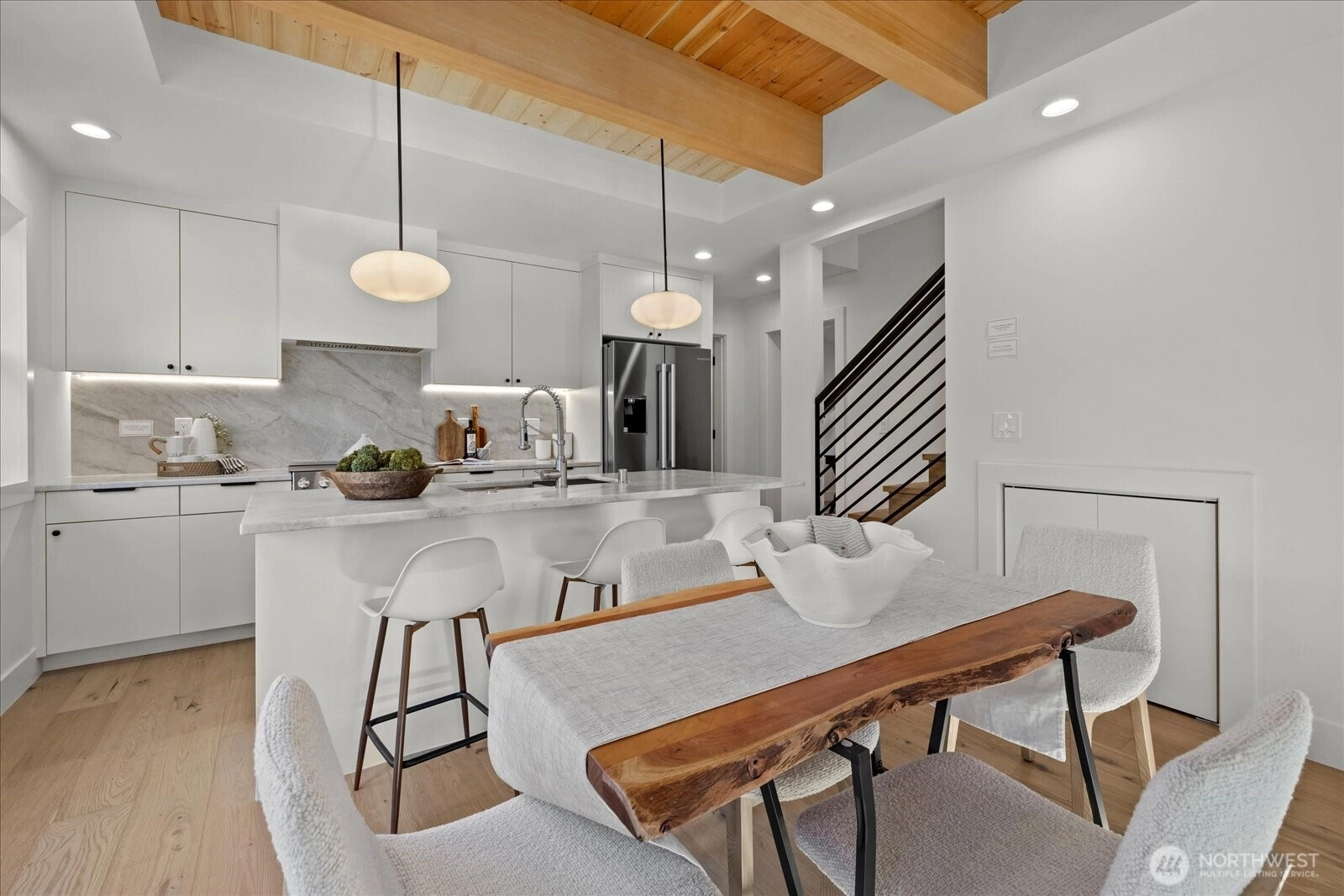 Welcome to your brand-new dream home in Broadview! This two-story, stand-alone residence was just completed, with meticulous attention to design, detail, and natural lighting. The spacious and bright, open-concept living area is perfect for relaxation and entertainment, with a custom exposed-beam ceiling, large kitchen island, and beautiful natural quartzite countertops. The primary suite boasts vaulted ceilings and custom bath with curbless shower and heated floors. Bonus 4th bedroom/dining/office on main floor, with two additional bedrooms upstairs. Oversized and private grassy yard. Just blocks away from eateries and Carkeek Park, with easy access to I-5, 99, light rail, and downtown. Attached garage. Pre-inspected.