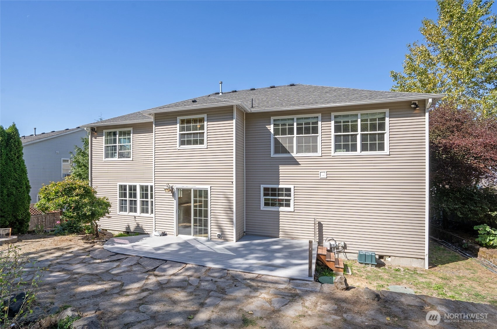 Spacious 3,335 sq ft home on nearly a half-acre backing to a greenbelt. Main level features open living areas, fireplace, formal dining, kitchen with stainless appliances, and huge walk-in pantry. Deck and patio overlook a fully fenced yard. Upstairs offers a large primary suite with walk-in closet, 2 bedrooms, full bath, laundry, 2 extra playrooms, and a 2-car garage plus private wooded area with greenbelt access. Explore the home through the Matterport 3D tour link!