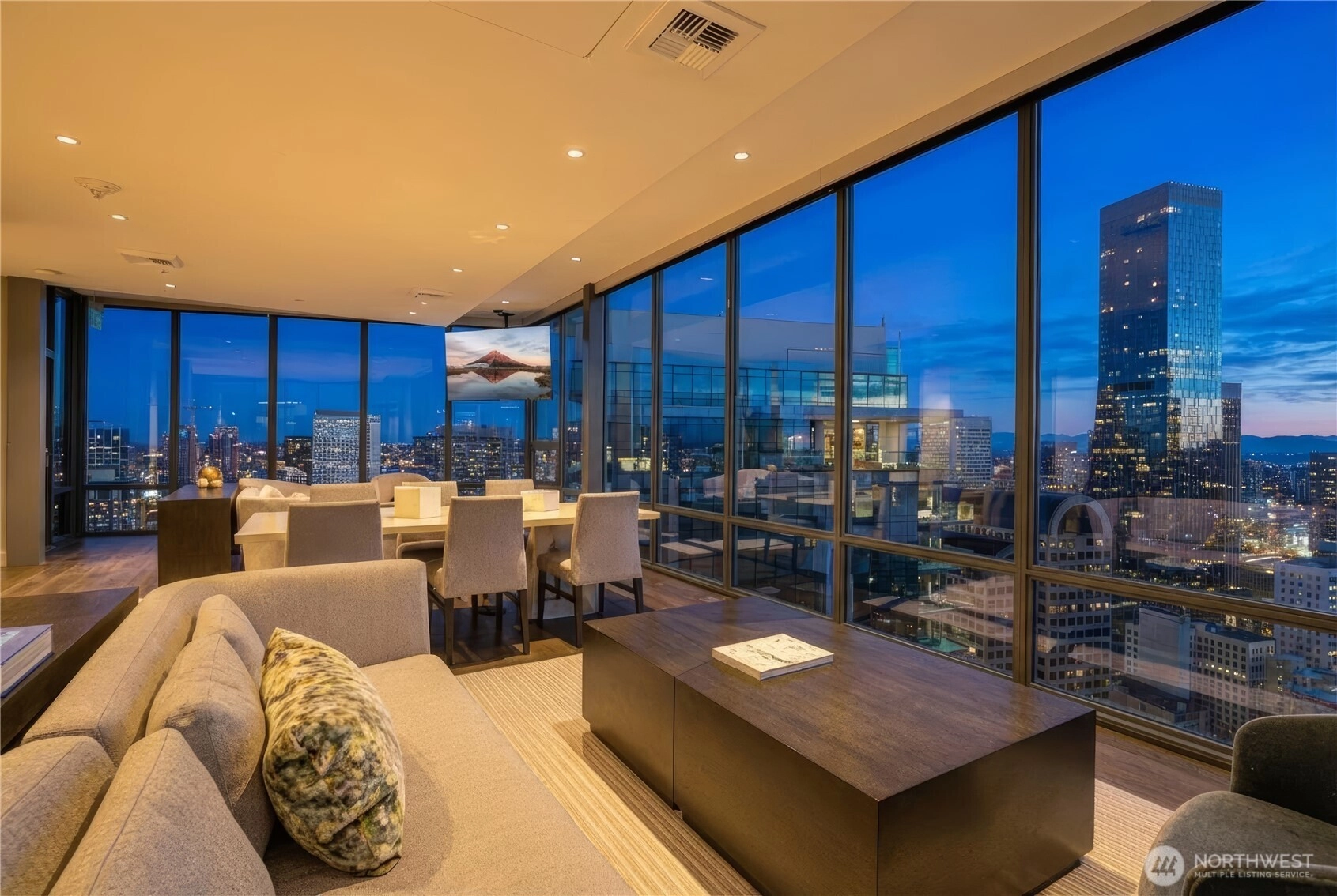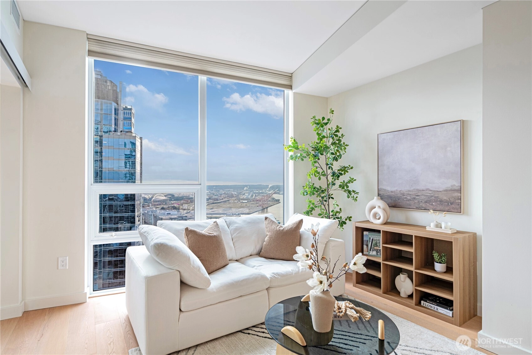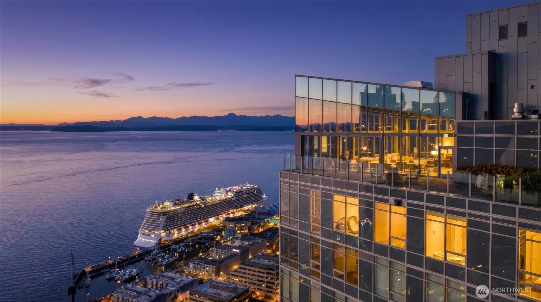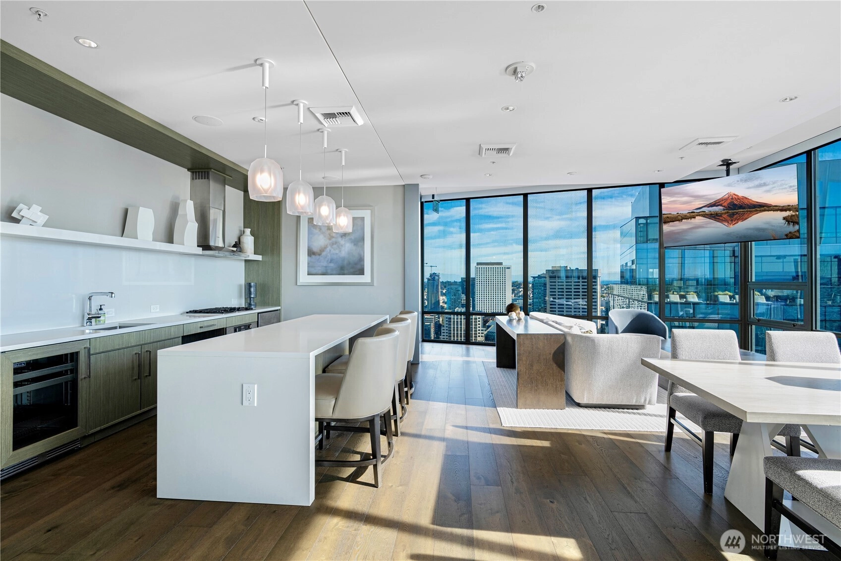 Spacious south-facing 1BD + den featuring high ceilings and floor-to-ceiling windows flooded with natural light, overlooking Pike Place Market, Elliott Bay, the city skyline & Mount Rainier. Thoughtful design includes custom kitchen cabinetry, gas cooktop, hardwood floors, full-size washer/dryer, built-in closet system, motorized shades & Latch keyless entry.First-class amenities: 24/7 concierge, fitness center, yoga studio, pet run & spa, guest suite, and full-floor rooftop with indoor lounge and outdoor spaces featuring city, water & mountain views. Steps to Pike Place and the waterfront—true premier downtown living.