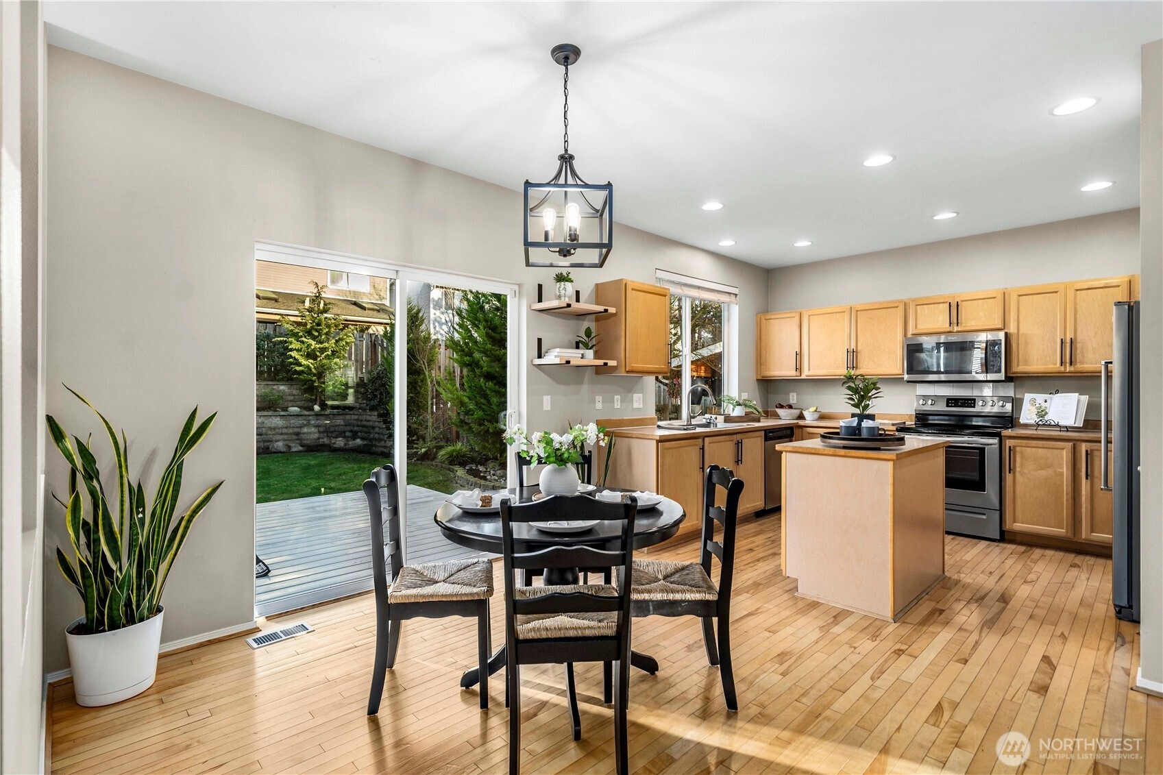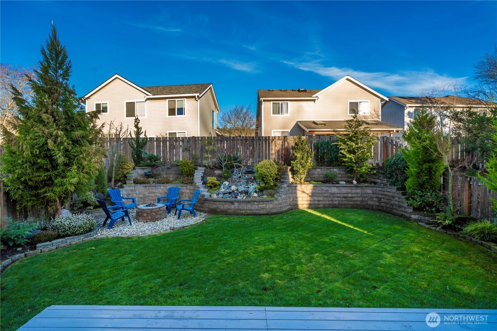 Welcome home to Maple Woods, one of Maple Valley’s most sought after neighborhoods, where convenience meets outdoor beauty, trails, parks, and everyday amenities nearby. Rare lot that faces serene greenspace. A true showstopping backyard, complete with a peaceful waterfall feature and a natural gas firepit. Inside, soaring ceilings elevate the living and dining rooms, creating an airy, welcoming feel. The kitchen flows seamlessly into a warm family room anchored by a cozy gas fireplace, perfect for everyday living and effortless entertaining. Step outside to the deck and take in the park like yard, stunning landscaping, and impressive privacy. Upstairs, enjoy a spacious primary suite with a walk in closet and a five piece bath, plus three additional bedrooms and a convenient laundry room. The large 4th bedroom features wood plank floors, ideal for a bonus room, office, or guest space. A/C and landscape lighting add comfort and charm. Well maintained with newer roof, brand new water heater and HVAC recently maintained. Hardwired CAT5e network infrastructure with bus bar and two routers for fast, reliable connectivity. Enjoy an incredible community with parks and trail access through Henry’s Ridge, award winning schools, and easy access to shopping.