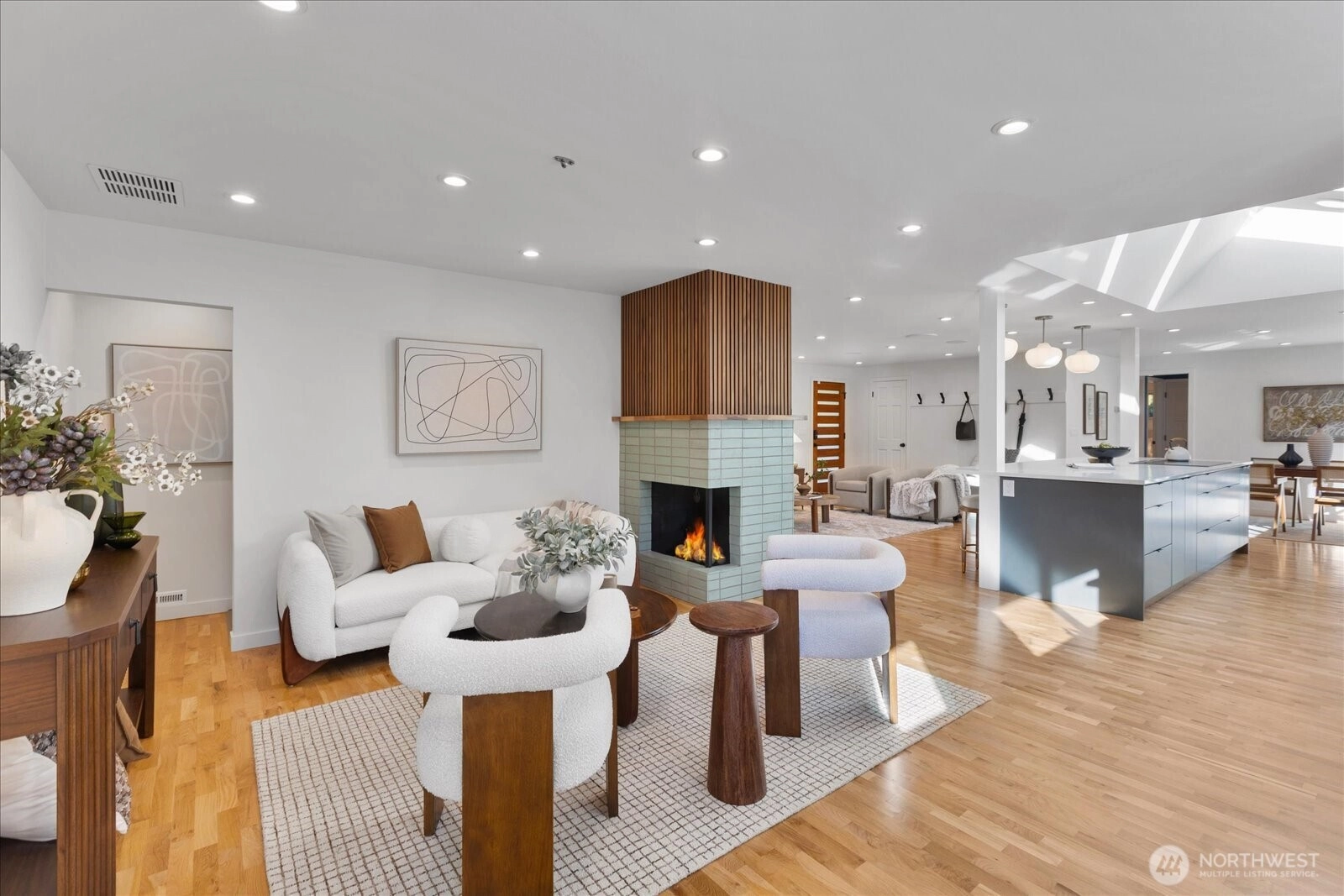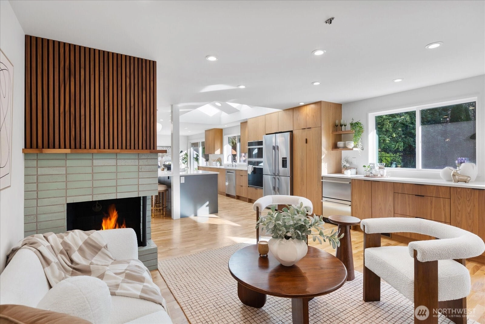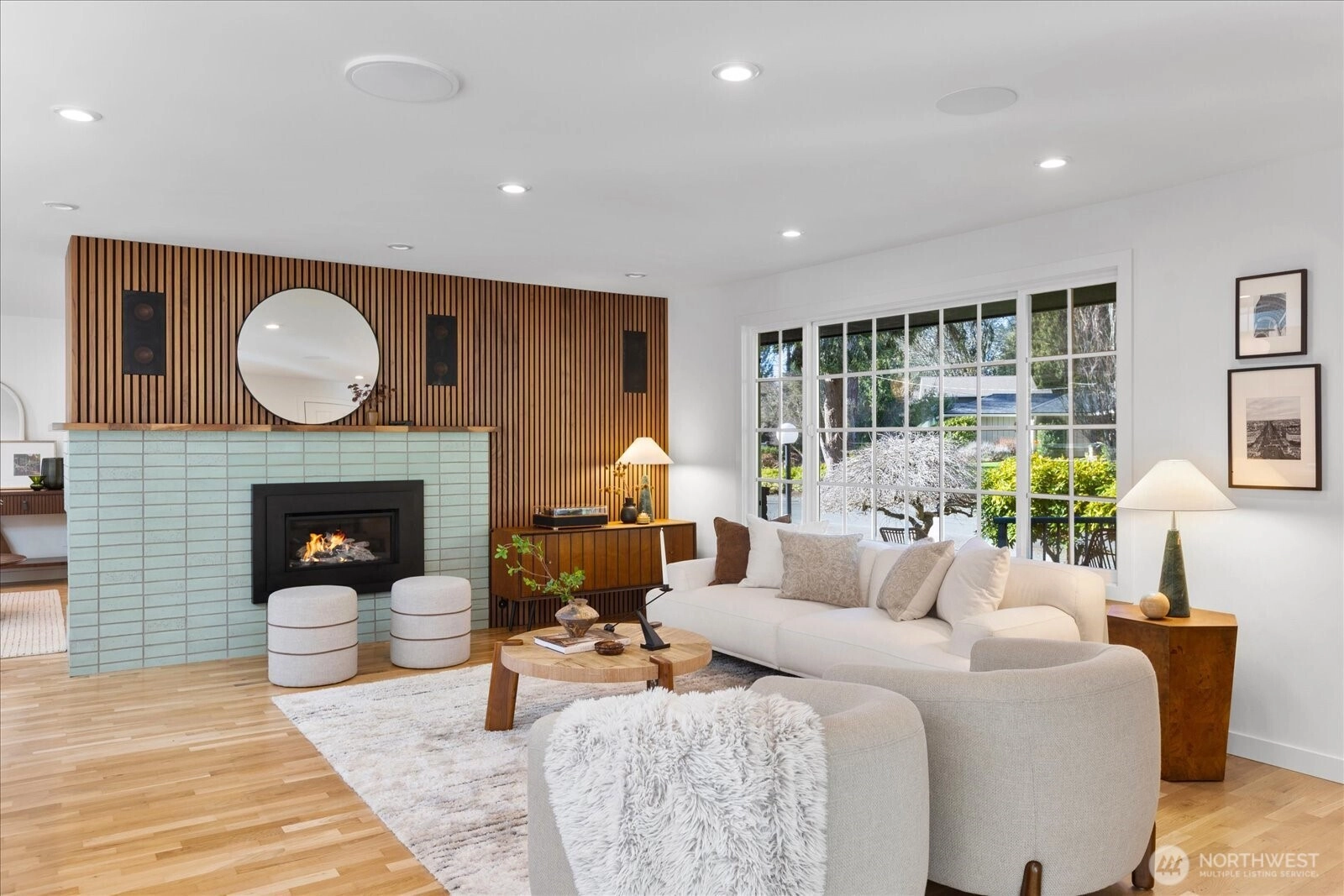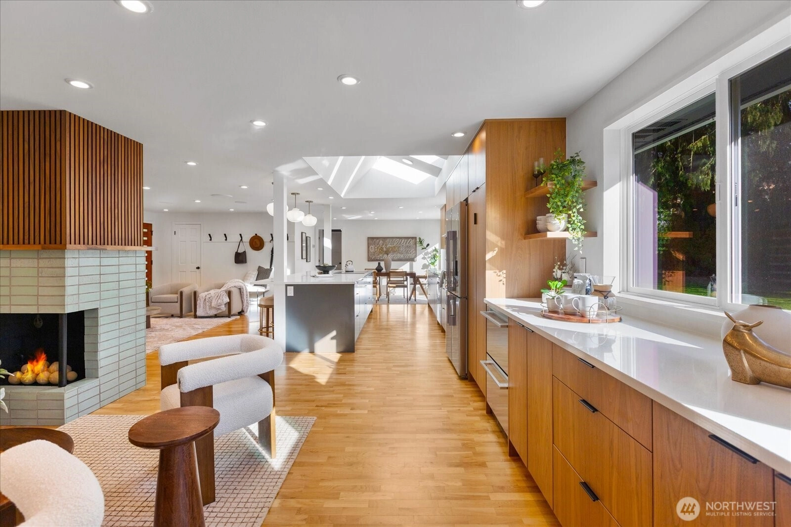 Nestled in Woodway’s coveted Twin Maples neighborhood, this exquisitely remodeled home elevates one-level living with timeless design and refined craftsmanship throughout. High-end upgrades and curated designer finishes create a home that feels both luxurious and inviting. Expansive windows and skylights fill the interiors with natural light, highlighting a showstopping open-concept kitchen with a statement island, PNW-crafted custom walnut cabinetry, and premium, top-tier appliances. Two living spaces offer both gas and wood-burning fireplaces, beautifully framed by handcrafted tile, acoustic walnut paneling, and a custom surround sound system—perfect for elevated entertaining or peaceful evenings at home. Outdoors, discover a private garden retreat complete with a tranquil water feature and a fully insulated, climate-controlled studio ideal for a home office, wellness space, or creative escape. Major systems have been thoughtfully updated for peace of mind, including roof, electrical, paint, septic system, and heat pump/furnace. EV charger ready, 2 car garage, plus ample off-street parking.