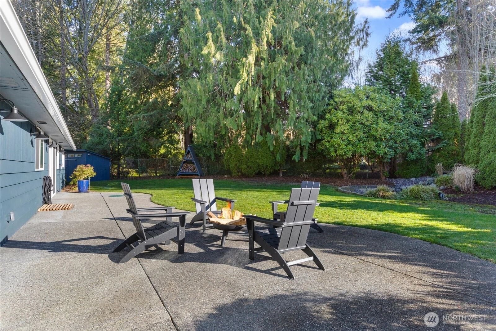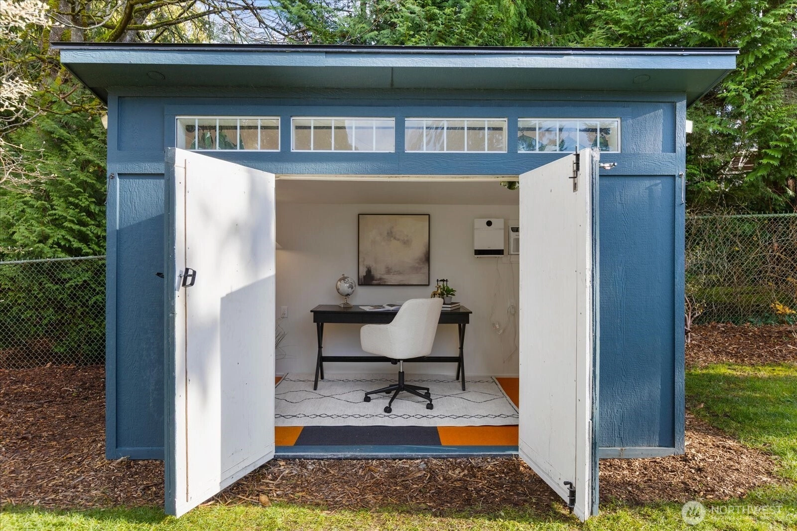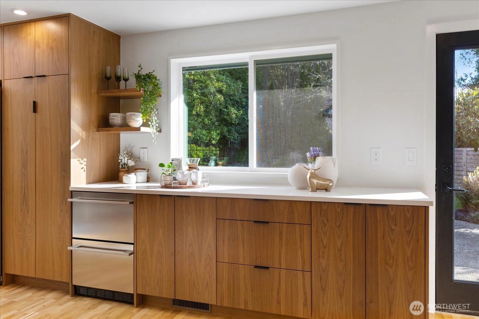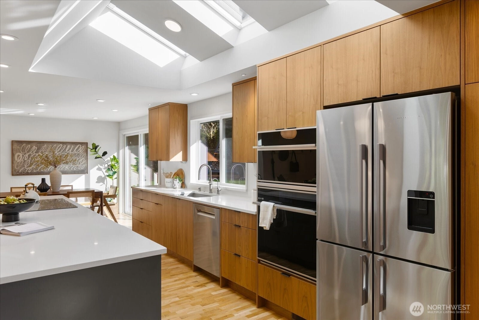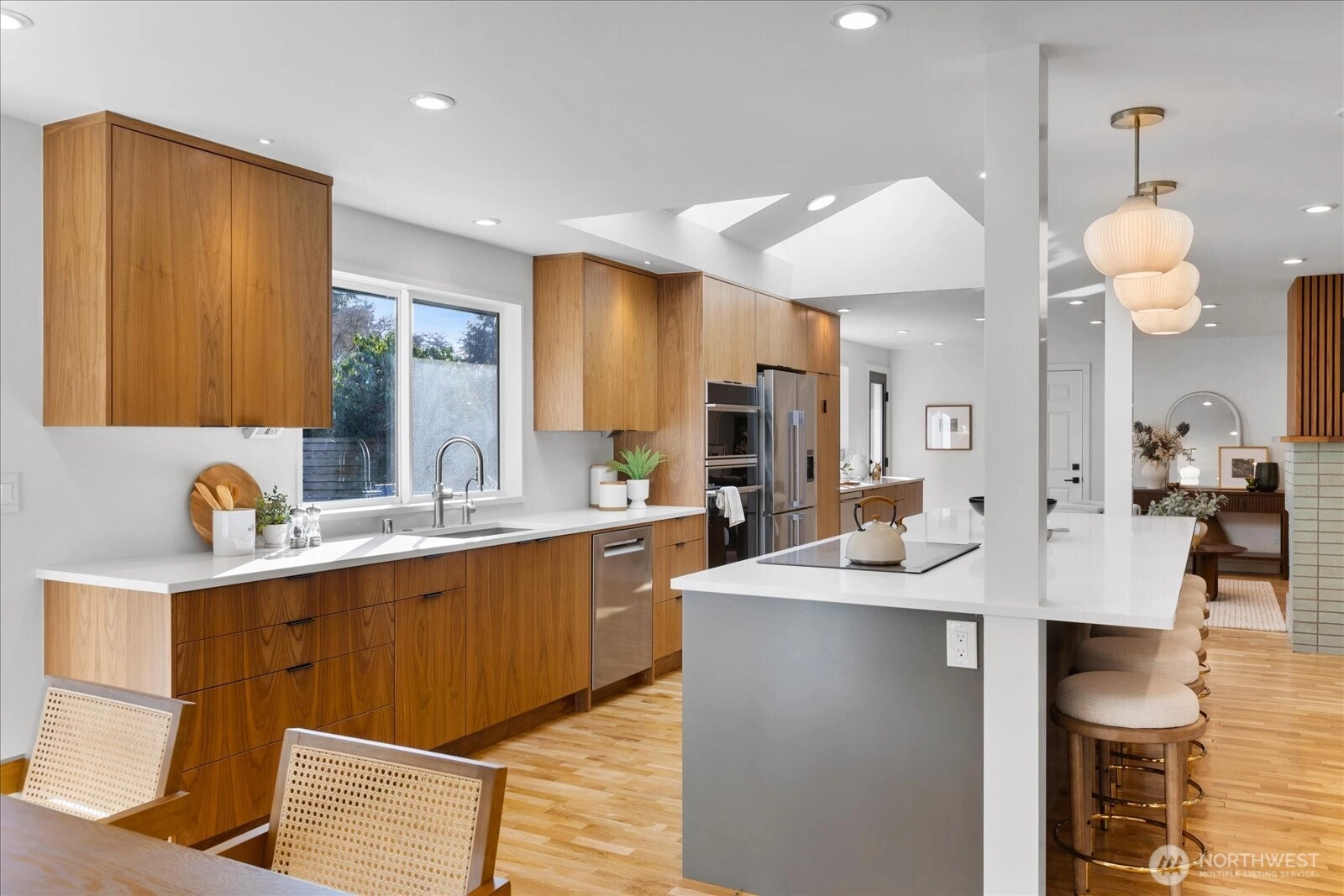 Nestled in Woodway’s coveted Twin Maples neighborhood, this exquisitely remodeled home elevates one-level living with timeless design and refined craftsmanship throughout. High-end upgrades and curated designer finishes create a home that feels both luxurious and inviting. Expansive windows and skylights fill the interiors with natural light, highlighting a showstopping open-concept kitchen with a statement island, PNW-crafted custom walnut cabinetry, and premium, top-tier appliances. Two living spaces offer both gas and wood-burning fireplaces, beautifully framed by handcrafted tile, acoustic walnut paneling, and a custom surround sound system—perfect for elevated entertaining or peaceful evenings at home. Outdoors, discover a private garden retreat complete with a tranquil water feature and a fully insulated, climate-controlled studio ideal for a home office, wellness space, or creative escape. Major systems have been thoughtfully updated for peace of mind, including roof, electrical, paint, septic system, and heat pump/furnace. EV charger ready, 2 car garage, plus ample off-street parking.