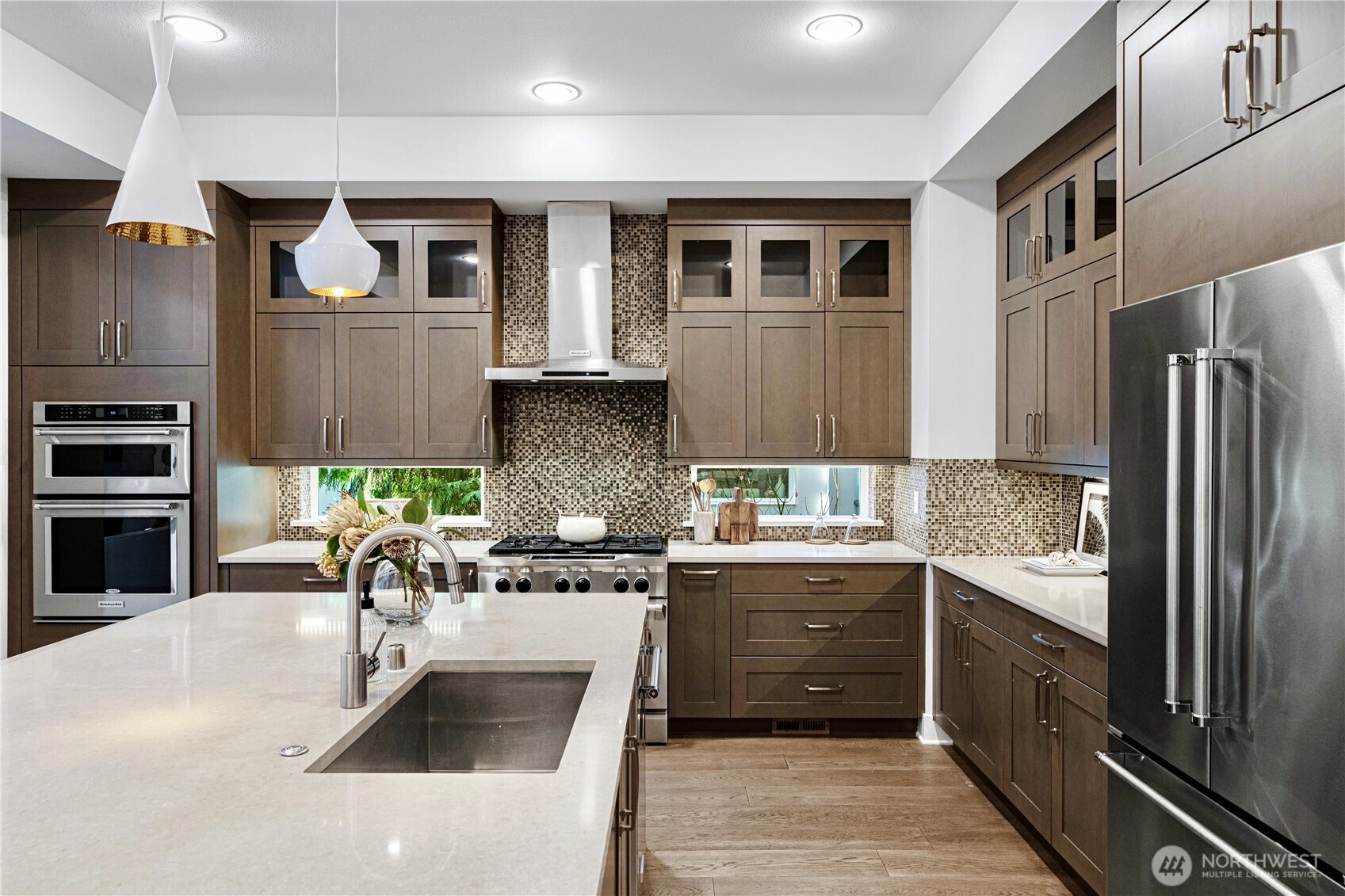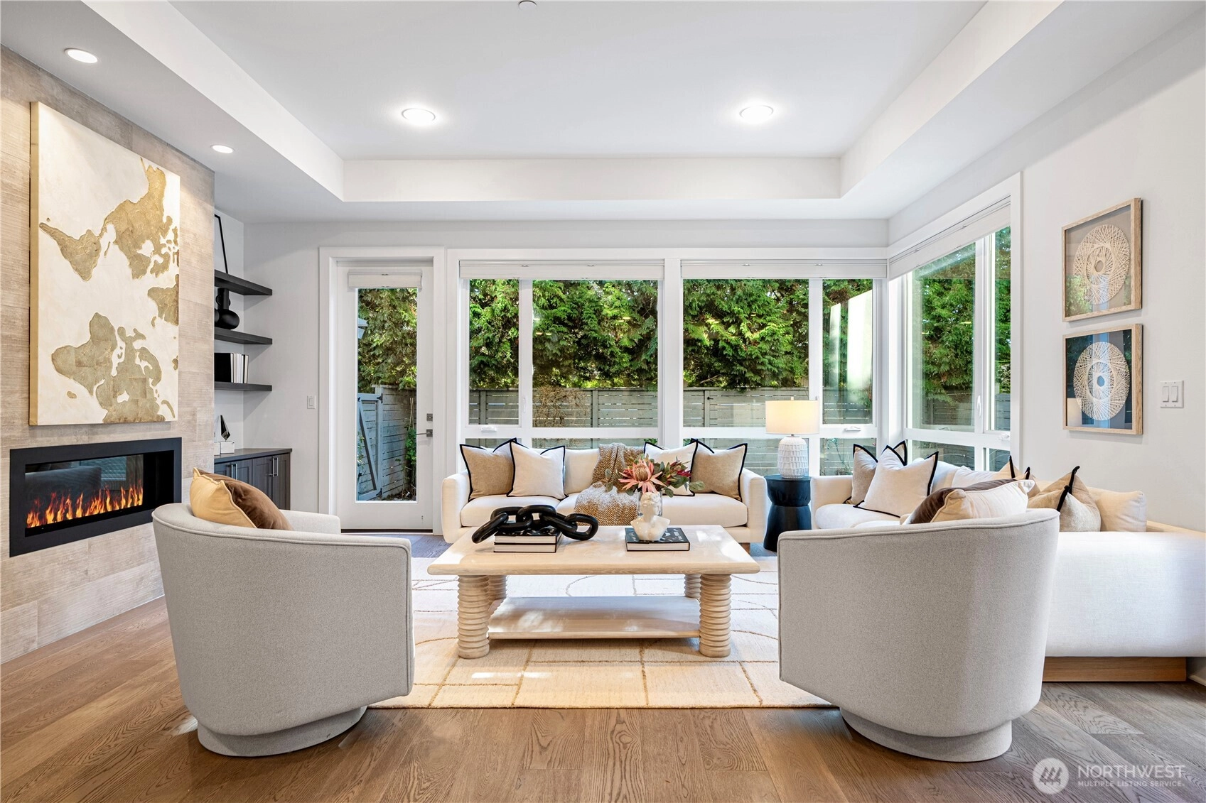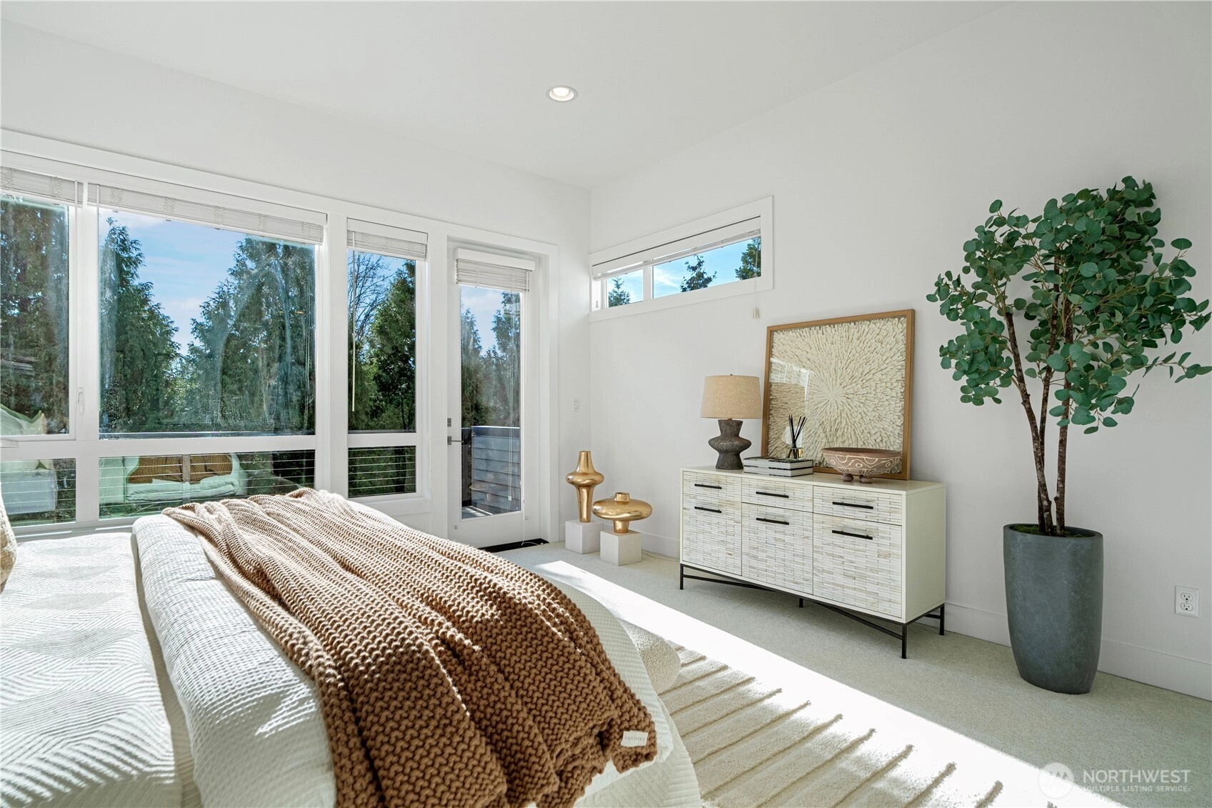 Like-new contemporary end-unit luxury townhouse built in 2016, offering 5 beds, 4 baths, 3,068 sqft, ideally located in downtown Kirkland. Walk to the beach, waterfront parks, dining, and Google campus. Filled with natural lights, featuring high ceilings, expansive windows, and open-concept living. Chef’s kitchen with gas range, and large island. Flexible layout includes lower-level bonus room and guest bedroom, plus a main-level bedroom with shower. Upstairs offers a luxury primary suite with oversized spa-style shower and private balcony, plus two additional bedrooms. Enjoy two balconies, a private fully fenced backyard, and a spacious 2-car garage. A/C, designer lights, newer interior paint and more. Modern living at its finest.