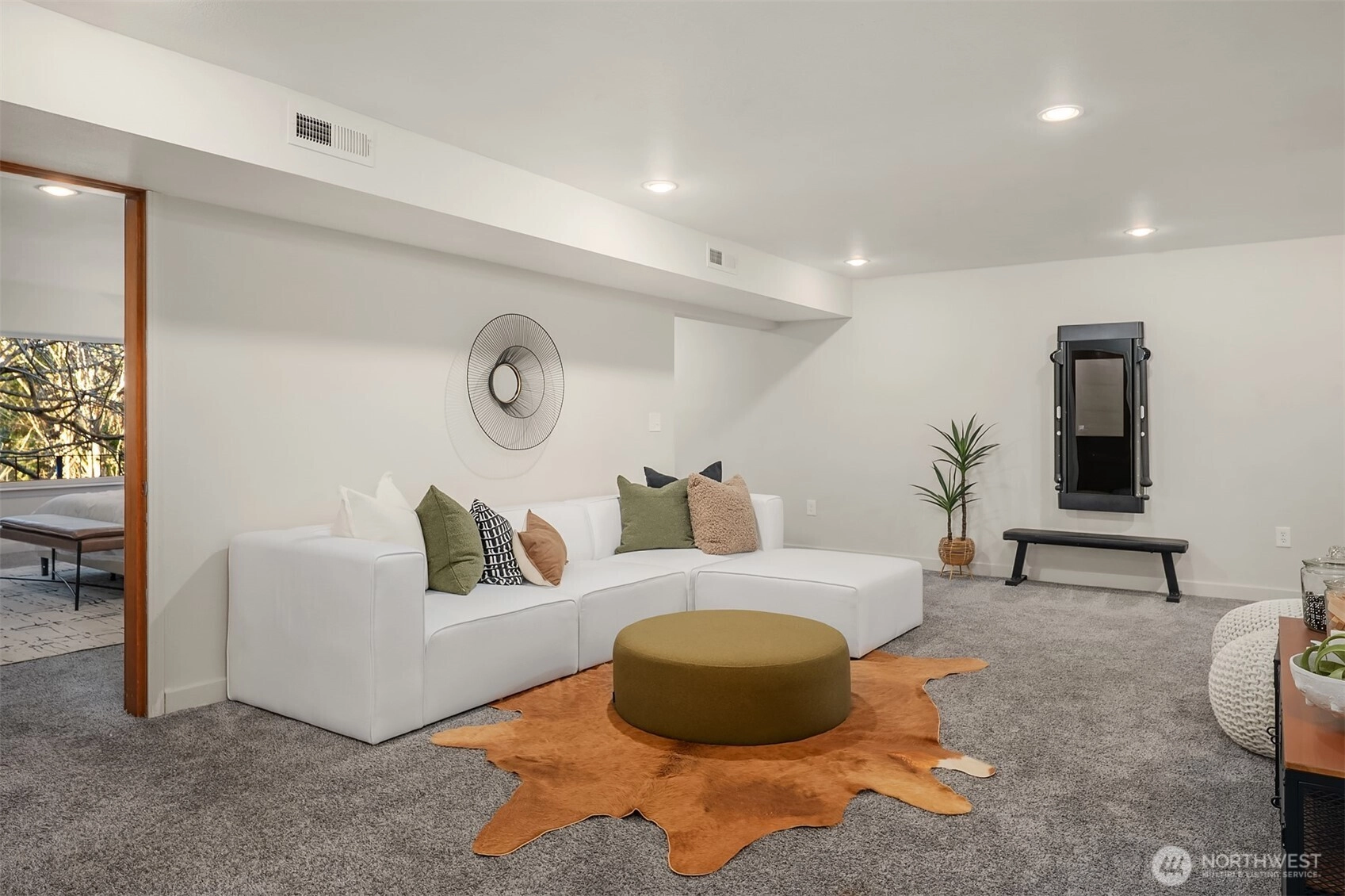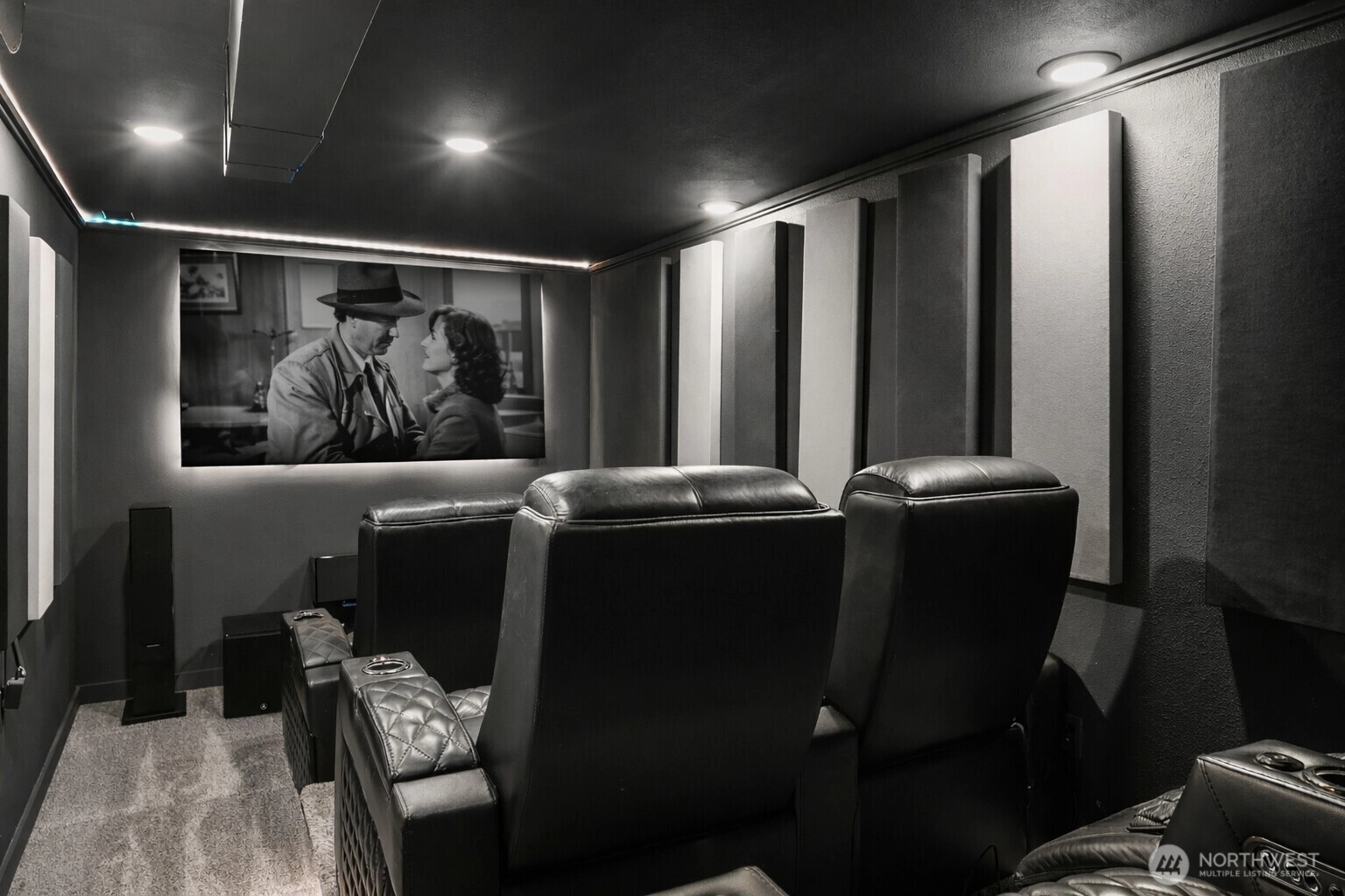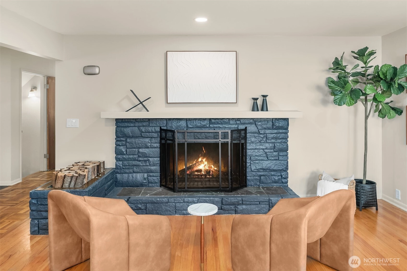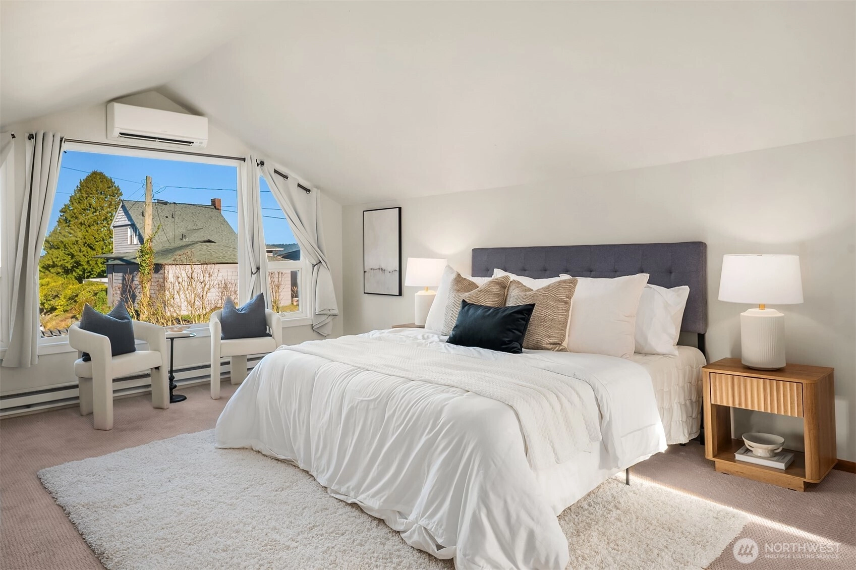 Tucked at the end of a peaceful dead-end street in coveted North Beach, this spacious 5 bedroom 2.5 bathroom captivating midcentury home feels like a private sanctuary in the city. Surrounded by trees and backing to a beautiful greenbelt, it's the private deck and large patio with pergola are a retreat where birdsong greets you each morning. Inside, nearly 3,840 sq ft a warm, welcoming and updated space unfolds - complete with original Herman Miller lighting, oak hardwood floors, tile floors, large picture windows, a gourmet granite kitchen with stainless steel appliances and granite countertops, new carpet, new interior paint and a dreamy top-floor primary suite with Puget Sound views. Thoughtful updates include a new roof, whole-house AC, earthquake retrofitting, and even a secret custom home theater by Definitive Audio. A rare blend of character, comfort, and quiet in the desirable North Beach community. This one’s a true gem.