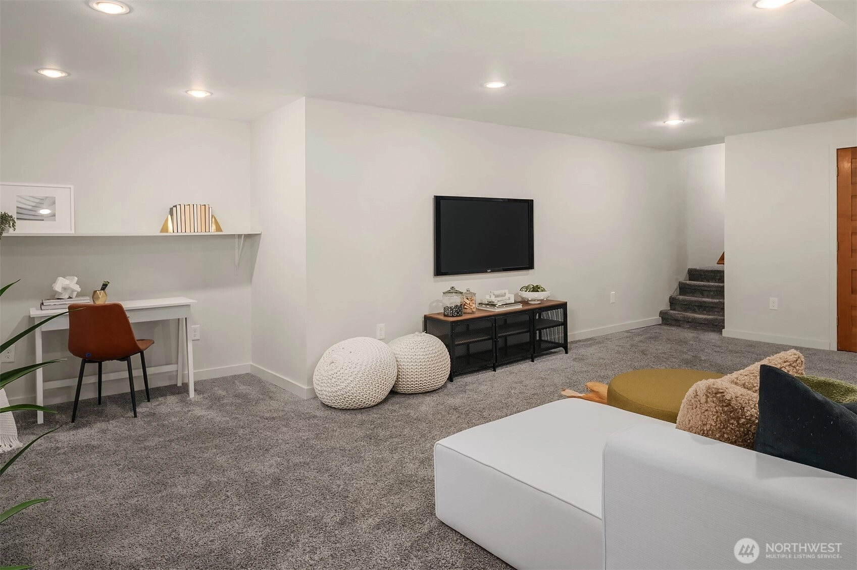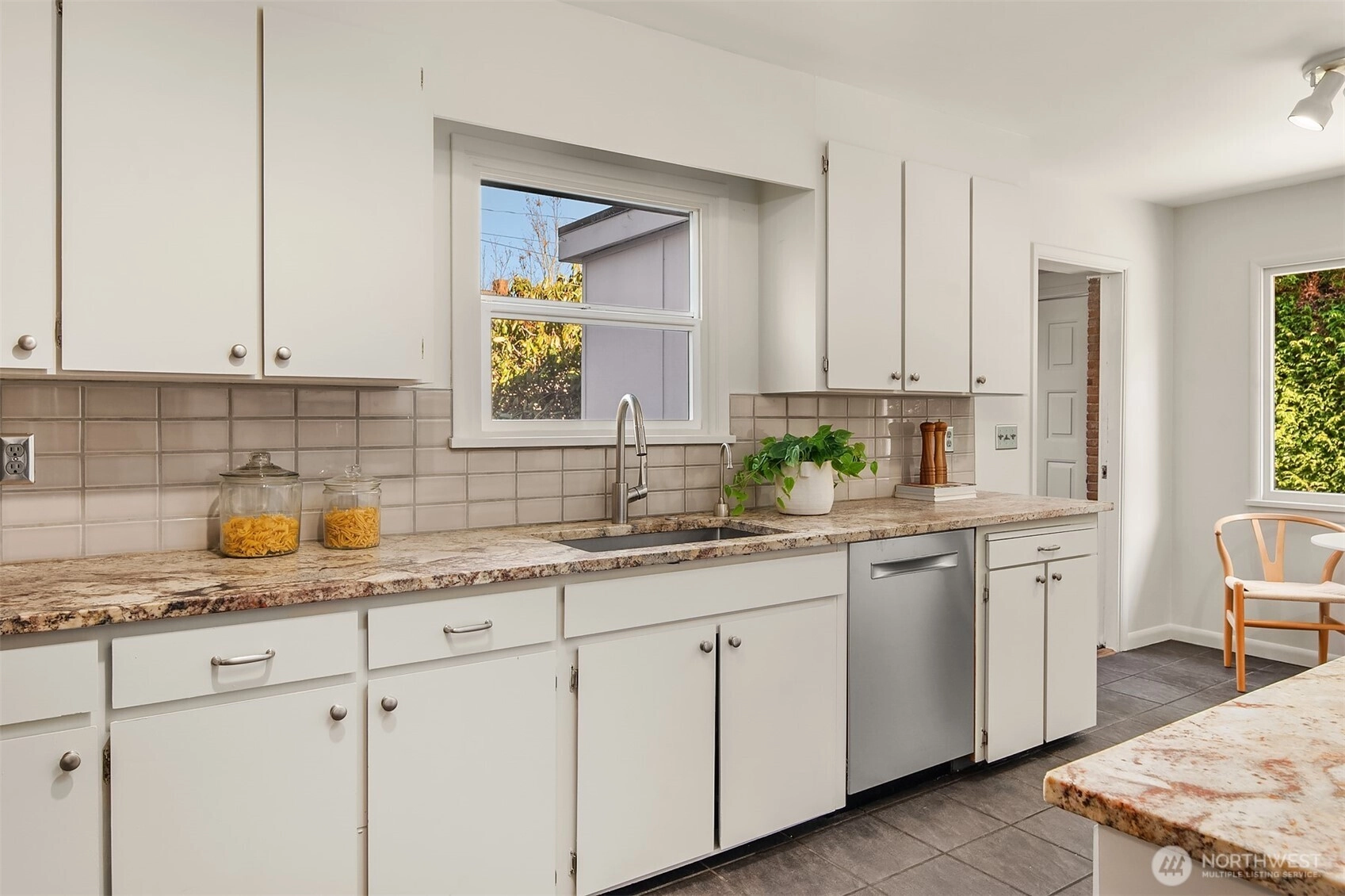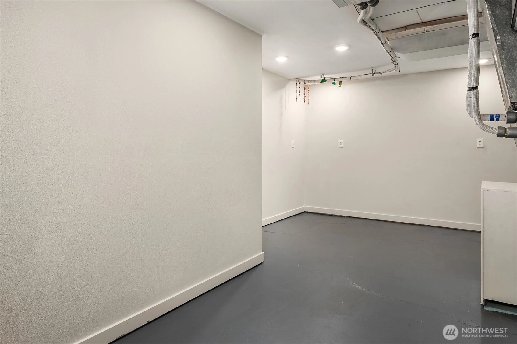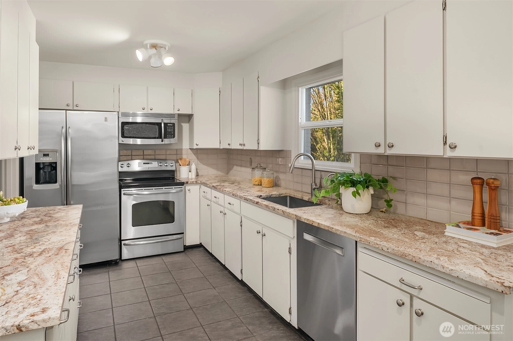 Tucked at the end of a peaceful dead-end street in coveted North Beach, this spacious 5 bedroom 2.5 bathroom captivating midcentury home feels like a private sanctuary in the city. Surrounded by trees and backing to a beautiful greenbelt, it's the private deck and large patio with pergola are a retreat where birdsong greets you each morning. Inside, nearly 3,840 sq ft a warm, welcoming and updated space unfolds - complete with original Herman Miller lighting, oak hardwood floors, tile floors, large picture windows, a gourmet granite kitchen with stainless steel appliances and granite countertops, new carpet, new interior paint and a dreamy top-floor primary suite with Puget Sound views. Thoughtful updates include a new roof, whole-house AC, earthquake retrofitting, and even a secret custom home theater by Definitive Audio. A rare blend of character, comfort, and quiet in the desirable North Beach community. This one’s a true gem.