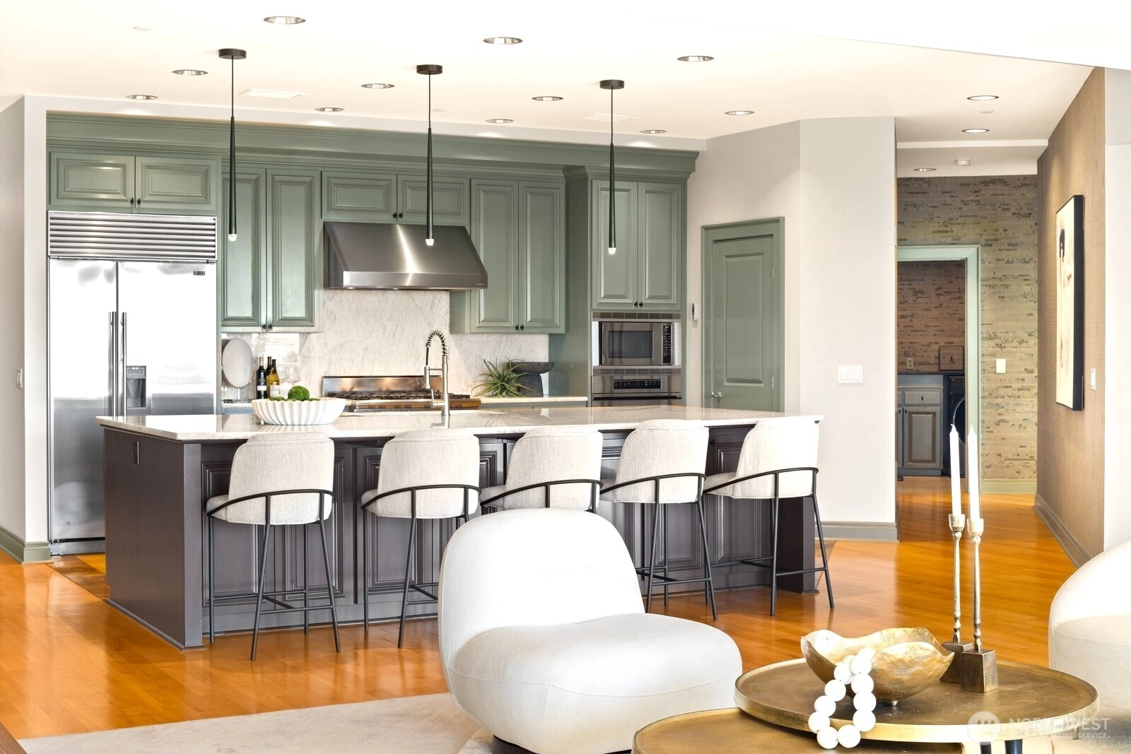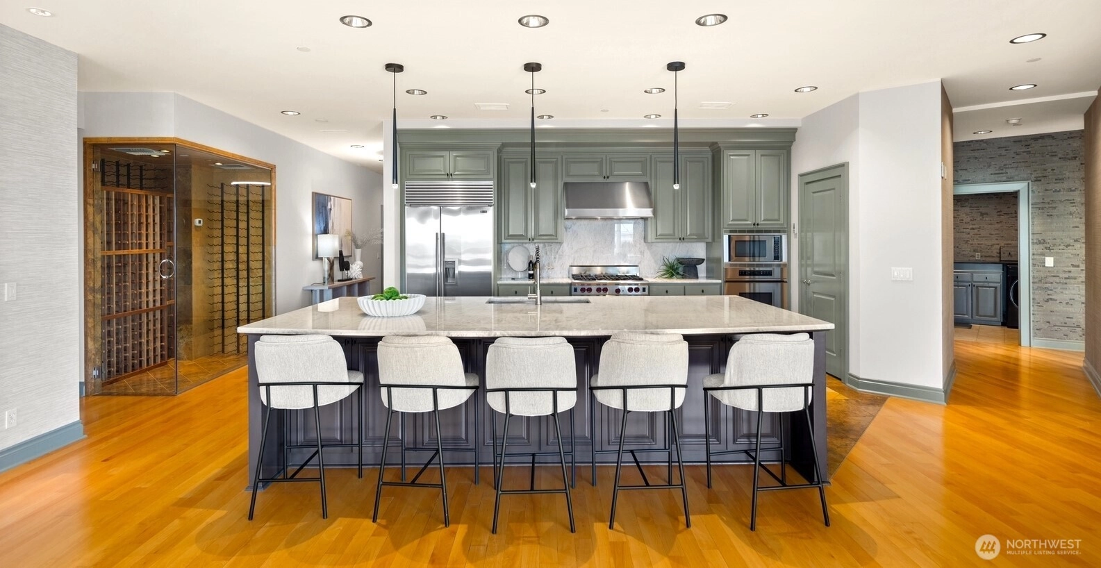 Luxury Live Auction! Bidding to start from $1,200,000.00! Where updated elegance meets timeless sophistication. A brand new color palette, designer wallpaper, and entrance chandelier. Step off your private elevator into softly illuminated interiors with curated finishes. The chef’s kitchen, anchored by an oversized quartzite island with premium appliances, walk-in pantry, and clever storage. Savor a vintage from the 240-bottle wine vault as city lights shimmer from your private terrace. A private guest suite with en/suite full bath and adaptable flex den are perfect for extended stays. Three garages, abundant storage, and sweeping city views complete this space—more than a view, it’s the experience of living minutes from Seattle Center, waterfront parks, and shops.NO RENTAL CAP! Motivated Seller!