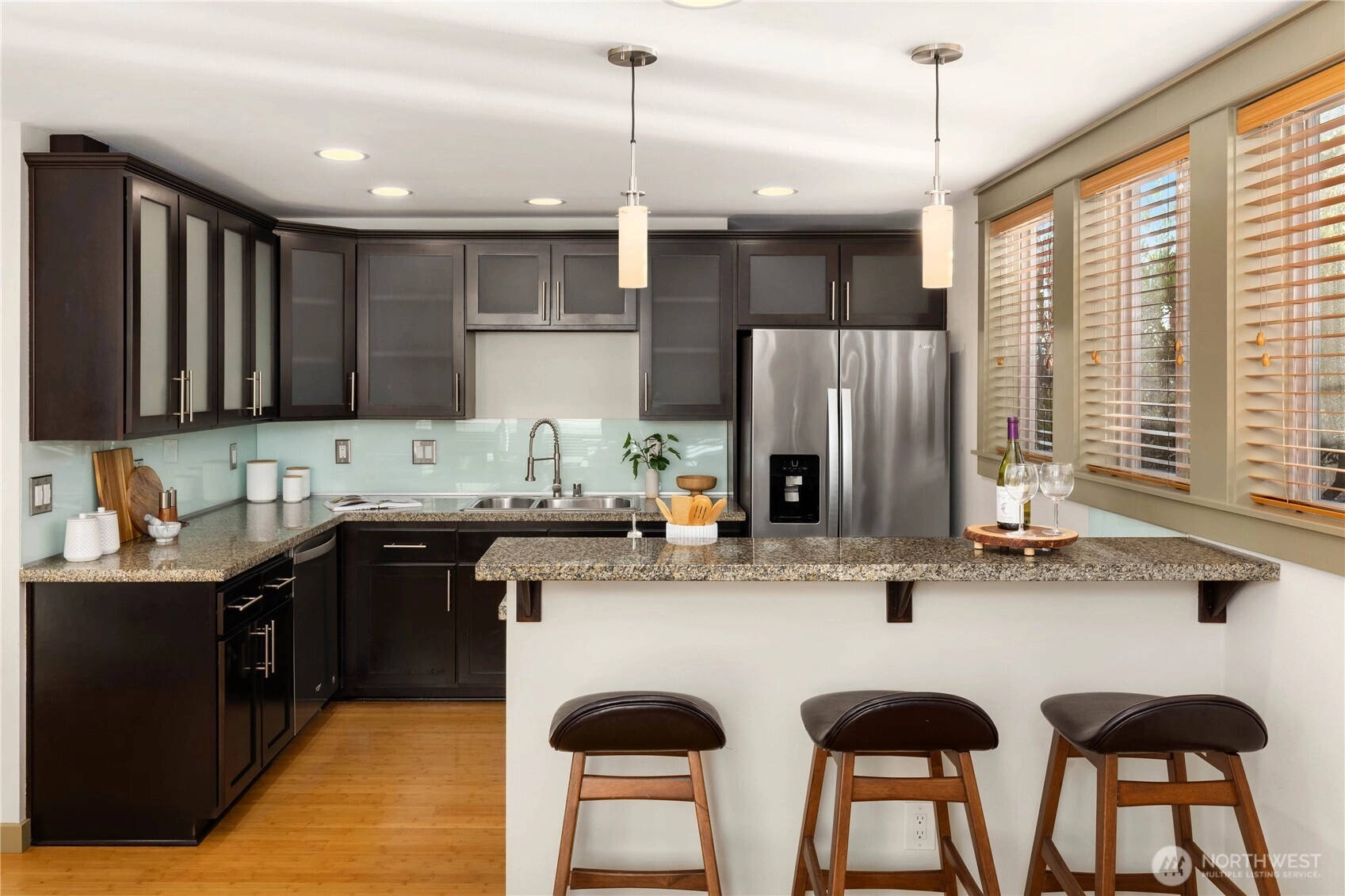 Jubilant energy from this end unit townhome in Wallingford. Truly connected location to enjoy the Burke Gilman trails, Lake Union, Gasworks Park or the multitude of restaurants and places to immerse oneself in the neighborhood vibrancy. Inside 3 bedrooms, 3 baths, vaulted ceilings and southern light flood the home. Kitchen detailed in slab granite and stainless appliances, including a gas range which is open to the nook and family room. Upstairs laundry. Gas fired radiant heat in the upstairs bedrooms along with A/C throughout. Attached one car garage and a fenced yard with turf to stretch out and relax. No HOA-Come explore!