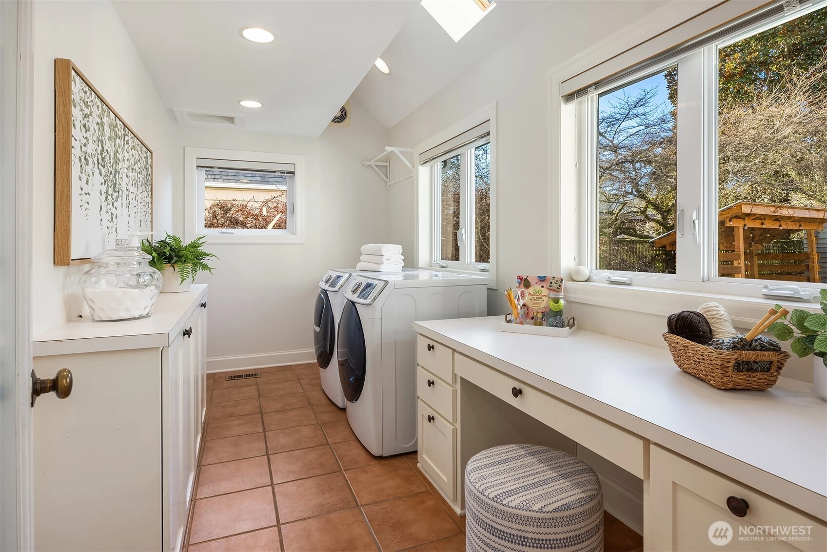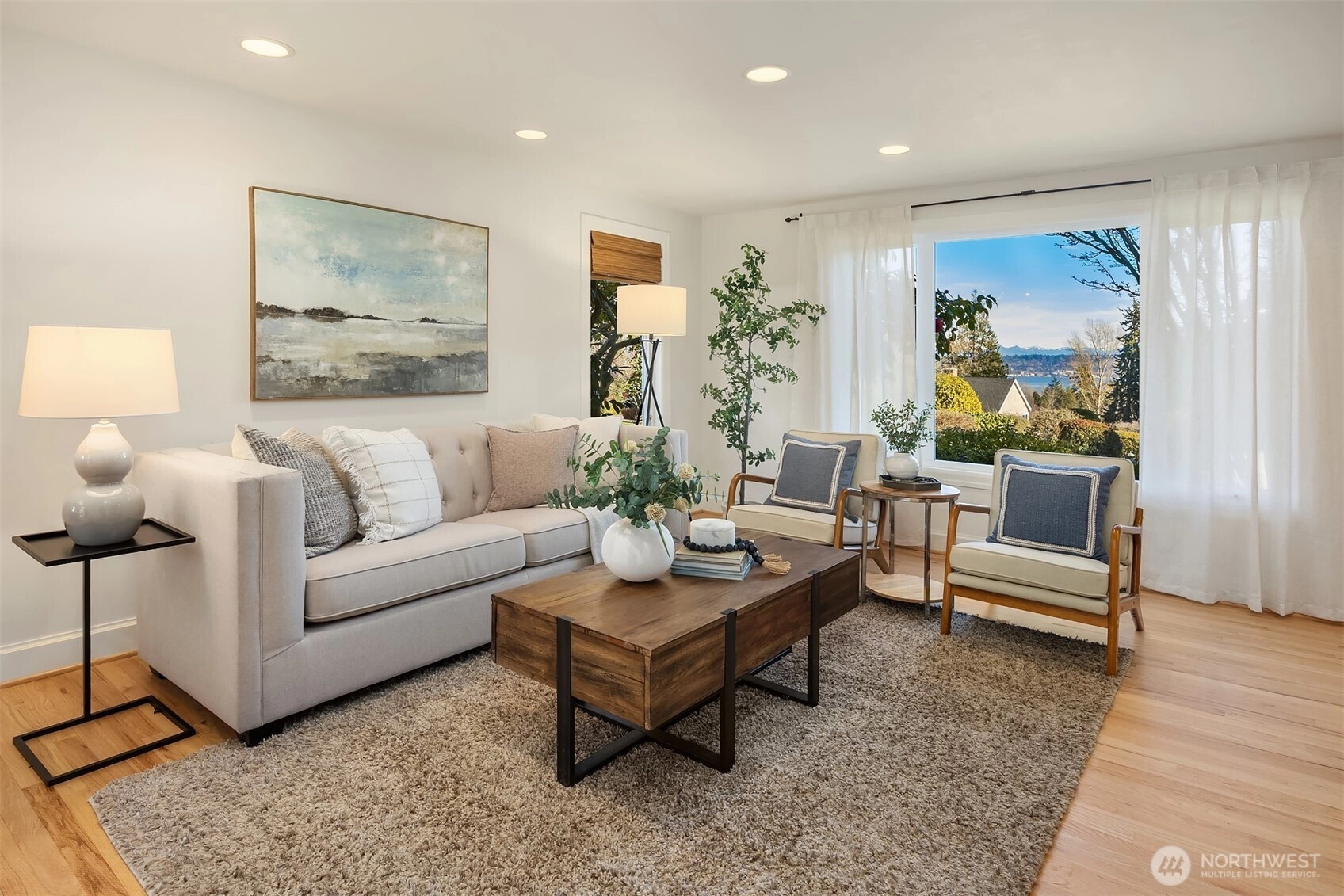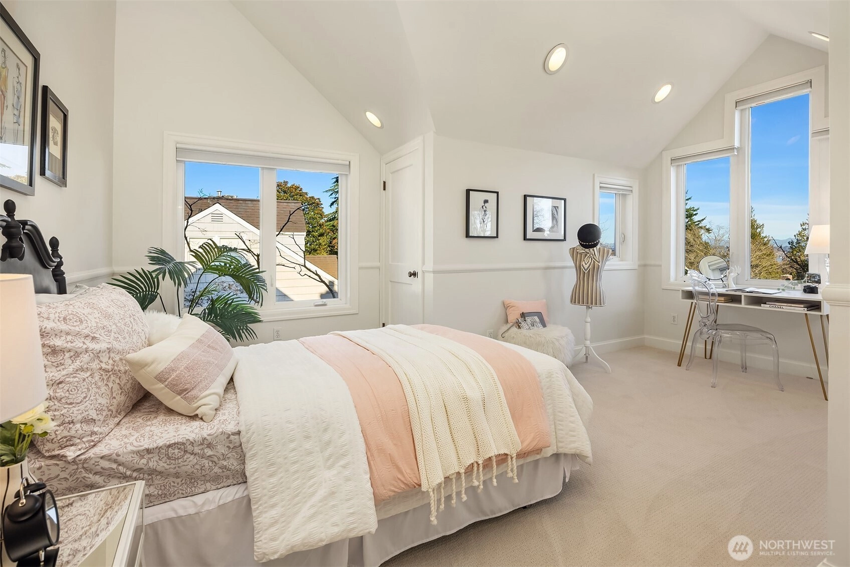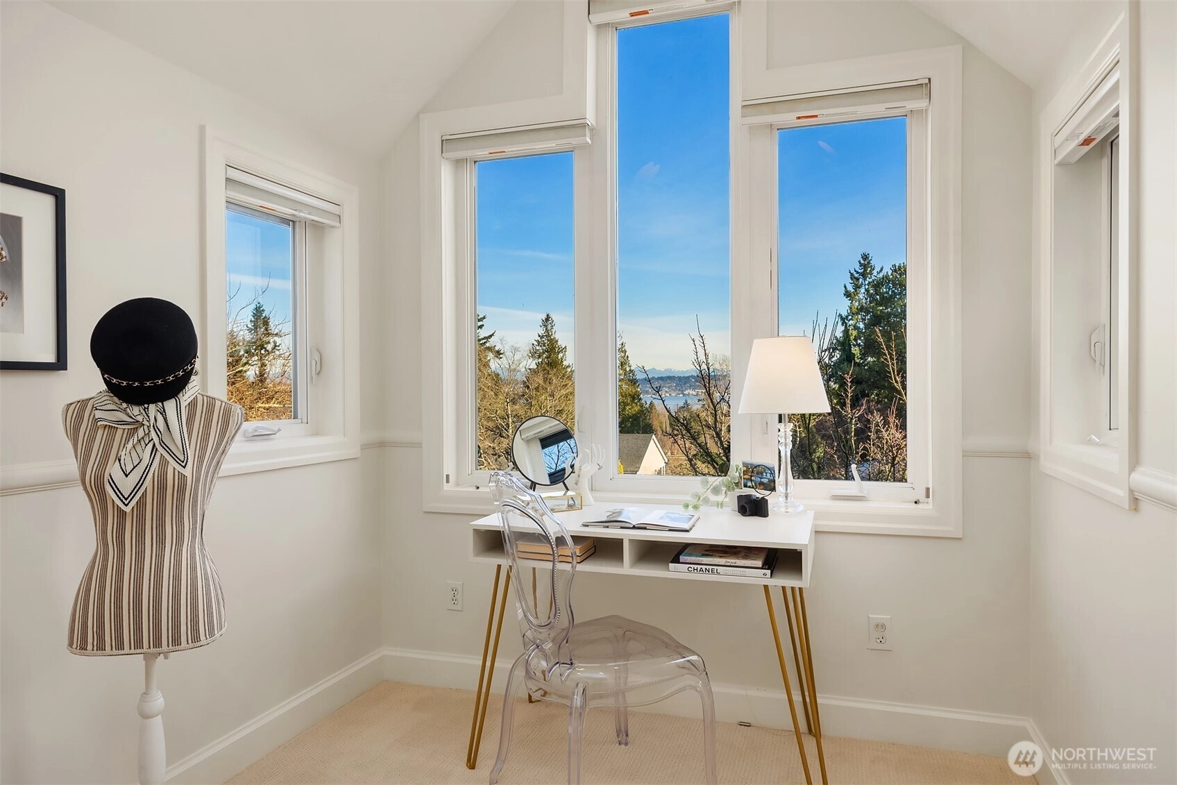 Set above the street in one of View Ridge’s most sought-after pockets, this custom home blends architectural presence, privacy, and sweeping lake and Cascade views from nearly every room. A beautifully landscaped front yard creates a gracious sense of arrival. Inside, rich architectural lines, custom cabinetry, and refreshed finishes deliver warmth and sophistication. The main-floor primary suite offers rare flexibility, while multiple work-from-home spaces support modern living. Upstairs features two storybook bedrooms plus a private office with a Murphy bed, all with inspiring outlooks. A generous patio invites effortless entertaining. A substantial garage with both front and rear access provides excellent storage and future ADU potential. Minutes to Magnuson Park, the Burke-Gilman Trail, View Ridge Swim & Tennis Club, and neighborhood amenities that make Northeast Seattle so desirable. This is a home that lives beautifully, offering an elevated yet comfortable lifestyle with seamless indoor-outdoor flow, abundant natural light, and spaces designed for both everyday living and special gatherings. Recent updates including newer flooring, roof, carpet, and paint mean the heavy lifting has already been done. A rare opportunity to own a view home that truly balances design, function, and location. Enjoy privacy, sunshine, and unforgettable sunsets from this exceptional Northeast Seattle retreat. Truly special. An offering that feels both timeless and entirely move-in ready!
