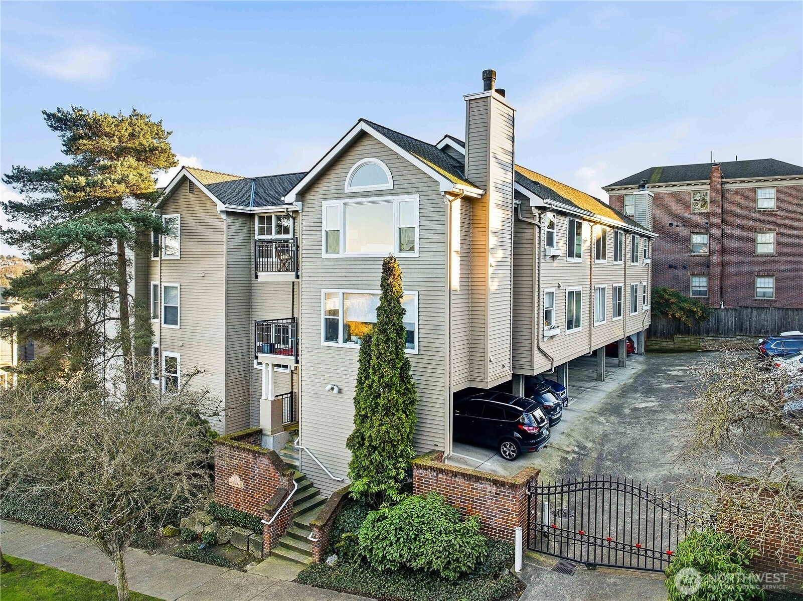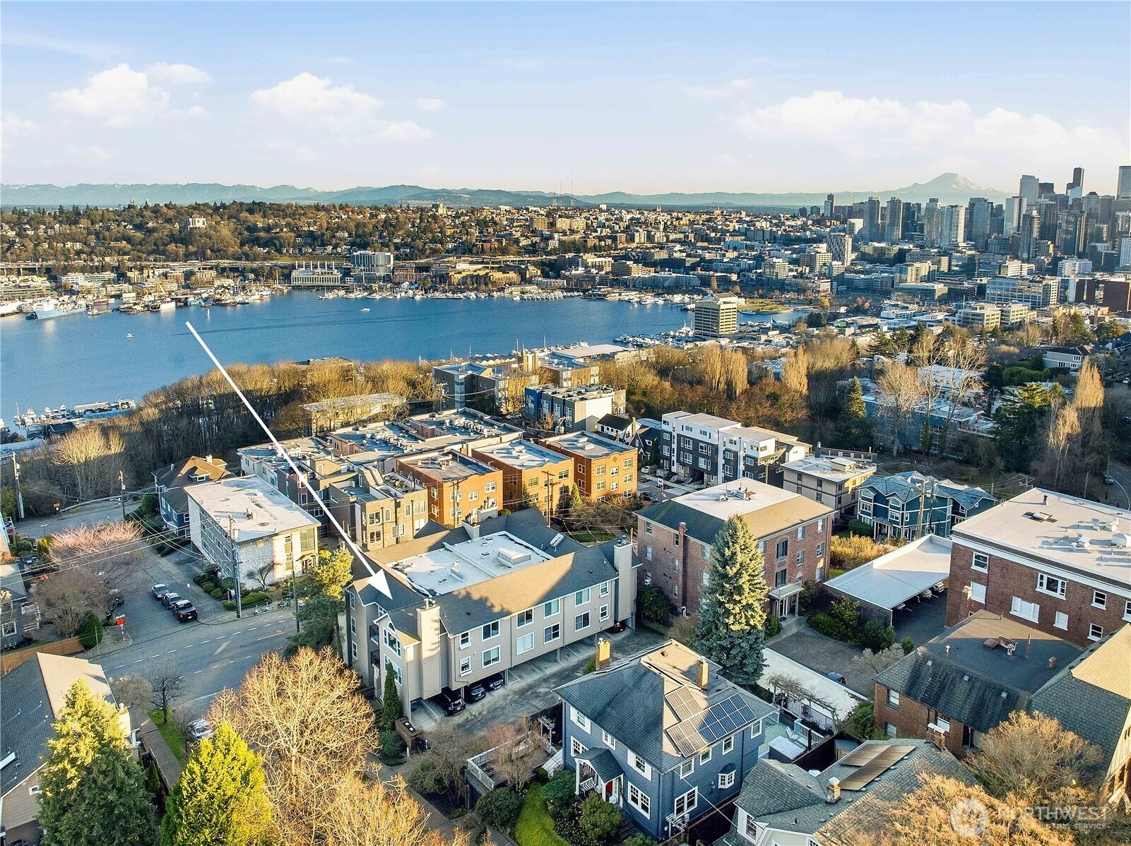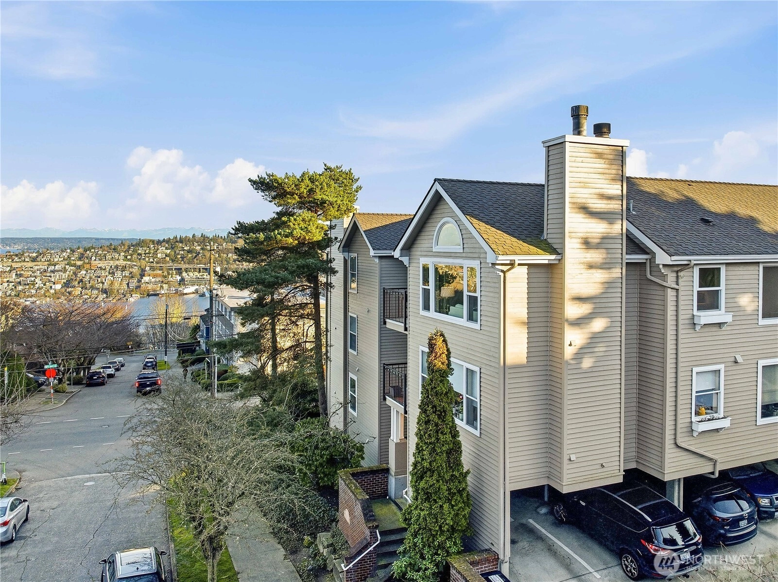 Standout value in today’s crowded condo market. This light-filled 2-bedroom, 1-bath home enjoys a top-floor setting in a 16-unit boutique building near the top of Queen Anne. North-facing windows and a private deck capture views toward the Ship Canal and Cascades, bringing light and openness to the living space. Thoughtful details include a cozy fireplace, free-standing bookcase, and a refreshed galley kitchen with farmhouse sink and butcher-block counters. Heated floors and towel bar in spacious bathroom with double pedestal sinks. Recently updated with new carpet, fresh paint, and professionally cleaned and resealed tile surfaces throughout, the home is move-in ready. In-unit stacked washer/dryer, generous closet space, additional storage locker down the hall, and gated carport parking add everyday convenience—all in a close-in location with easy access to downtown, SLU via Metro bus, and just minutes to Queen Anne amenities.