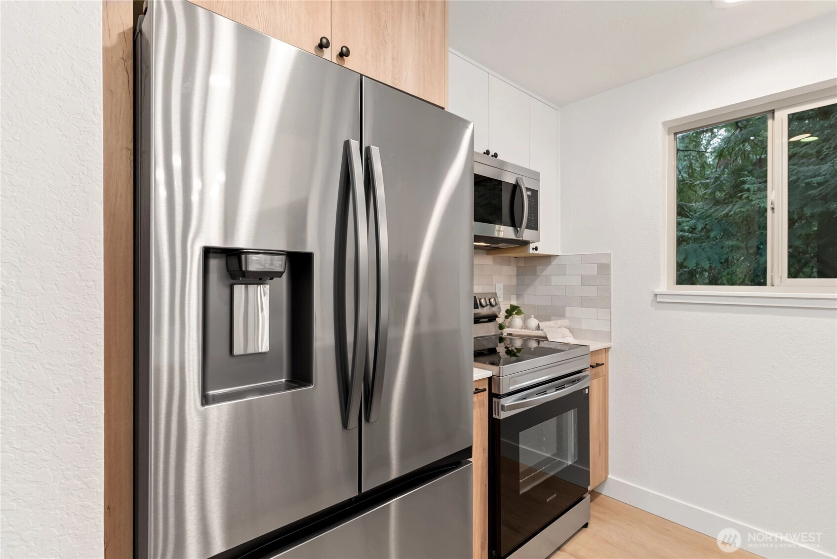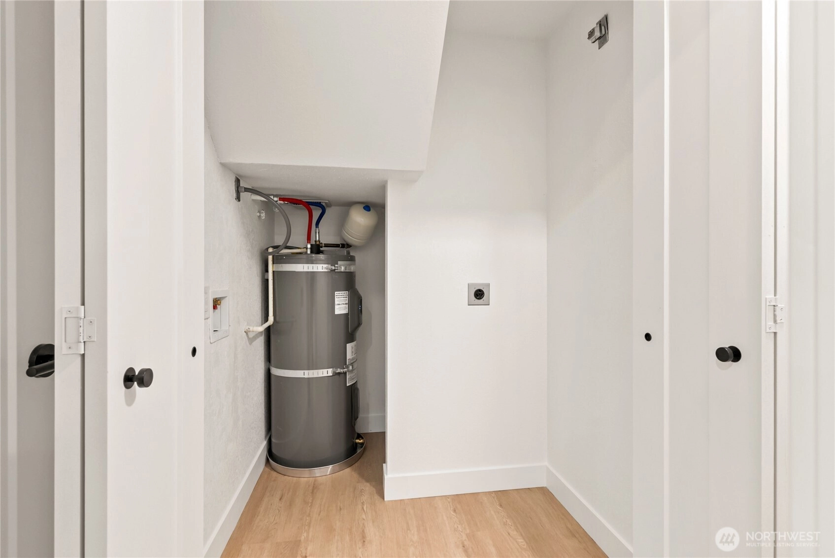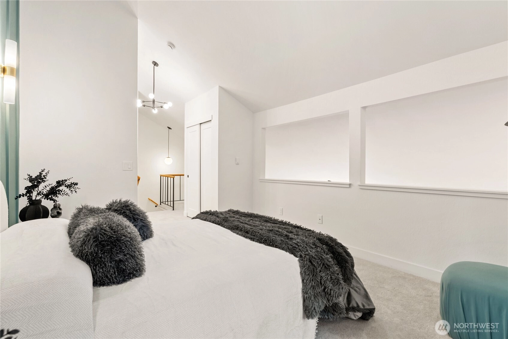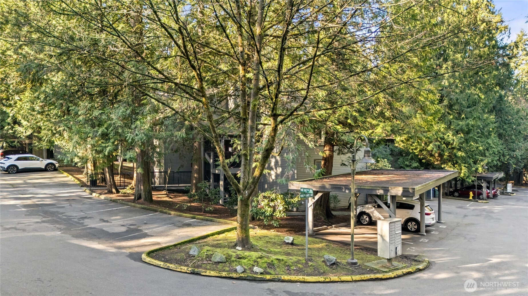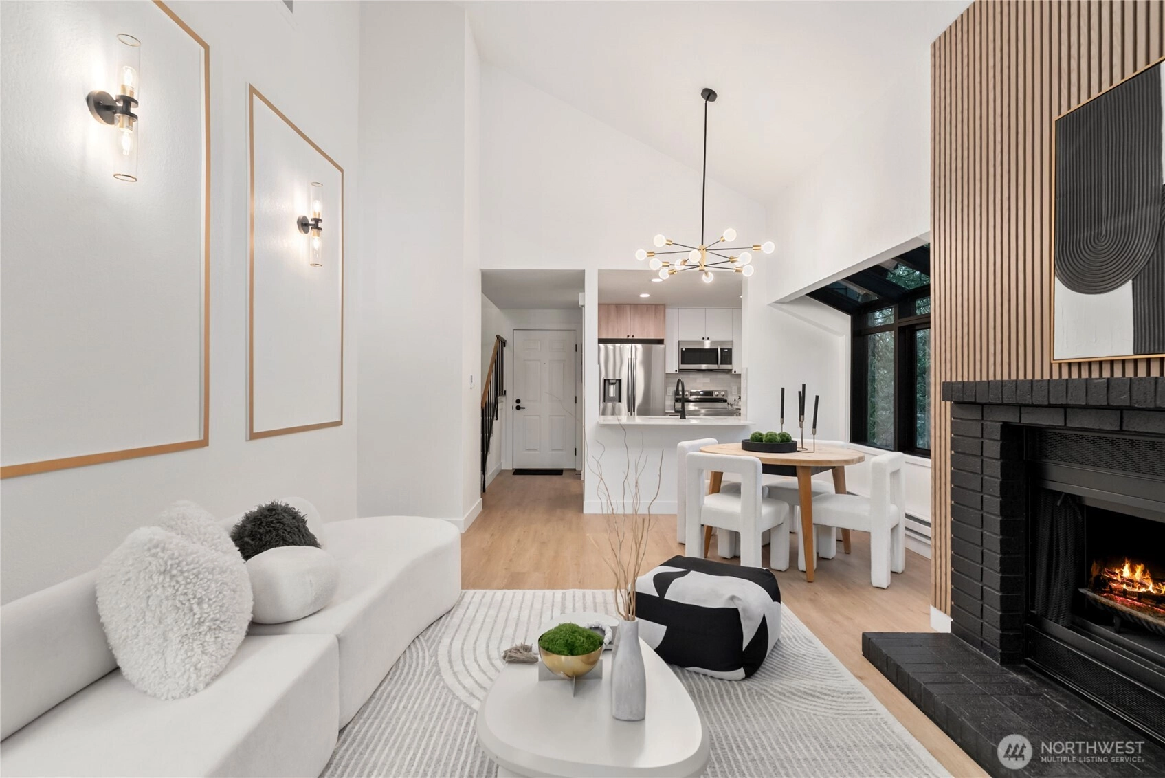 One of the finest condos in the community, this absolutely turn-key residence is a must-see. Soaring vaulted ceilings and abundant natural light create an airy, sophisticated atmosphere throughout. The home has been thoughtfully updated with new custom cabinetry, luxury LVP flooring, stainless steel appliances, and a timeless real-wood fireplace that anchors the living space with warmth and charm. The dream kitchen flows seamlessly into the living room, which opens to a covered balcony—perfect for relaxing or entertaining year-round.The main floor features a stunning bedroom and a fully updated guest bathroom, offering flexibility and convenience. Upstairs, the loft-style primary suite showcases vaulted ceilings, brand-new carpet, generous closet space, and an additional oversized storage area rarely found in condo living. A brand-new water heater adds peace of mind.This home includes one covered carport with electrical hookup, ample additional parking, and access to EV charging stations. The well-managed HOA boasts high owner occupancy and strong reserves. Ideally located just minutes from the Microsoft campus via light rail, with easy access to I-405, shopping, Costco, and dining—this is effortless, elevated living at its best. Won't last Long! Absolutely MUST SEE!