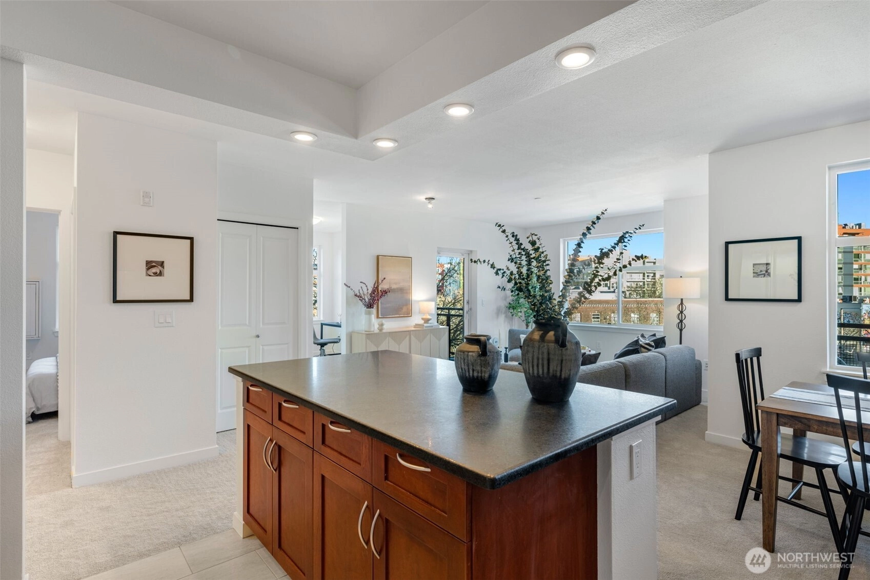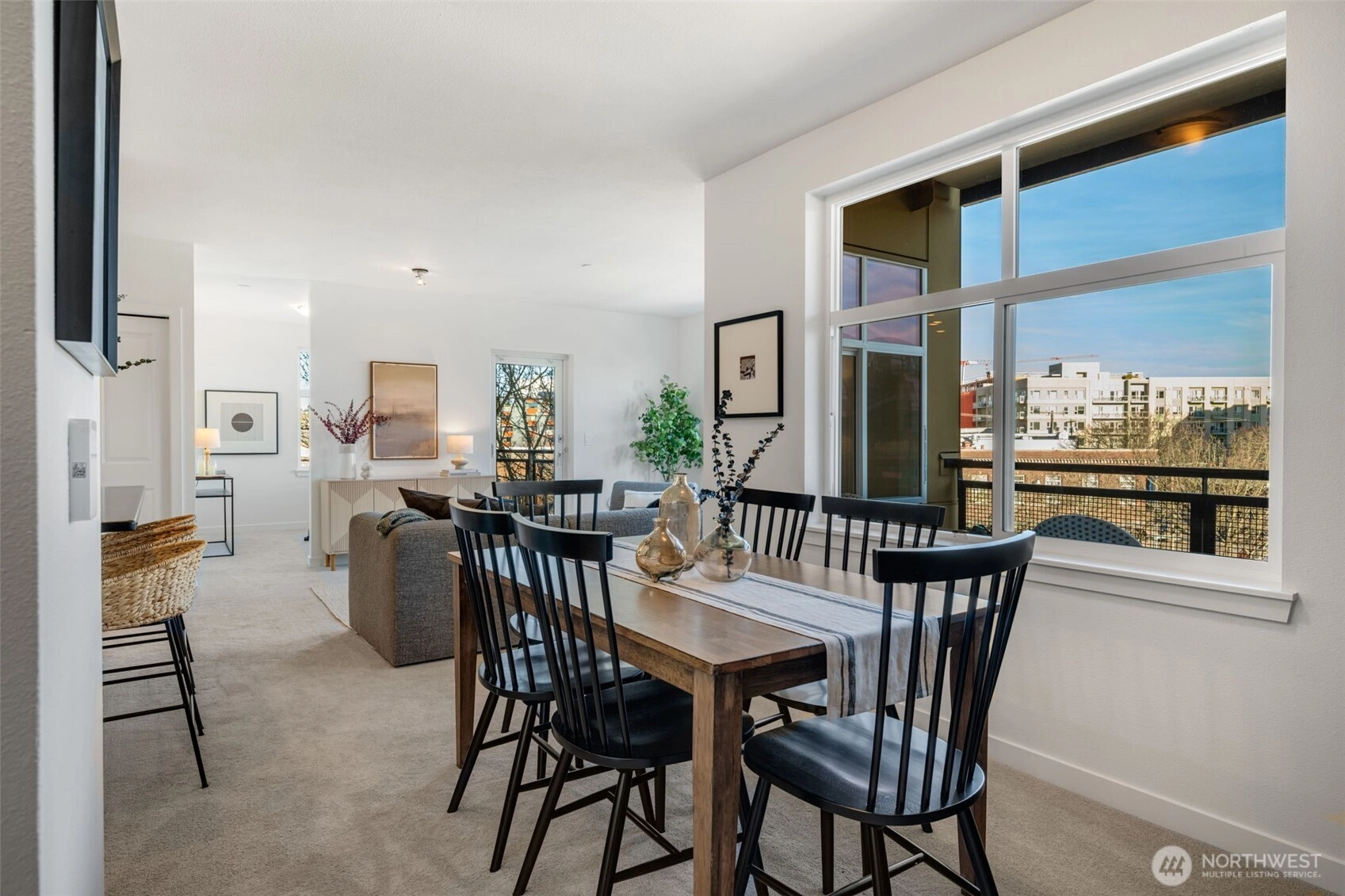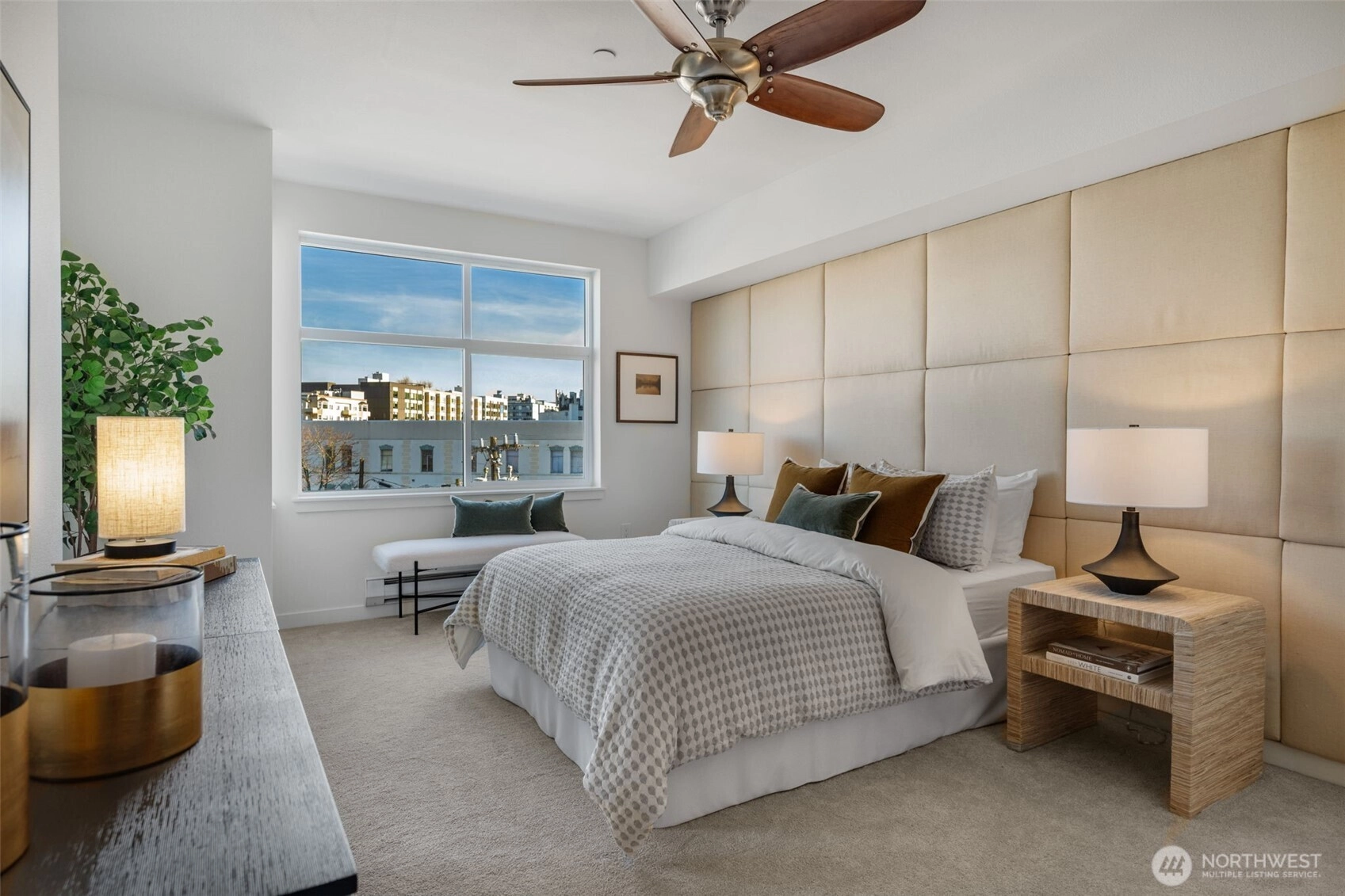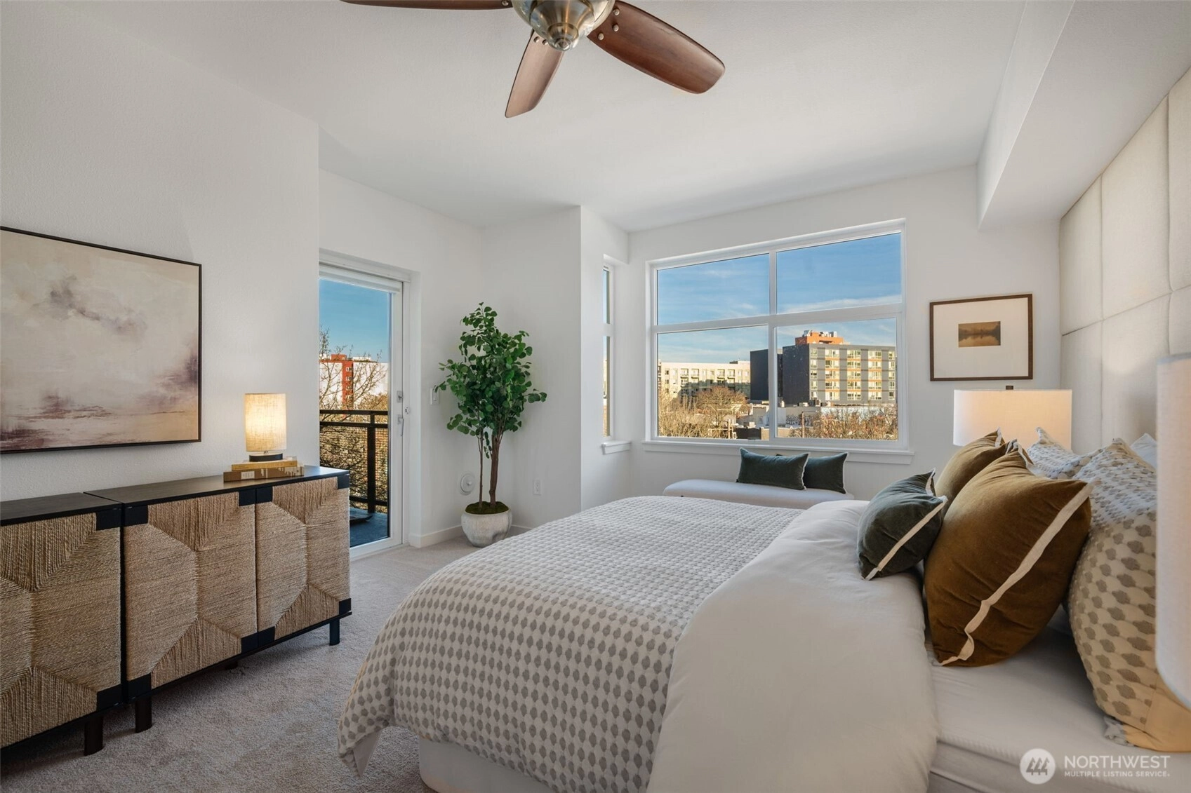 Welcome to Canal Station North. This rare 2-bed + den, 2-bath residence is perfectly positioned in the heart of Ballard—just steps from top-rated coffee, dining, boutique shopping, the Sunday Farmers Market, and Golden Gardens. Perched on the 5th floor, this light-filled home showcases the community’s largest floor plan with just one shared wall, expansive northeast-facing windows, and two private balconies for effortless indoor-outdoor living. An open-plan living area flows beautifully into the dining space and a sleek island kitchen with bar-top seating, featuring honed granite countertops, shaker-style cabinetry, and stainless steel appliances—ideal for entertaining or everyday ease. The primary suite is a serene retreat with a spa-inspired five-piece ensuite bath, while the second bedroom is thoughtfully outfitted with a Murphy bed, making it equally suited as a guest room or flex space. Both bedrooms offer walk-in closets, complemented by ample additional storage throughout the home. The versatile den functions perfectly as a home office or third non-conforming bedroom. Recent updates include fresh interior paint, new carpet, and custom blinds. Everyday convenience is elevated with an in-unit washer/dryer, two side-by-side secure garage parking spaces near the elevators, and an 85sf storage unit. Additional highlights include a strong HOA, no rental cap (90-day minimum), resort-style amenities, and an exceptional Walk Score of 97—delivering the best of Ballard living.