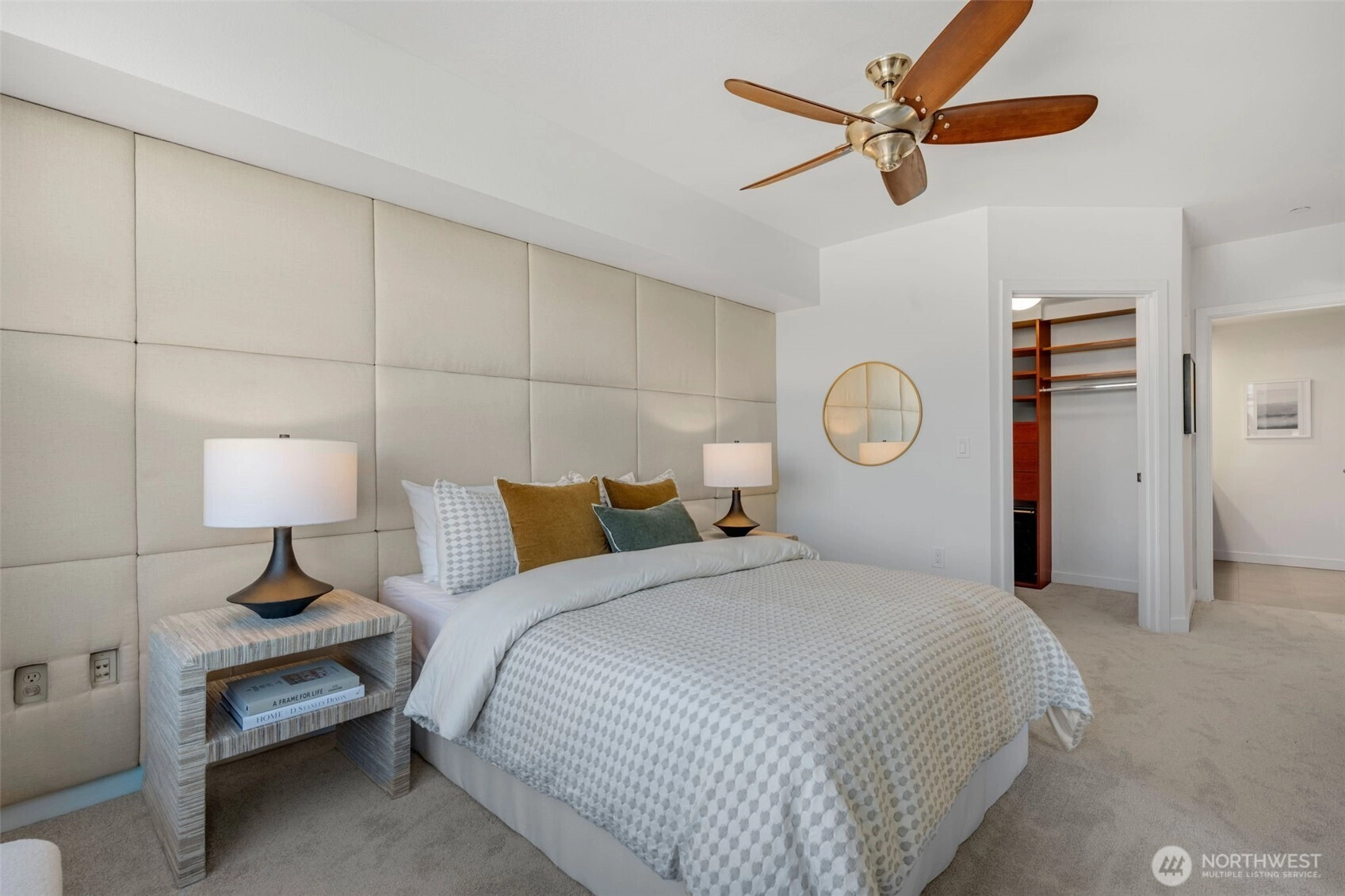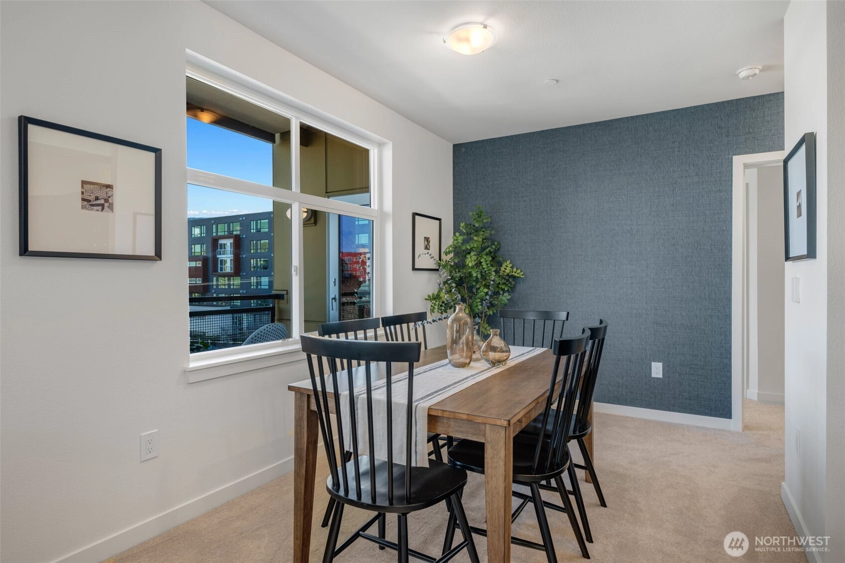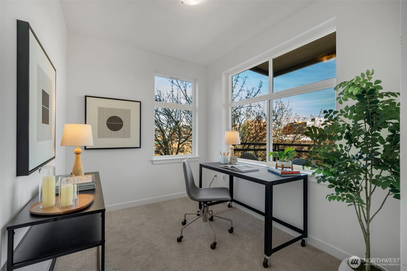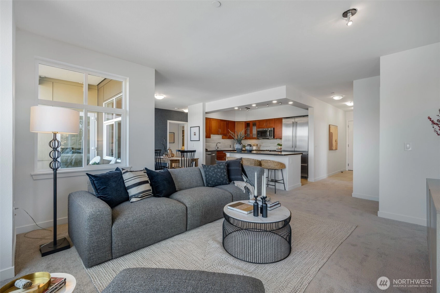 Welcome to Canal Station North. This rare 2-bed + den, 2-bath residence is perfectly positioned in the heart of Ballard—just steps from top-rated coffee, dining, boutique shopping, the Sunday Farmers Market, and Golden Gardens. Perched on the 5th floor, this light-filled home showcases the community’s largest floor plan with just one shared wall, expansive northeast-facing windows, and two private balconies for effortless indoor-outdoor living. An open-plan living area flows beautifully into the dining space and a sleek island kitchen with bar-top seating, featuring honed granite countertops, shaker-style cabinetry, and stainless steel appliances—ideal for entertaining or everyday ease. The primary suite is a serene retreat with a spa-inspired five-piece ensuite bath, while the second bedroom is thoughtfully outfitted with a Murphy bed, making it equally suited as a guest room or flex space. Both bedrooms offer walk-in closets, complemented by ample additional storage throughout the home. The versatile den functions perfectly as a home office or third non-conforming bedroom. Recent updates include fresh interior paint, new carpet, and custom blinds. Everyday convenience is elevated with an in-unit washer/dryer, two side-by-side secure garage parking spaces near the elevators, and an 85sf storage unit. Additional highlights include a strong HOA, no rental cap (90-day minimum), resort-style amenities, and an exceptional Walk Score of 97—delivering the best of Ballard living.