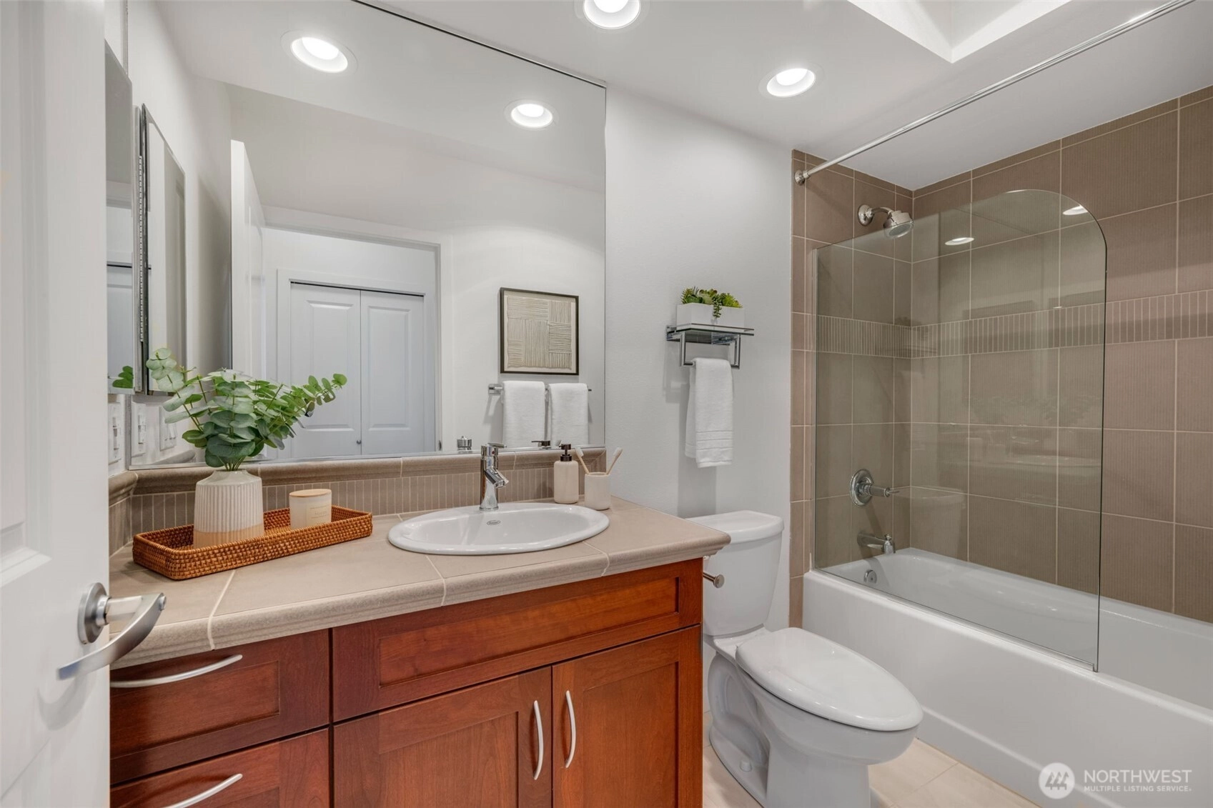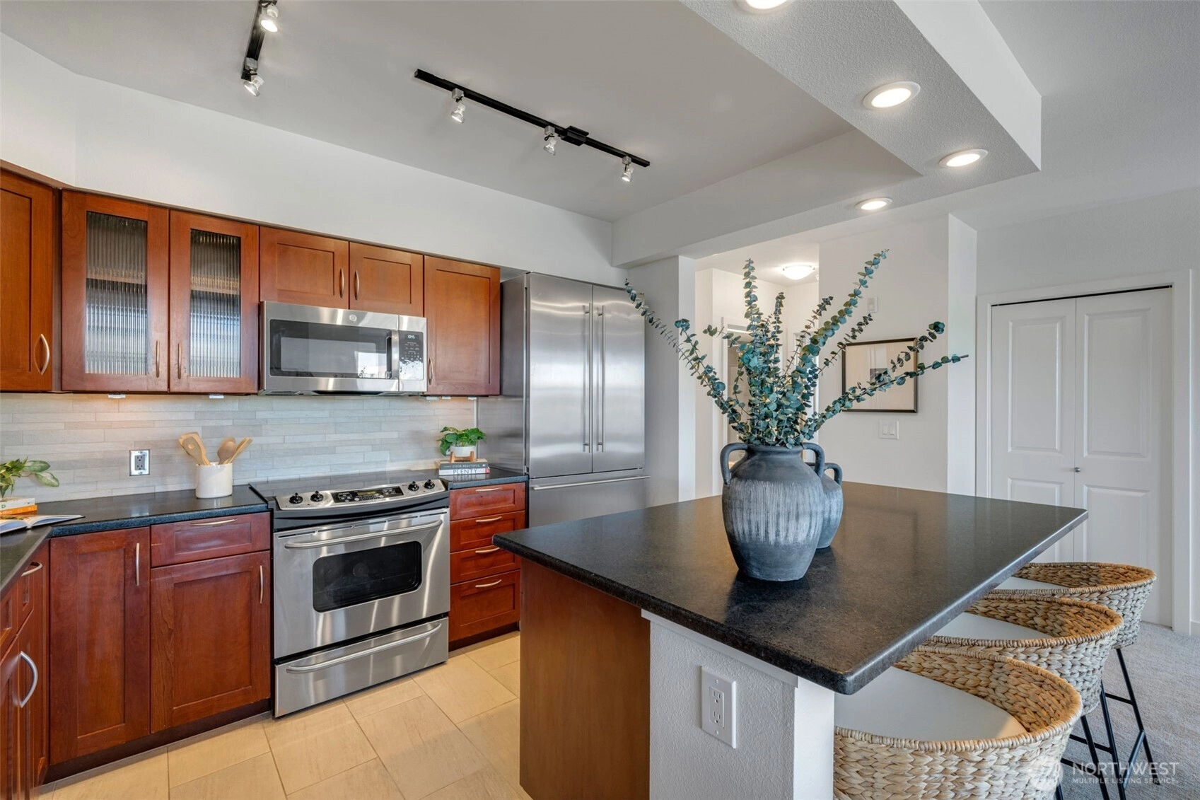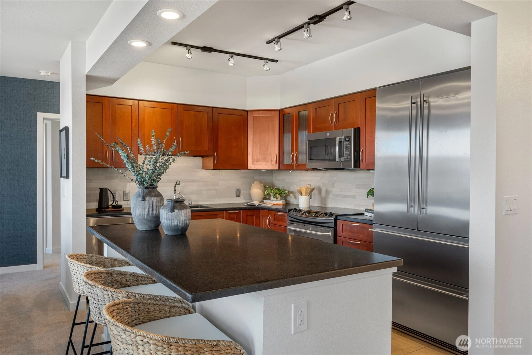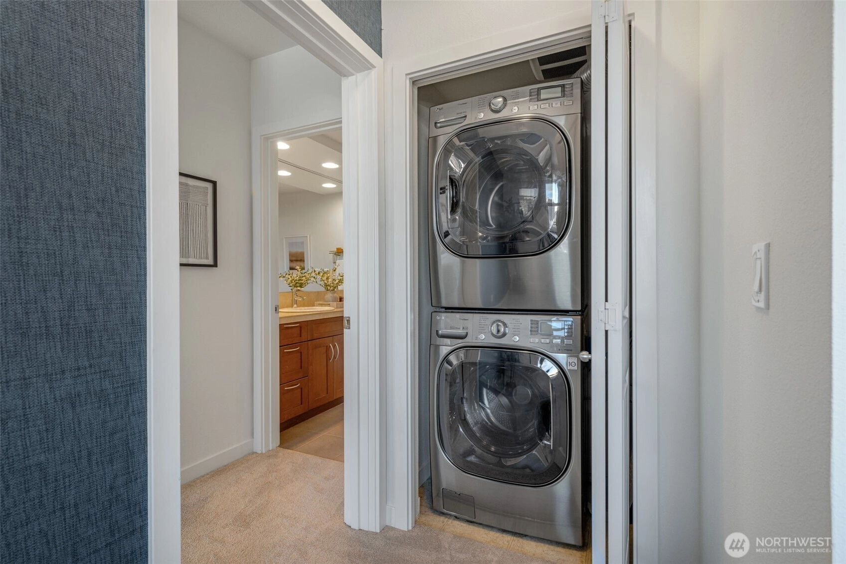 Welcome to Canal Station North. This rare 2-bed + den, 2-bath residence is perfectly positioned in the heart of Ballard—just steps from top-rated coffee, dining, boutique shopping, the Sunday Farmers Market, and Golden Gardens. Perched on the 5th floor, this light-filled home showcases the community’s largest floor plan with just one shared wall, expansive northeast-facing windows, and two private balconies for effortless indoor-outdoor living. An open-plan living area flows beautifully into the dining space and a sleek island kitchen with bar-top seating, featuring honed granite countertops, shaker-style cabinetry, and stainless steel appliances—ideal for entertaining or everyday ease. The primary suite is a serene retreat with a spa-inspired five-piece ensuite bath, while the second bedroom is thoughtfully outfitted with a Murphy bed, making it equally suited as a guest room or flex space. Both bedrooms offer walk-in closets, complemented by ample additional storage throughout the home. The versatile den functions perfectly as a home office or third non-conforming bedroom. Recent updates include fresh interior paint, new carpet, and custom blinds. Everyday convenience is elevated with an in-unit washer/dryer, two side-by-side secure garage parking spaces near the elevators, and an 85sf storage unit. Additional highlights include a strong HOA, no rental cap (90-day minimum), resort-style amenities, and an exceptional Walk Score of 97—delivering the best of Ballard living.