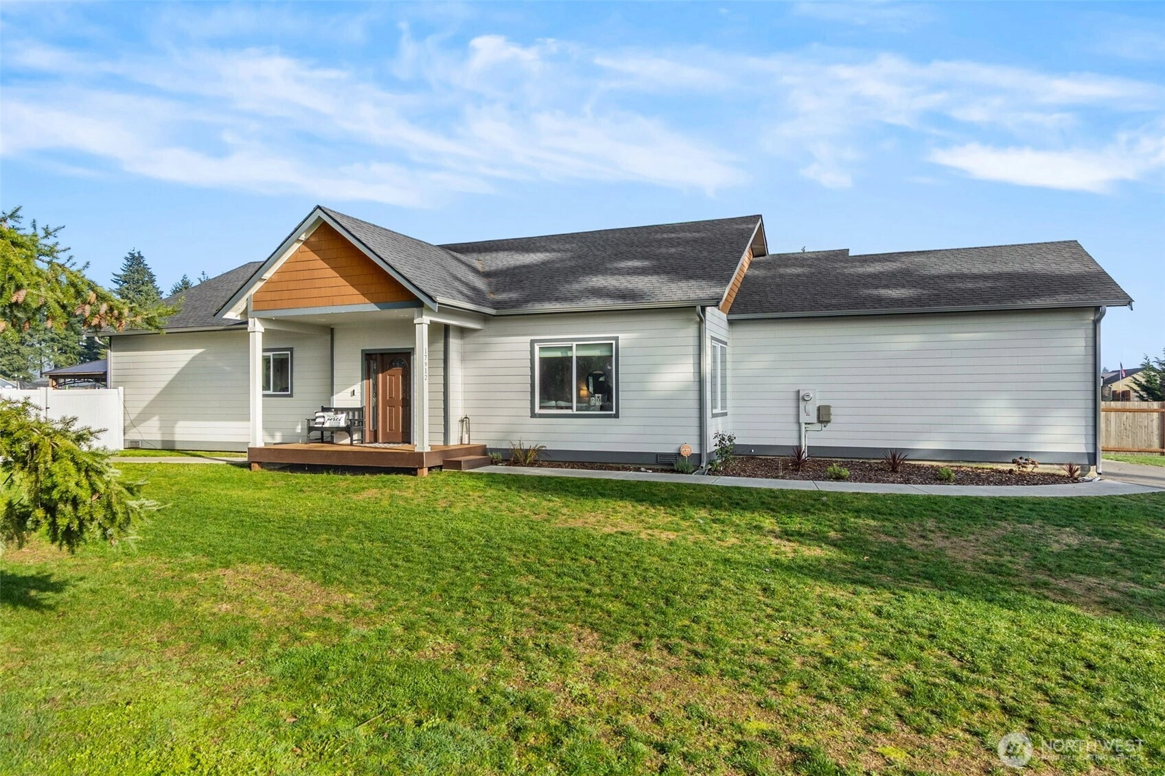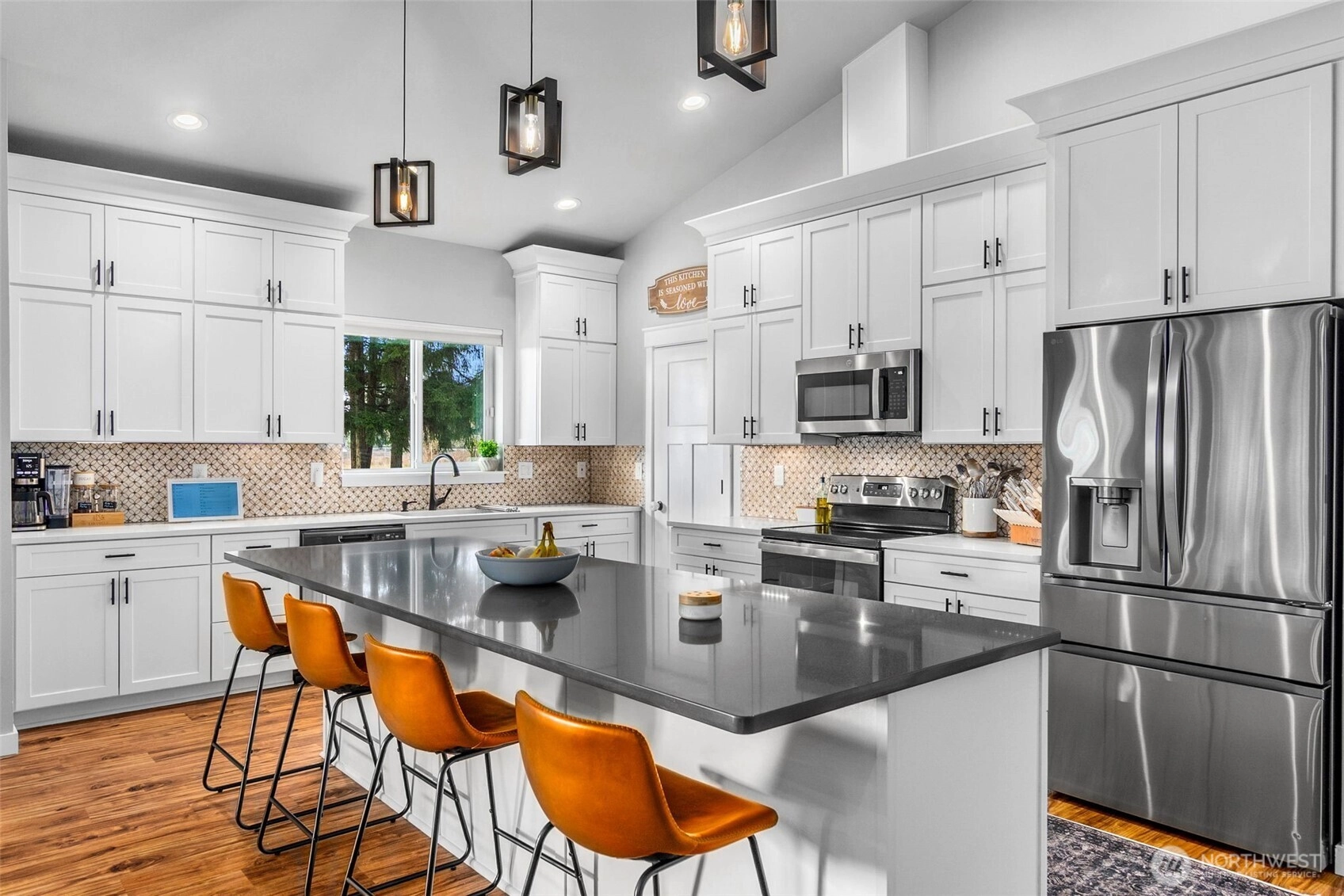 This move-in ready rambler offers comfortable living with plenty of space to enjoy. With over 2,000 square feet, the open layout gives you room to spread out while still feeling connected. The kitchen features white cabinets with crown molding, quartz countertops, and upgraded stainless steel appliances, and opens to a bright great room with vaulted ceilings. Luxury vinyl plank flooring runs throughout the home for a clean, cohesive look. The primary bedroom includes a walk-in closet and a nicely finished bathroom with a fully tiled walk-in shower and glass door. You’ll appreciate year-round comfort with a forced-air furnace and heat pump. Out back, enjoy a stamped concrete patio, gazebo, and new vinyl fencing—perfect for relaxing or entertaining with low maintenance. An oversized two-car garage, extra driveway parking, and a quiet dead-end street location with county-owned land to the west add privacy and convenience.