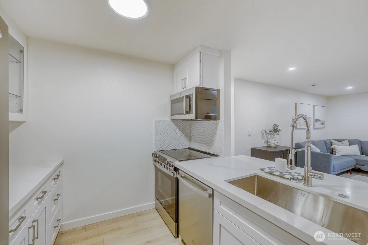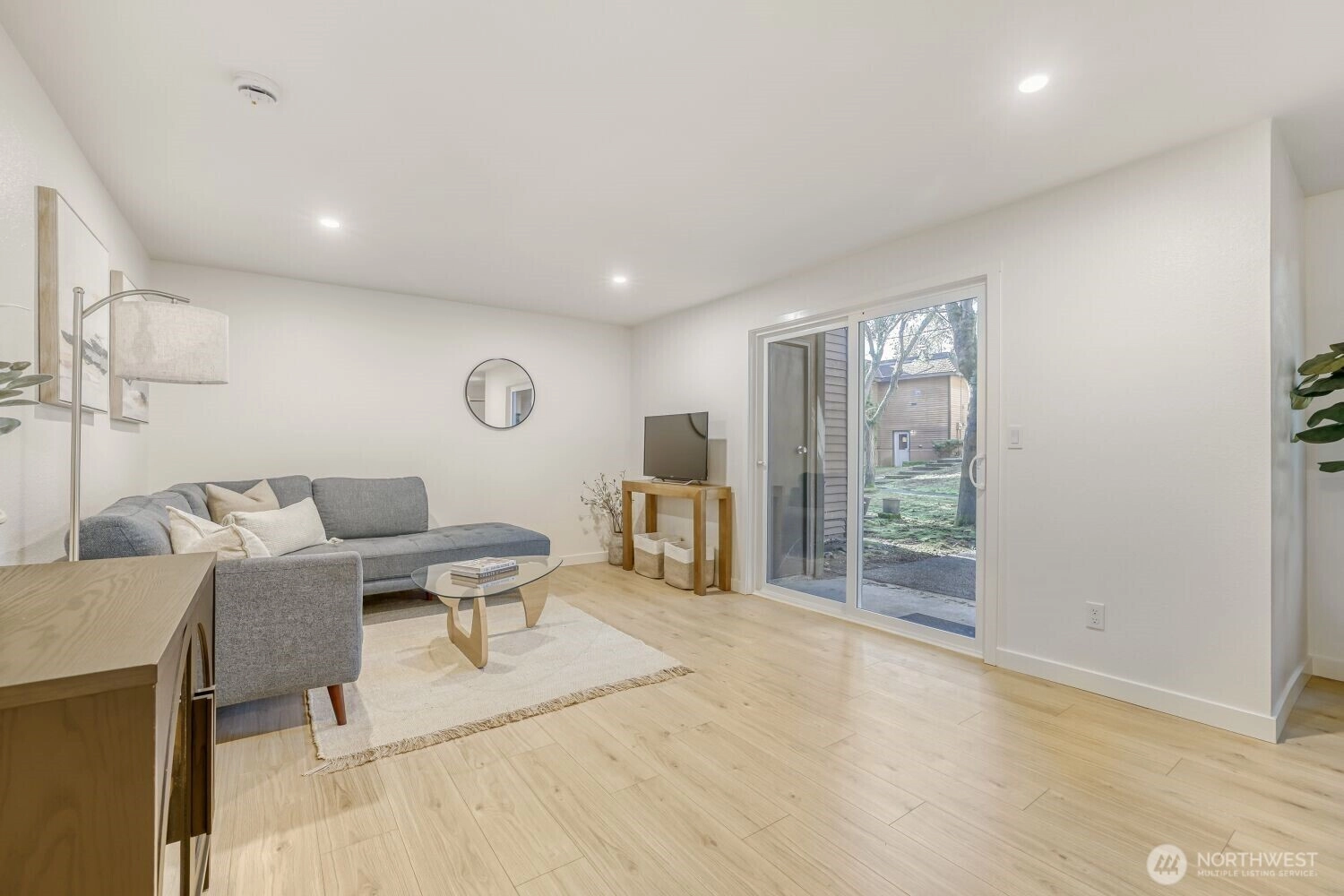 Fully remodeled garden level 2 bed 1 bath condo in south Edmonds. Completed in 2026, this home offers over 850 sf of living space on one convenient level. Beautifully redesigned kitchen is light and airy, with pantry, new appliances, and adjacent In-unit laundry. Lots of windows bring in natural light and the west facing ground floor patio expands the already large living area. Primary BR features a walk-in closet, morning sunlight and brand-new carpeting. Second bedroom is great for guests or office. Home is situated close to the seasonal outdoor swimming pool. Quiet complex borders the interurban trail to the east, while being walkable to supermarkets, shopping and countless restaurants within a couple of blocks. Easy access to Hwy 99, I-5 and the Link light rail system. 1 close & convenient dedicated parking space and tons of guest parking. No rental cap. Don’t miss this one!