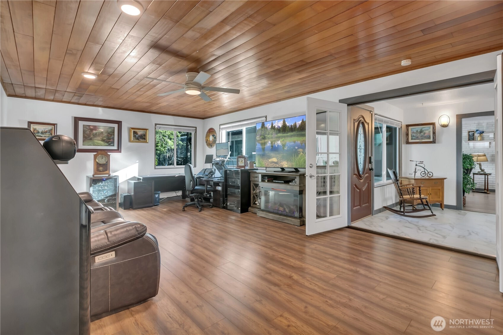 Modern country farmhouse 3bdr 3 bath, recently remodeled with detach ADU. 2 stable barn includes chicken coop separate 2 horse stable, currently used as a wood shelter. Quartz kitchen and bath counter tops, white craftsman style cabinetry, luxury vinyl plank flooring throughout the home. Skylights in several rooms provide natural lighting. Wood burning fireplace adds, cozy ambiance and low cost heating. Mother n law or movie room with mini kitchen, electric fireplace and private bath This beautiful country estate/ hobby farm spreads out over almost 2 acres.
