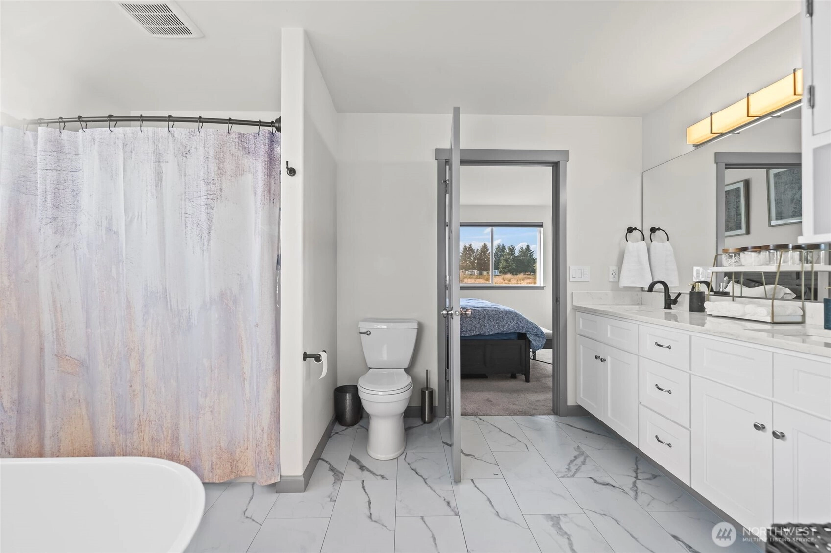 Country Living done right! Like new Rambler on over 3 acres of flat pasture with RV hookup and fancy chicken coop! You will love this open floorplan easy for entertaining... quartz counter tops, huge center island, upgraded tech washer/dryer, electric blinds, recirculating tankless propane water heater, and mini splits providing lower power bill and A/C. The primary bedroom with en-suite bath, bonus sculpture tub, and walk in closet are located on one end of the home and the other two bedrooms and main bath are on the opposite end, great for privacy! Spacious 3 car garage with plenty of room for your toys! Enjoy star gazing while sitting around the generous sized fire pit outside the front door! You won't want to miss this dreamy, easy living, quiet location in Tenino!