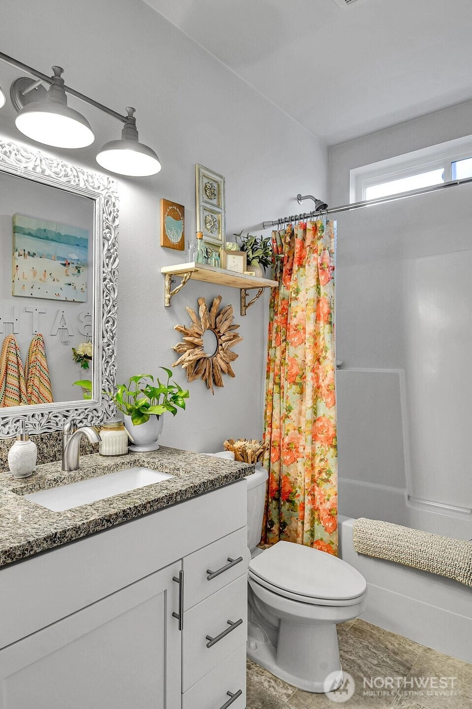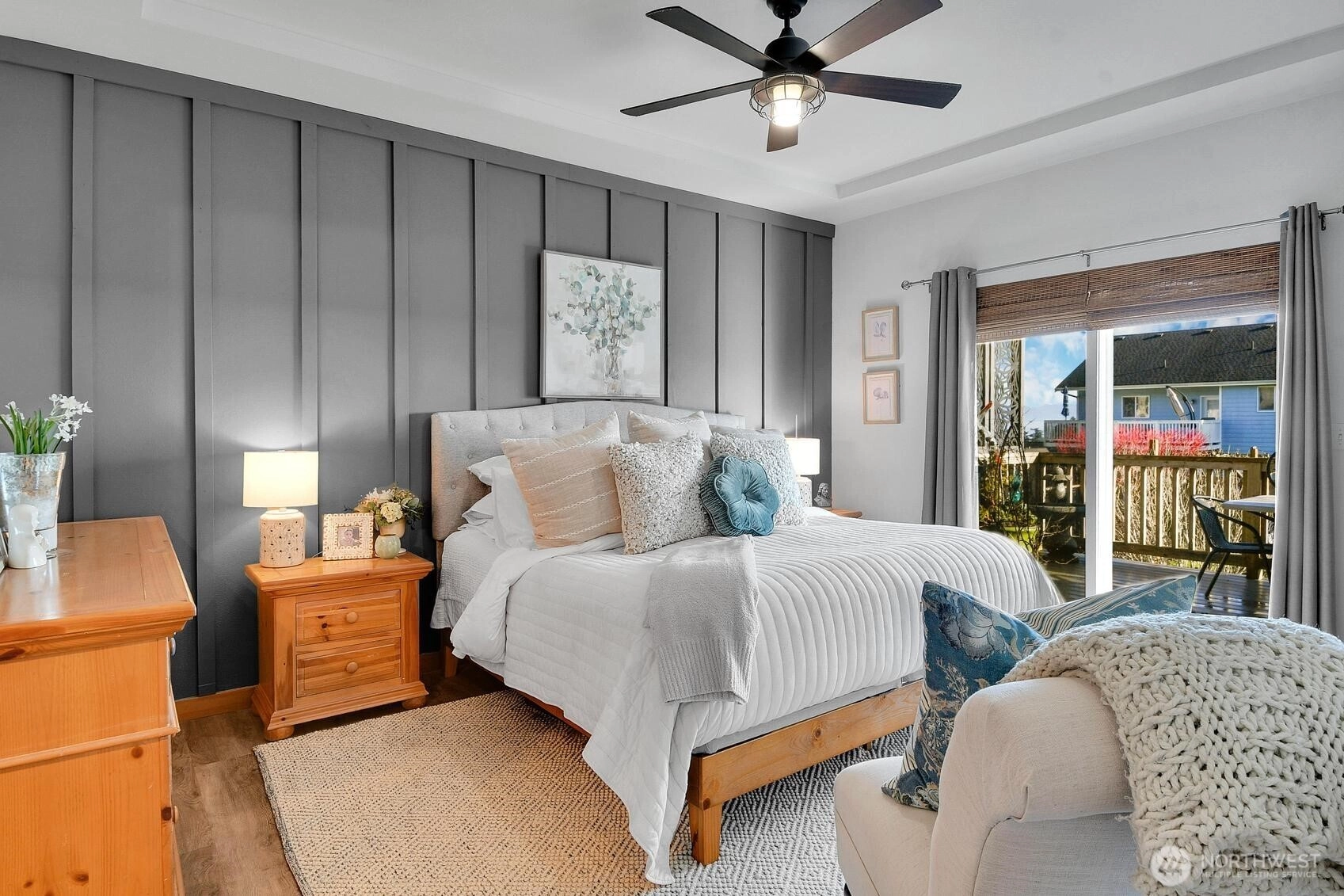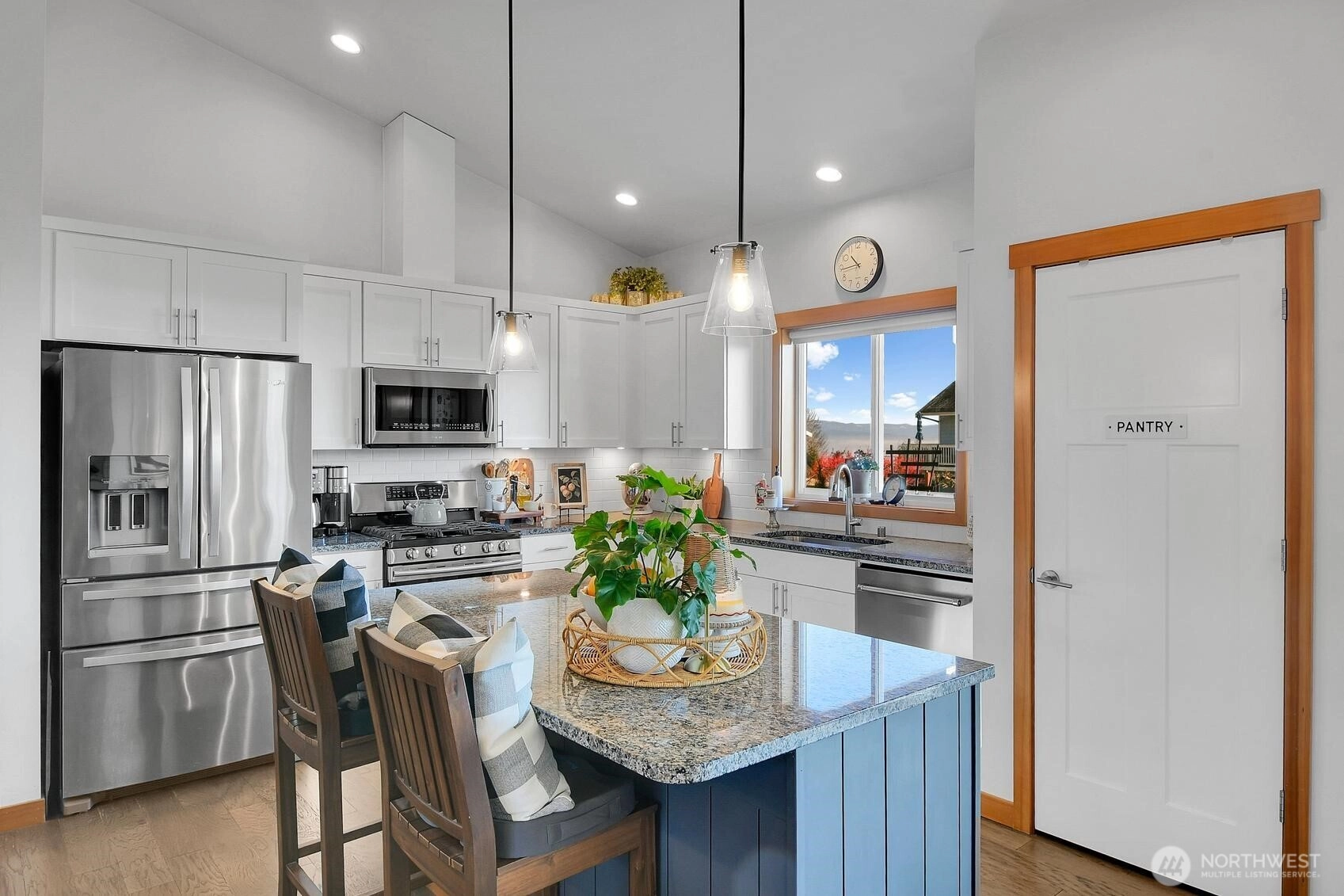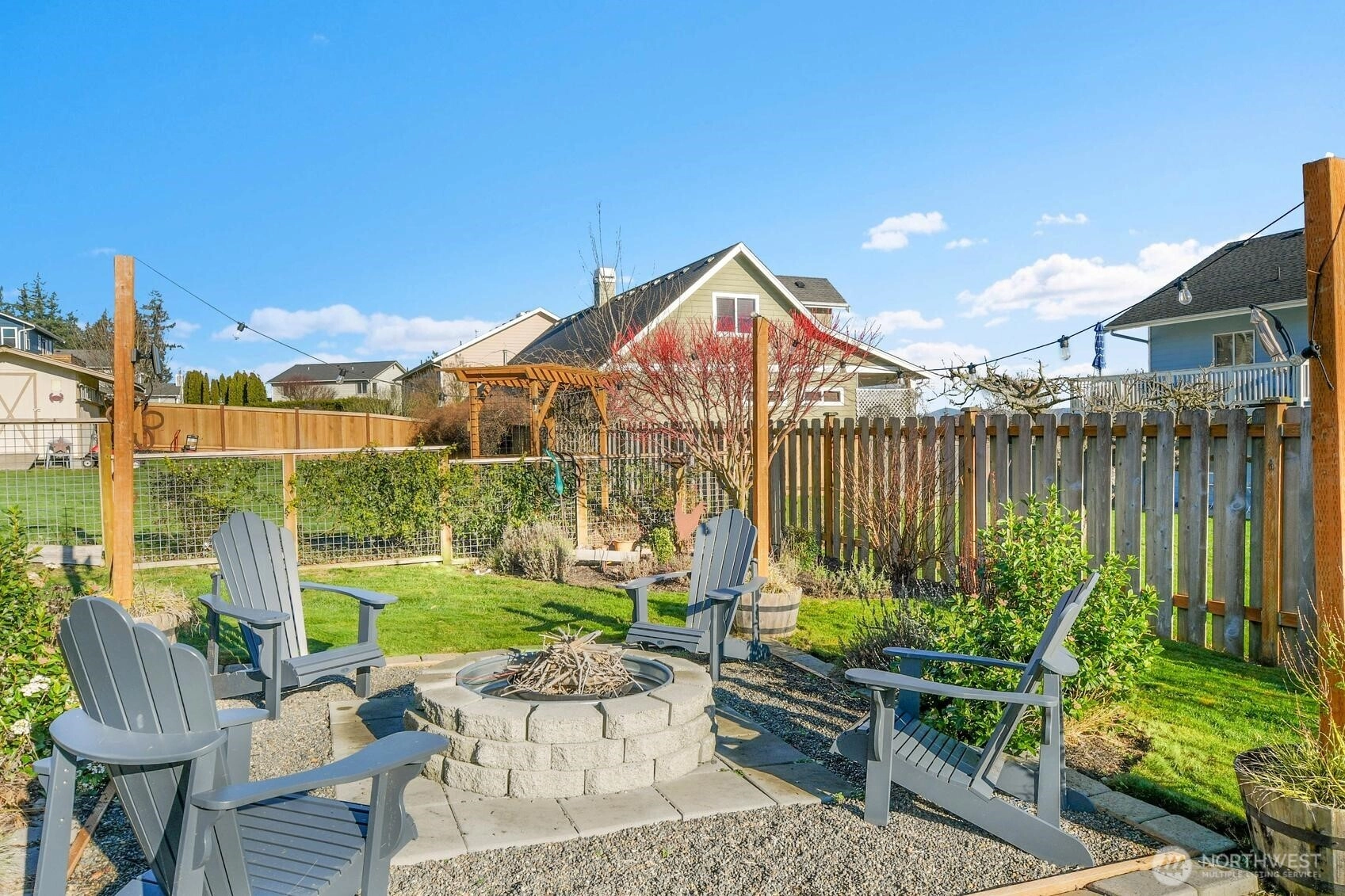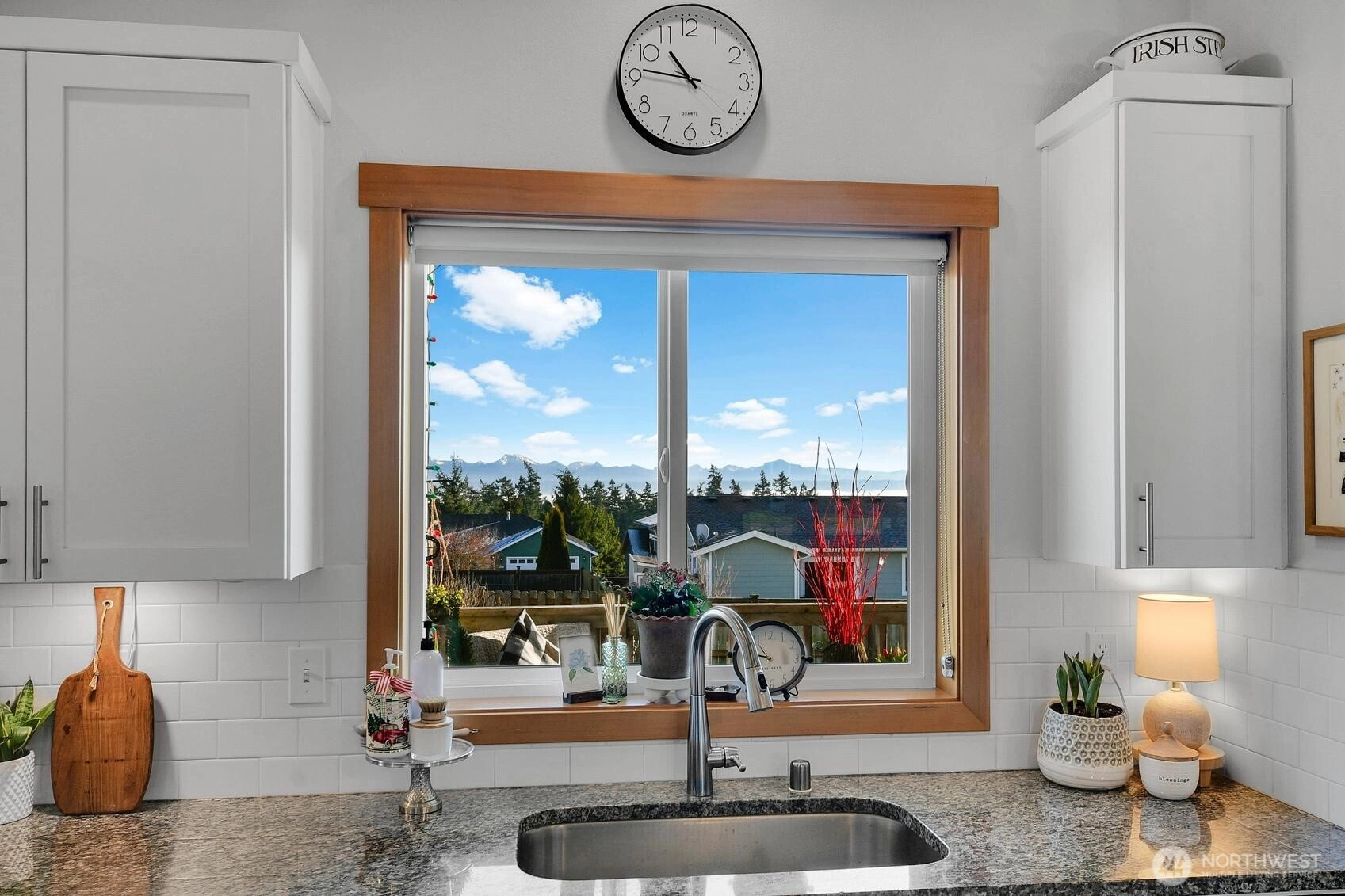 On the sunlit east facing side of Camano Island, where bald eagles soar overhead and neighbors linger on evening walks, this refined 3-bedroom rambler with mountain views offers a life shaped by nature and community. Vaulted ceilings rise above a warm, light-filled great room anchored by a gas fireplace and thoughtful millwork, creating an effortless flow into the kitchen with white shaker cabinetry, granite counters, subway tile, and a generous island for gathering. A welcoming covered front porch sets the tone for westerly facing sunset skies, while the back deck welcomes views of breathtaking sunrises and the Cascade mountains. The covered portion of the back deck serves as an outdoor living room—perfect for summer dinners, garden views, and nearby fireside conversations at the fire pit. The serene primary suite opens to the deck and features a spa-inspired bath and walk-in closet. A rare third garage bay has been transformed into a heated art studio, inviting you to fully embrace the artist culture so prominent on Camano and its creative rhythm of island living.