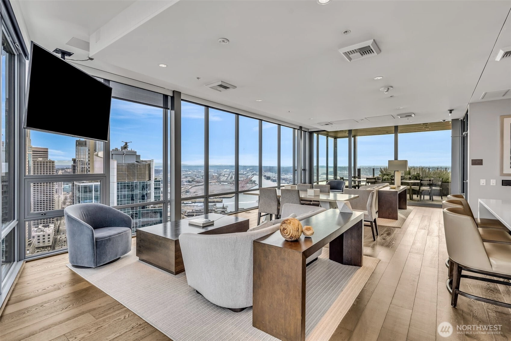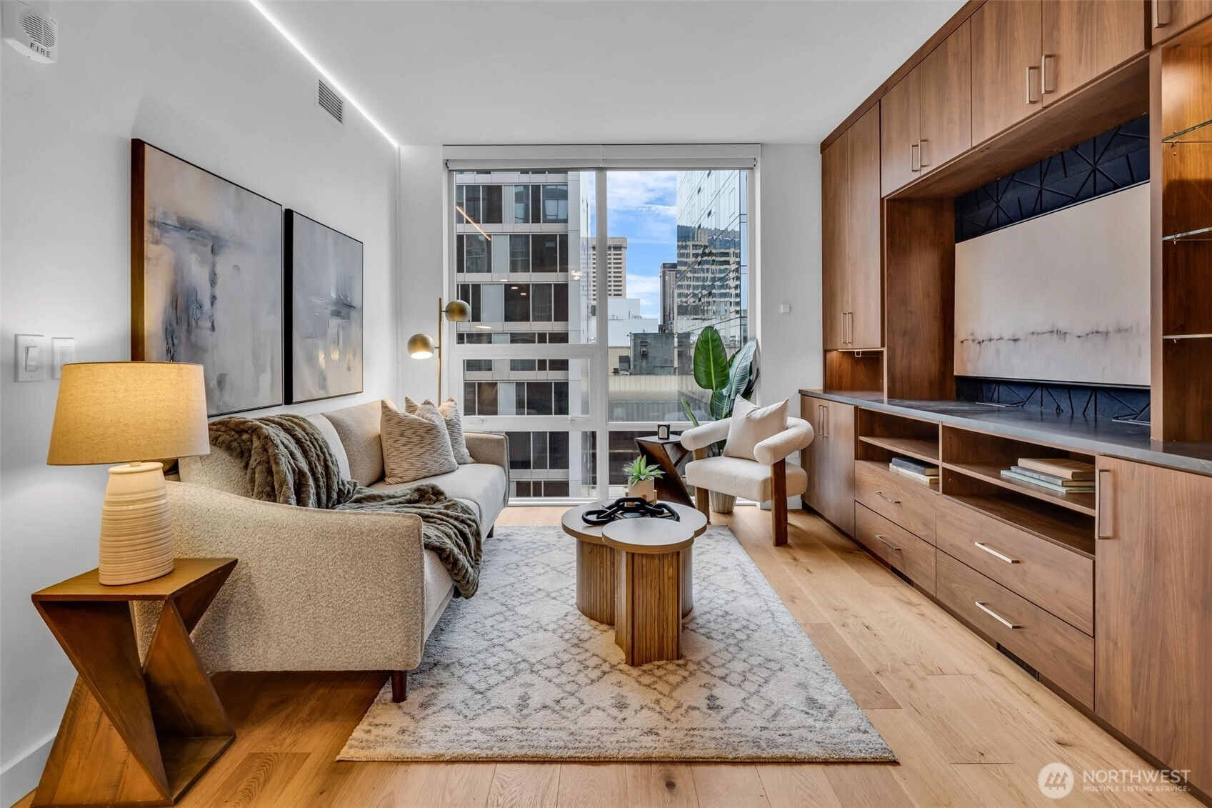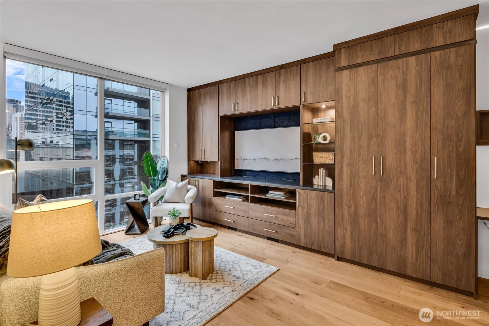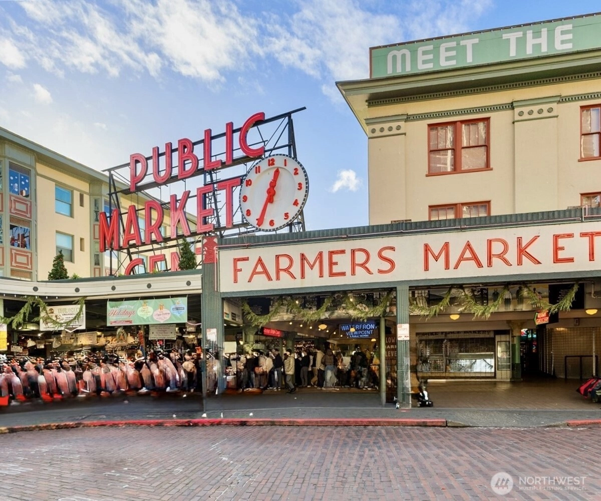 Seattle has a few true headliners, The Emerald is one of them. Rare downtown high rise home that feels thoughtfully curated, effortlessly elevated. Steps to Pike Place Market, Seattle’s reimagined waterfront, wrapped in floor to ceiling glass, tons of natural light, twinkly skyline, city views, 75k in upgrades you feel the second you walk into this spacious one bed + den home. Brand new wide plank hardwoods, custom lighting, scene settings in living, den, primary, bright by day, warm, cinematic at night. Showpiece kitchen, gas cooking, Pedini cabinetry, smart pull outs, built in drawer org, high end Bosch appliances (gas), marble style quartz, custom movable island, equal parts design statement and daily workhorse. Custom built in bookcases, integrated under cabinet lighting, den/office is the real deal, true bonus room for work or creative studio. Exceptional stg, huge walk-in custom closets and built-ins, everything has a place. Spacious primary w/large CC walk in, spa like en suite (think lavish hotel level feel) Hardwired sun shades, blackout shades for real rest. Central AC, sleek LG W/D, Latch keyless entry. Residents enjoy professional 24/7 concierge, executive level fitness, yoga, pet run, pet spa, guest suite, onsite electric carshare, full floor rooftop lounge, indoor outdoor spaces, panoramic views of the Sound, Mt. Rainier, Olympics and unreal Seattle skyline. Over 75k in handsome interior upgrades. Living at The Emerald in the Emerald City just hits different.