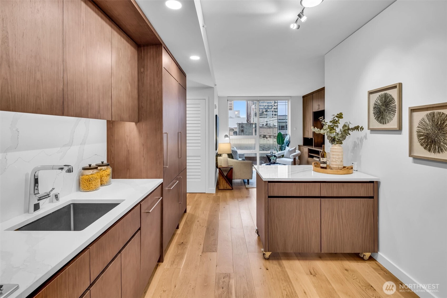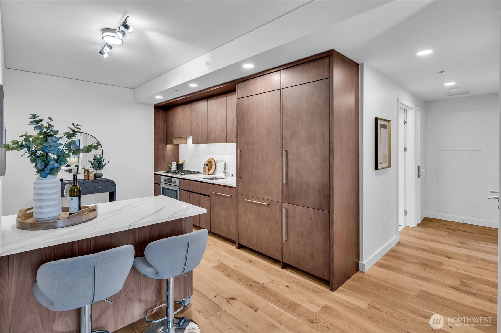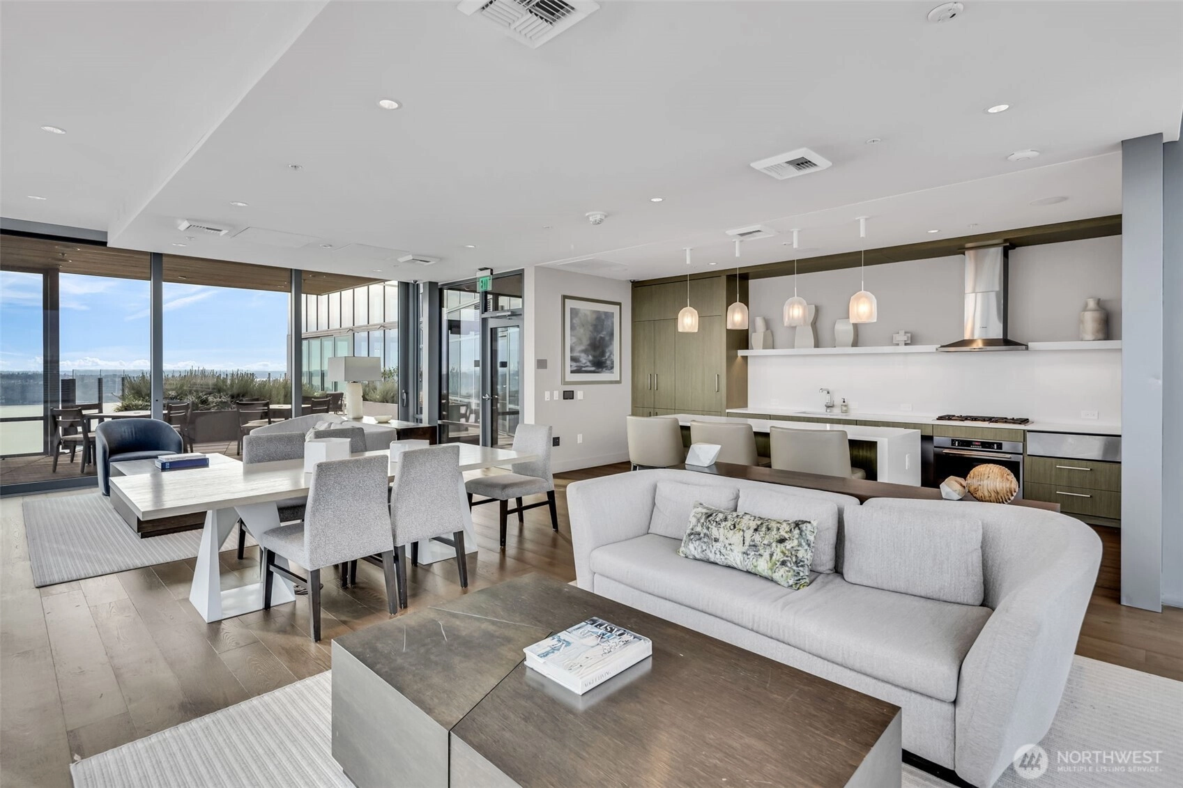 Seattle has a few true headliners, The Emerald is one of them. Rare downtown high rise home that feels thoughtfully curated, effortlessly elevated. Steps to Pike Place Market, Seattle’s reimagined waterfront, wrapped in floor to ceiling glass, tons of natural light, twinkly skyline, city views, 75k in upgrades you feel the second you walk into this spacious one bed + den home. Brand new wide plank hardwoods, custom lighting, scene settings in living, den, primary, bright by day, warm, cinematic at night. Showpiece kitchen, gas cooking, Pedini cabinetry, smart pull outs, built in drawer org, high end Bosch appliances (gas), marble style quartz, custom movable island, equal parts design statement and daily workhorse. Custom built in bookcases, integrated under cabinet lighting, den/office is the real deal, true bonus room for work or creative studio. Exceptional stg, huge walk-in custom closets and built-ins, everything has a place. Spacious primary w/large CC walk in, spa like en suite (think lavish hotel level feel) Hardwired sun shades, blackout shades for real rest. Central AC, sleek LG W/D, Latch keyless entry. Residents enjoy professional 24/7 concierge, executive level fitness, yoga, pet run, pet spa, guest suite, onsite electric carshare, full floor rooftop lounge, indoor outdoor spaces, panoramic views of the Sound, Mt. Rainier, Olympics and unreal Seattle skyline. Over 75k in handsome interior upgrades. Living at The Emerald in the Emerald City just hits different.