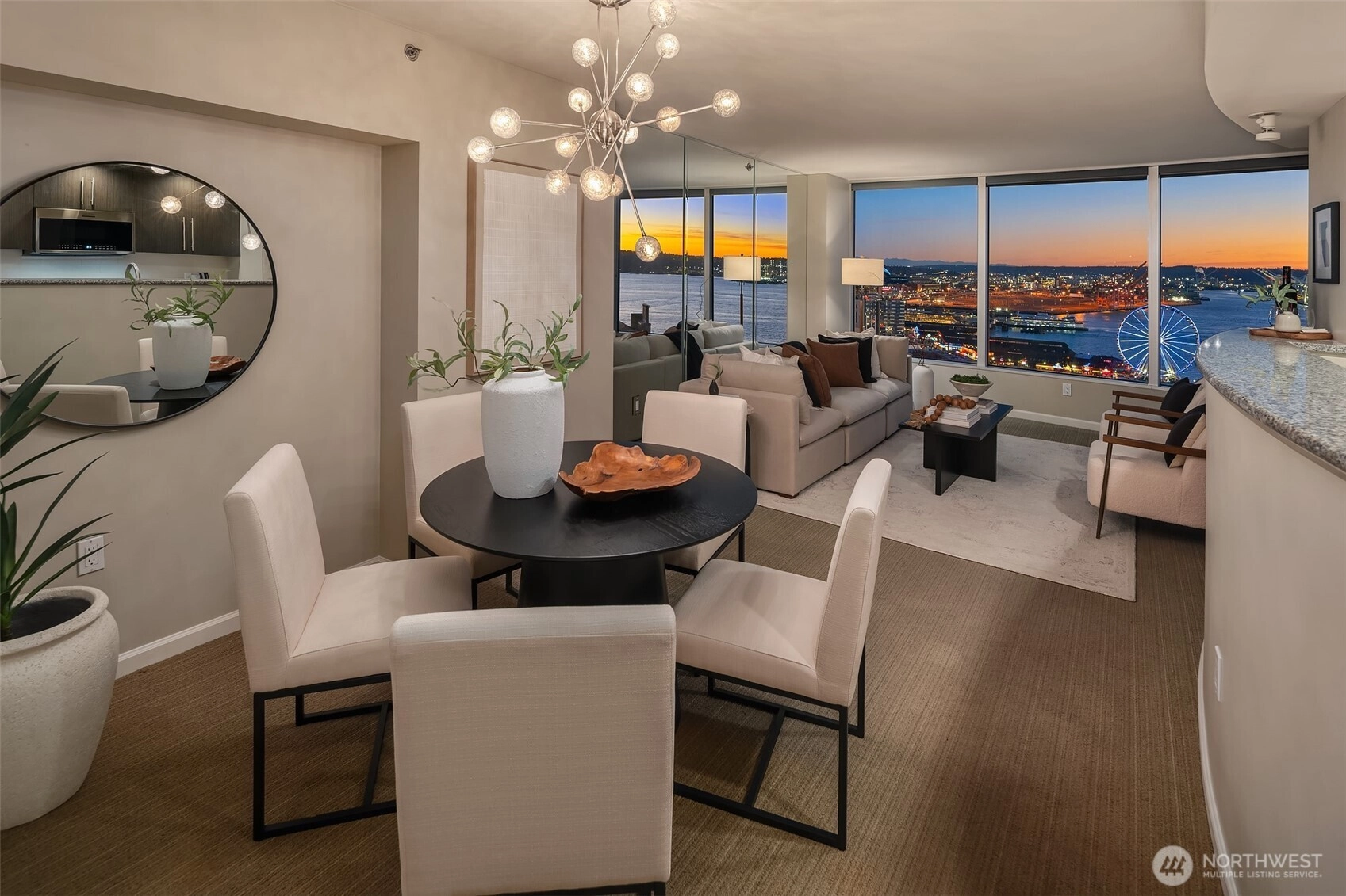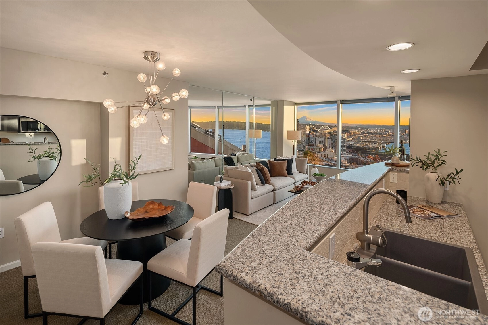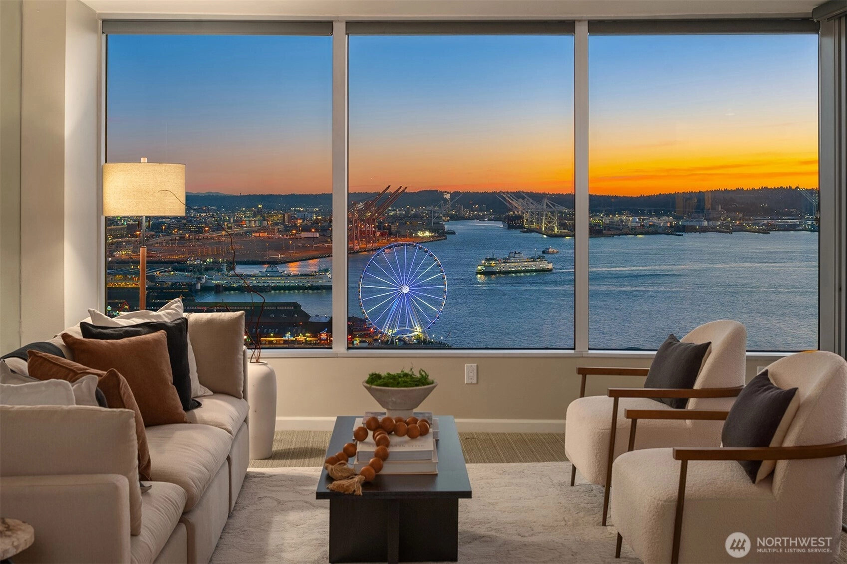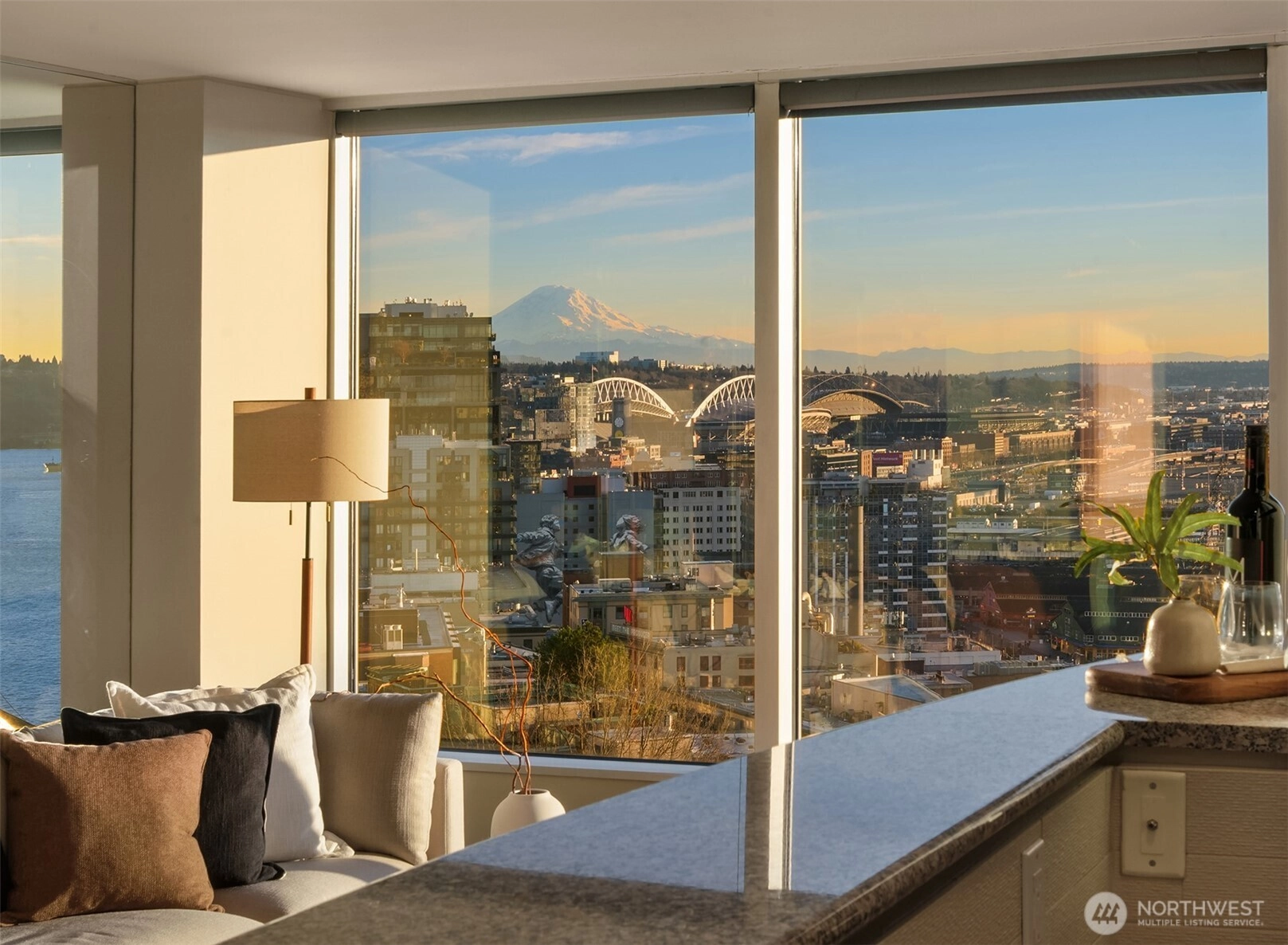 Rare offering at One Pacific Tower. The highest floor plan of its kind in this prized location offers spectacular protected views overlooking the Pike Place Market, the Ferris Wheel, Elliott Bay, the ferries, and beyond to Mt. Rainier and the stadiums. This move-in-ready home offers an elegant en-suite primary bedroom with a view of Mt. Rainer through the large balcony, plus an additional 3/4 bath and non-conforming second bedroom with a large closet, offering flexibility for an office, exercise space or guest bed. Updated kitchen includes stainless steel front Subzero, new appliances and cabinets. Open and airy floor plan opens to sunny balcony and unobstructed views. A/C, washer /dryer and fresh paint. Two deeded parking spaces (tandem) 420 & 421, and a large balcony. Rented storage is available in the building. 24-hour door staff, on-site manager, pool, spa, gym, meeting space, and outdoor terrace.