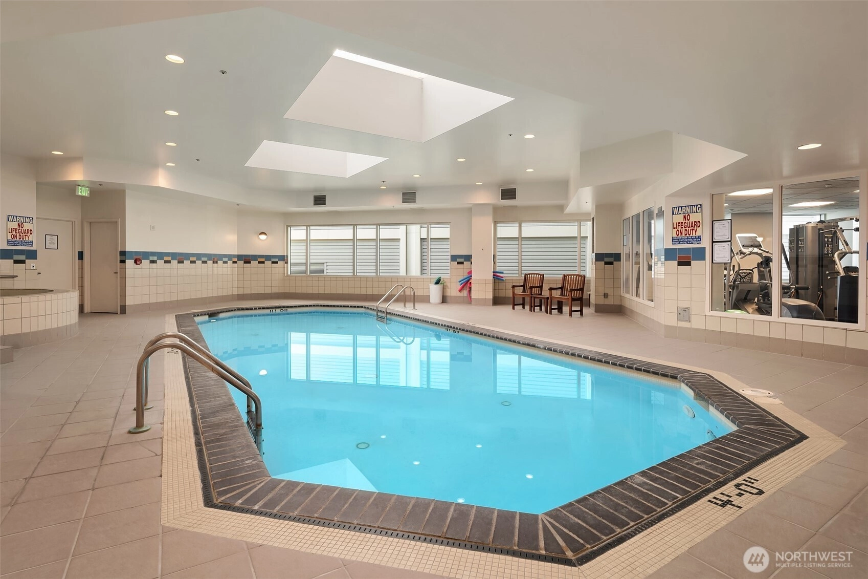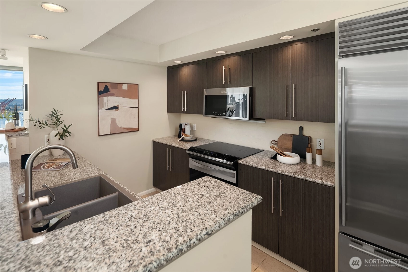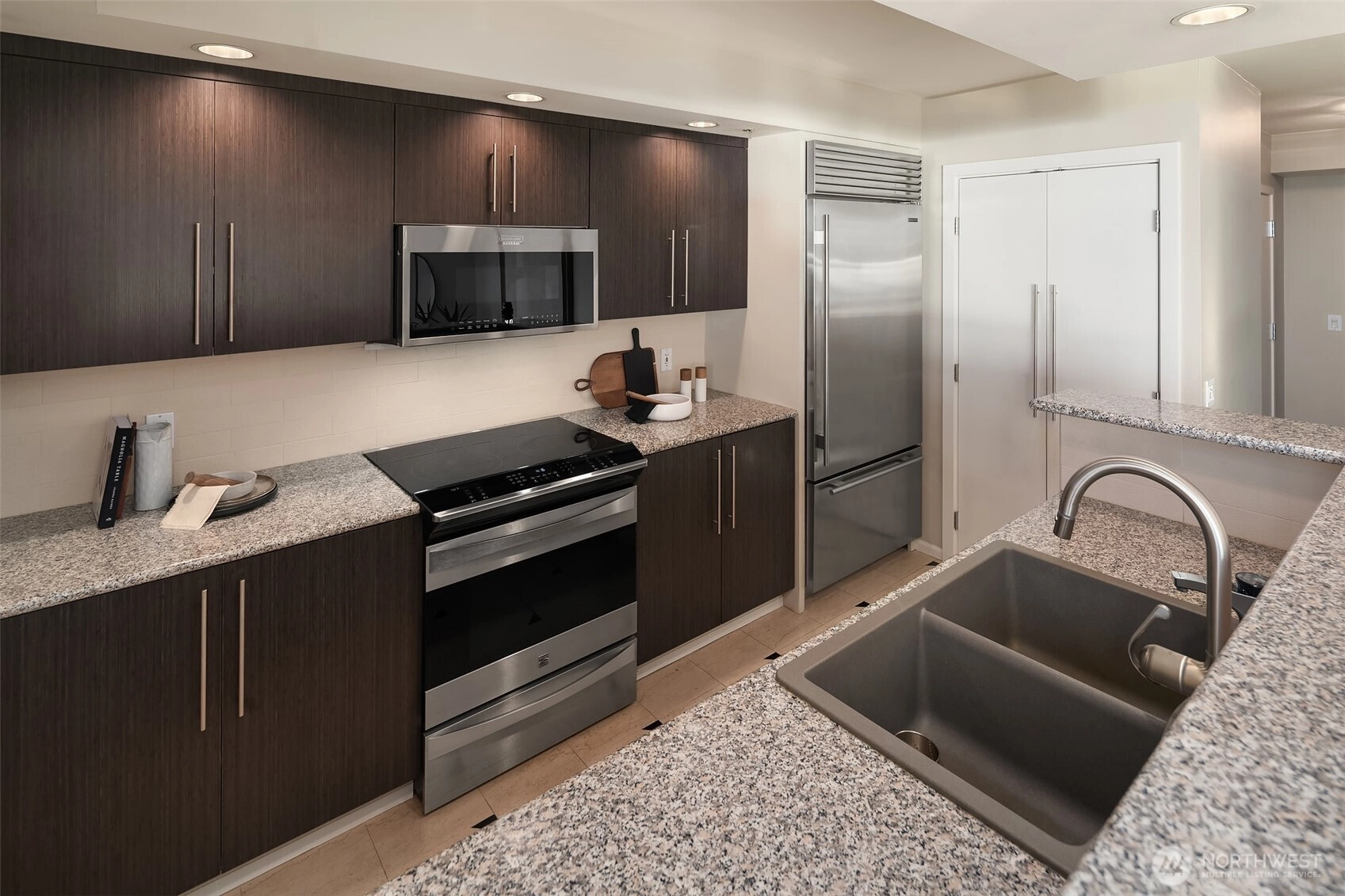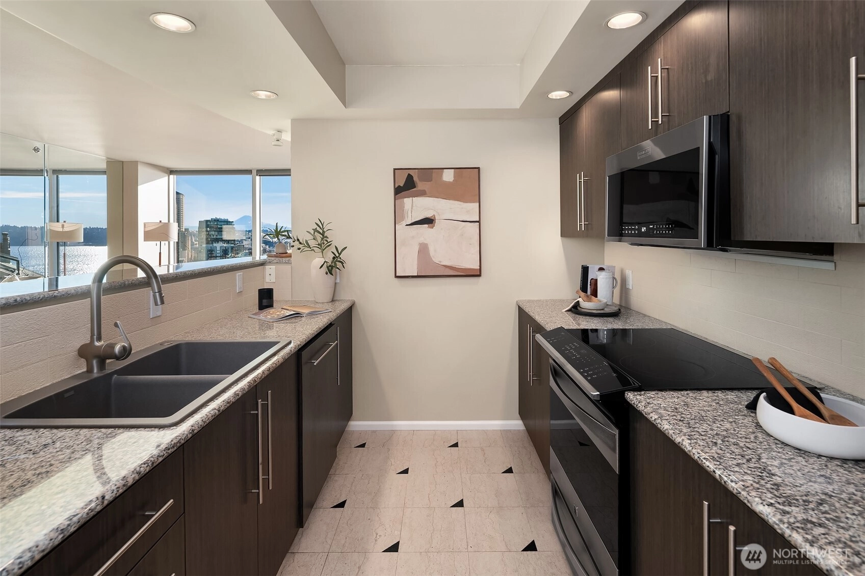 Rare offering at One Pacific Tower. The highest floor plan of its kind in this prized location offers spectacular protected views overlooking the Pike Place Market, the Ferris Wheel, Elliott Bay, the ferries, and beyond to Mt. Rainier and the stadiums. This move-in-ready home offers an elegant en-suite primary bedroom with a view of Mt. Rainer through the large balcony, plus an additional 3/4 bath and non-conforming second bedroom with a large closet, offering flexibility for an office, exercise space or guest bed. Updated kitchen includes stainless steel front Subzero, new appliances and cabinets. Open and airy floor plan opens to sunny balcony and unobstructed views. A/C, washer /dryer and fresh paint. Two deeded parking spaces (tandem) 420 & 421, and a large balcony. Rented storage is available in the building. 24-hour door staff, on-site manager, pool, spa, gym, meeting space, and outdoor terrace.