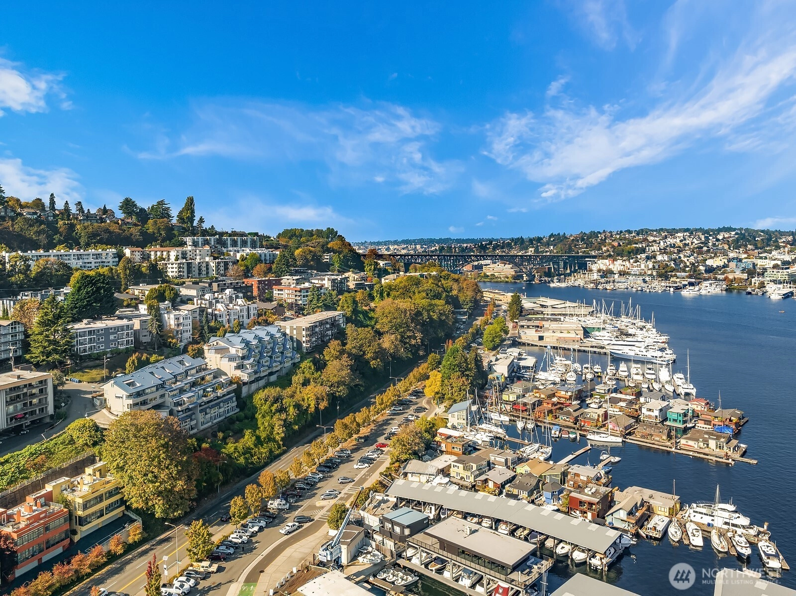 Unbelievable Lake Union & Cascade mountains views, Elegant 2-level condo with 2 primary suites, vaulted ceilings, 2-story windows pour in lots of natural light into all spaces. Huge open kitchen & living areas are ideal for entertaining or cozy up to the gas fireplace. Main level has an office/den & large bonus space. Balconies on both levels! Walking distance to SLU waterfront, Fremont, Amazon, Google, Meta offices! Easy access to I-5 & 99. This unit comes with 1 secured parking spot & a storage unit.