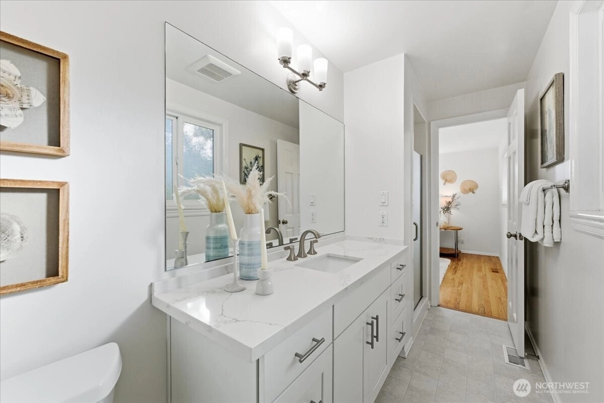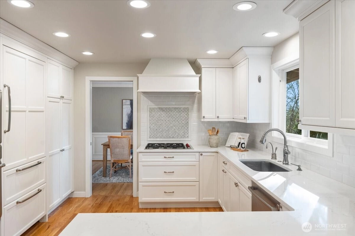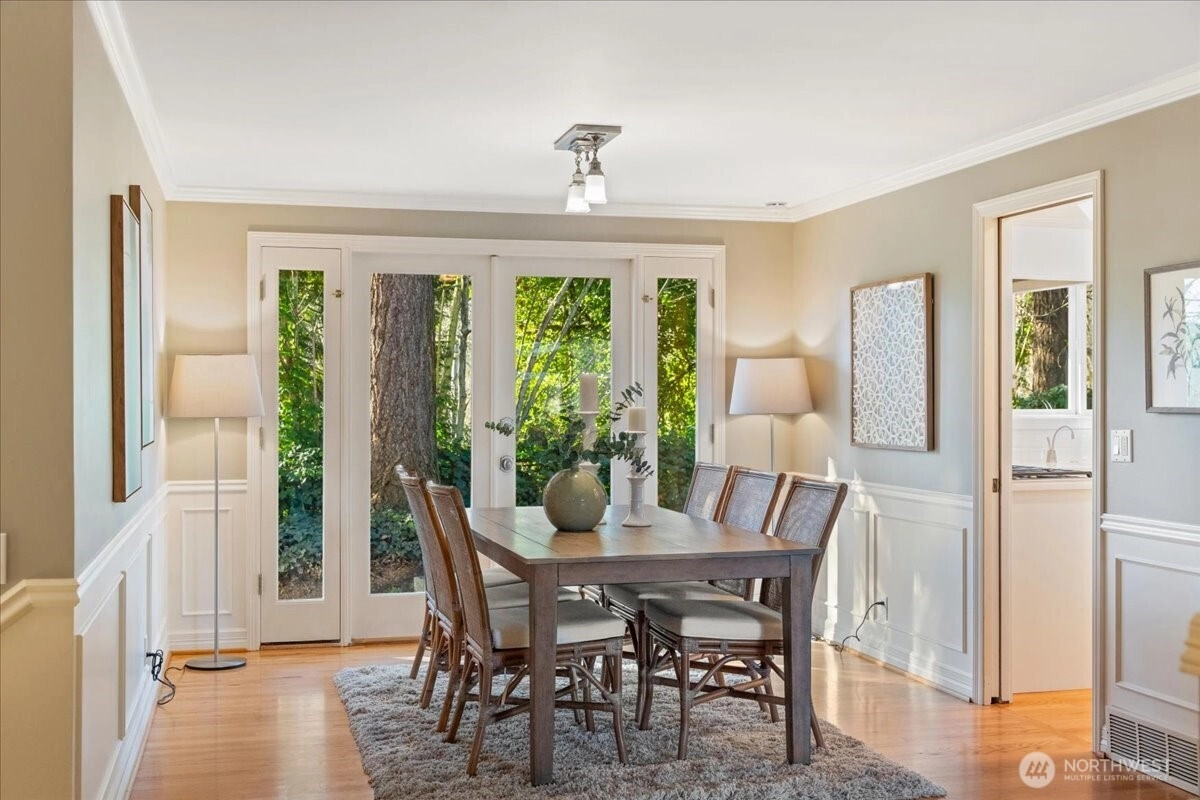 Beautifully updated Mid-Century home in a coveted Mid-Island location. Tucked on a quiet street near Parkwood, this move-in-ready residence offers an ideal floorplan for everyday living and effortless entertaining. The inviting living room features charming bay windows, a cozy fireplace, and seamless flow to the dining area with French doors opening to the backyard. The adjacent chef’s kitchen, fully remodeled in 2018, showcases premium appliances including a Wolf range, Sub-Zero refrigerator, Thermador oven, Bosch dishwasher, separate wine fridge, plus Bellmont cabinetry and luxury tile finishes. Upstairs, you’ll find three light-filled bedrooms and a 1.75 bath layout all on one level, with beautiful hardwood floors across the main and upper levels. The spacious lower level offers an oversized rec room, a versatile fourth bedroom or office, an adjacent bath, and a separate entry—perfect for guests, multigenerational living, or work-from-home. Recent upgrades include central AC, a built-in EV charger, fresh interior paint, new lower-level carpet, and a new primary bath vanity. Outside, enjoy professionally landscaped, low-maintenance grounds, a fully fenced backyard, patio off the kitchen for morning coffee or grilling, and flat areas ideal for play or gardening. All just minutes to parks, transit, and top-rated Mercer Island schools. With a fantastic location, great layout, and modern upgrades, this home checks all the boxes!