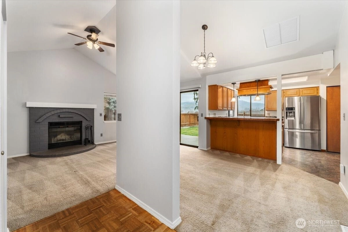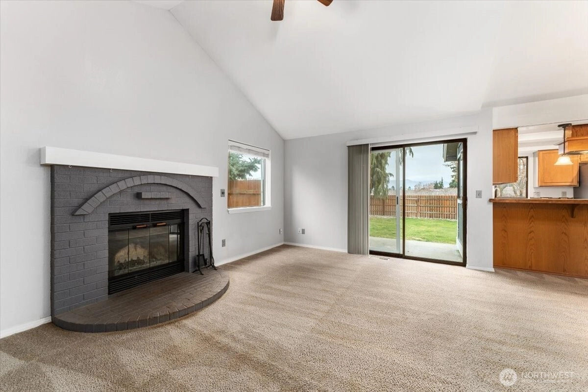 Easy-living rambler set on a rare corner lot spanning over a quarter acre, offering space, privacy, and flexibility. This 3-bedroom, 2-bath home features a welcoming family room with a wood-burning fireplace, vaulted ceilings, and updated appliances. Step outside to a private patio well suited for gardening and outdoor enjoyment. The irrigated, fully fenced backyard offers mountain views and an expansive side yard. Ample parking includes dedicated RV or recreational vehicle space with 30-amp power hookups, adding convenience. An easy layout, expansive lot, and accessible location make this home an excellent opportunity for owner-occupied living or investment. Additional updates include a new heat pump in 2025 and a roof that is approximately 9 years old.