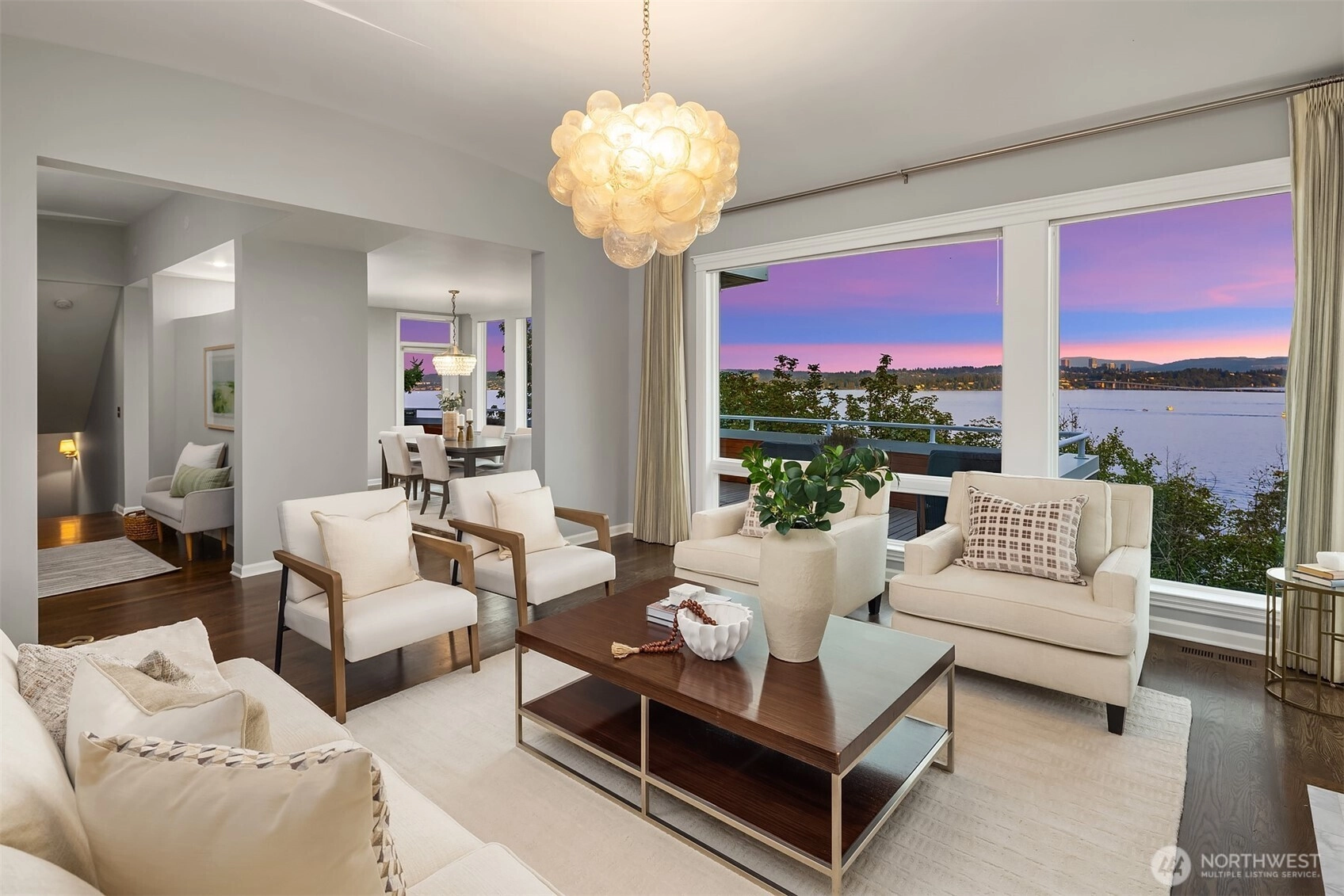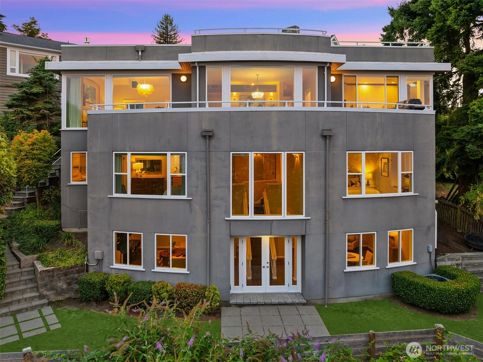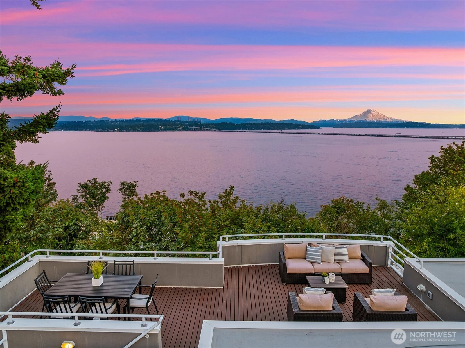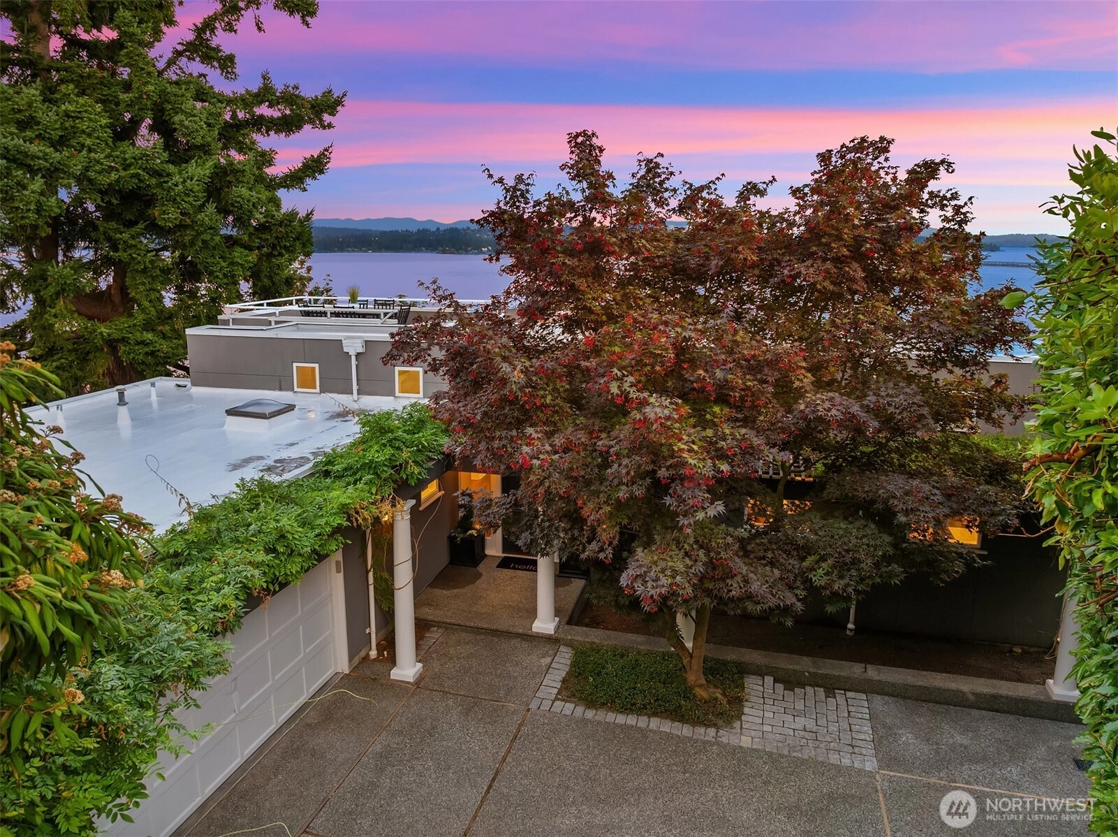 Privacy is paramount as you head down a private drive to this expanded daylight rambler with panoramic views of Mt Rainier and Lake Washington, from almost every room. The expansive main floor features formal areas with updated finishes, flowing into each other and extending to a curved deck—perfect for entertaining. The rooftop deck enhances the experience with endless sky and water views. All bedrooms, including the primary suite, are located on the same floor. The daylight basement provides versatile spaces, ideal for a recreation, media, or gym and opens onto a patio and lawn. A 2-car attached garage ensures convenience, and the nearby beach club adds extra amenities. A retreat in one of Seattle’s most coveted neighborhoods.