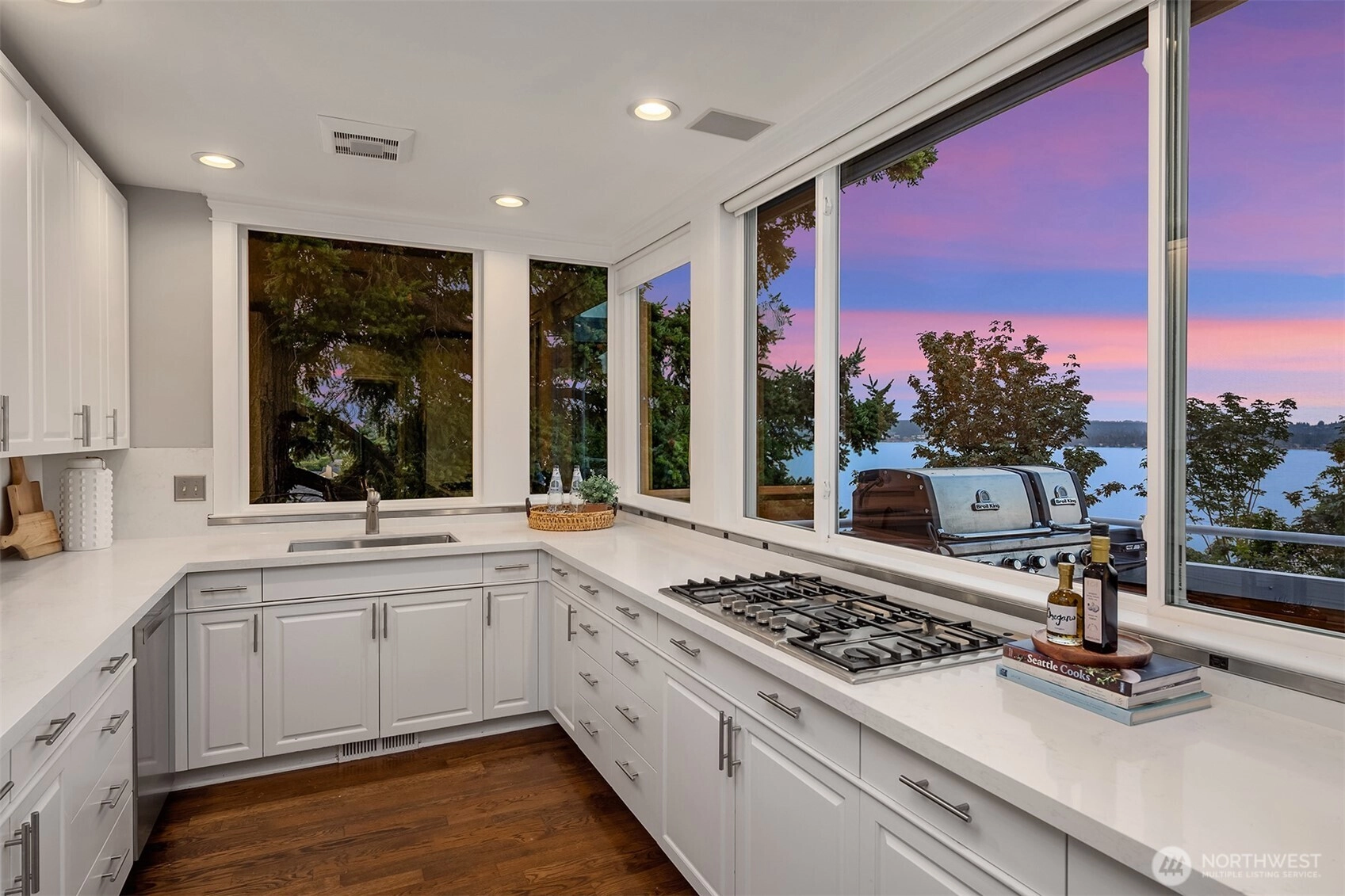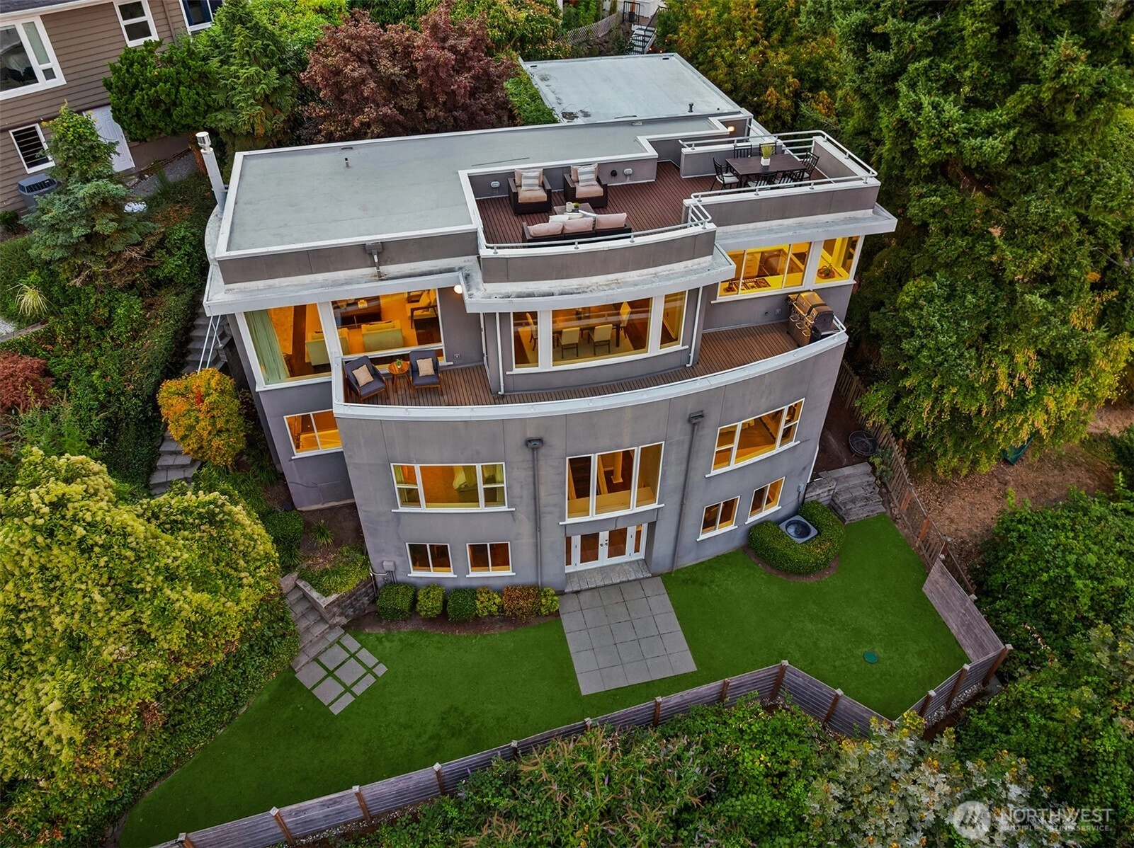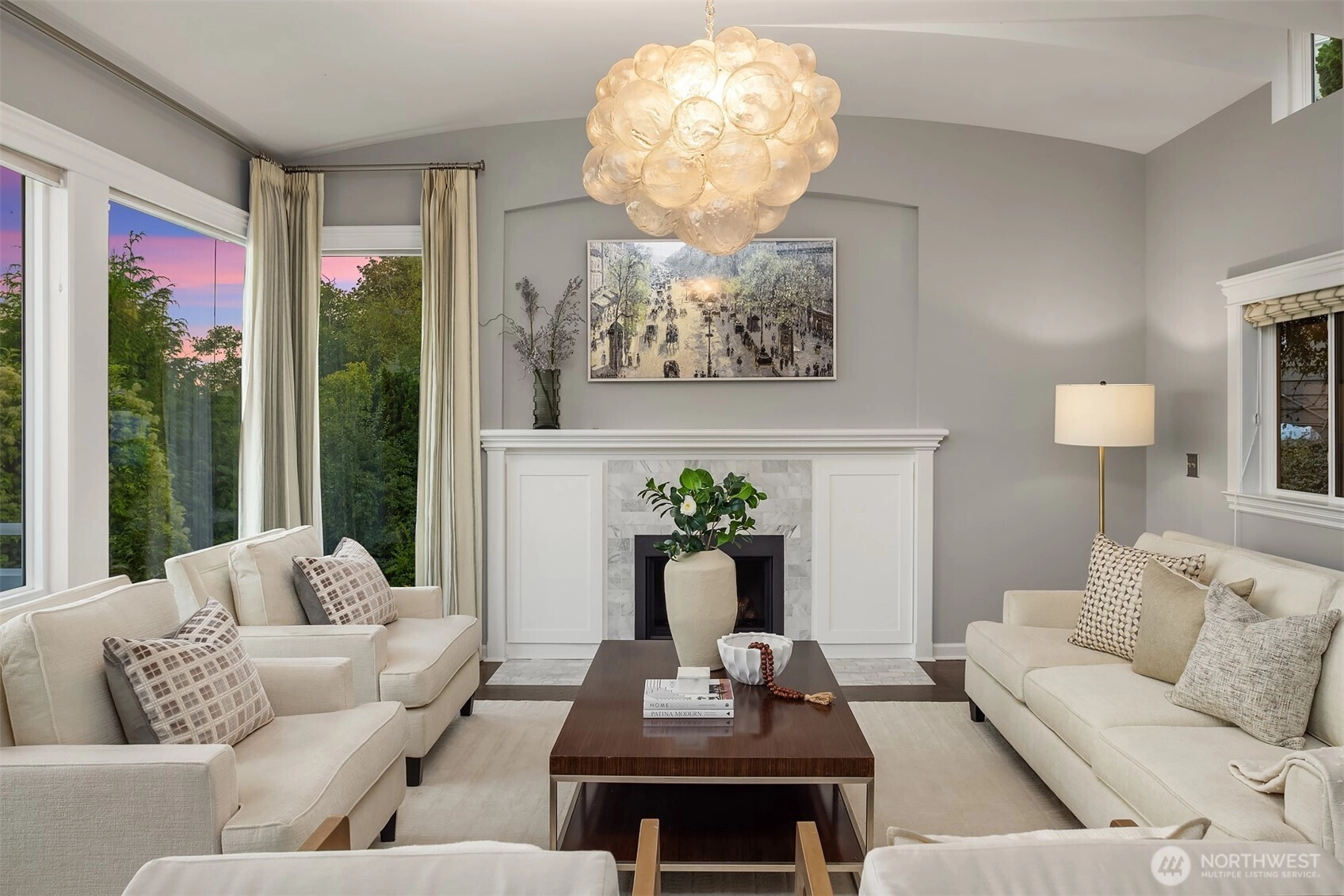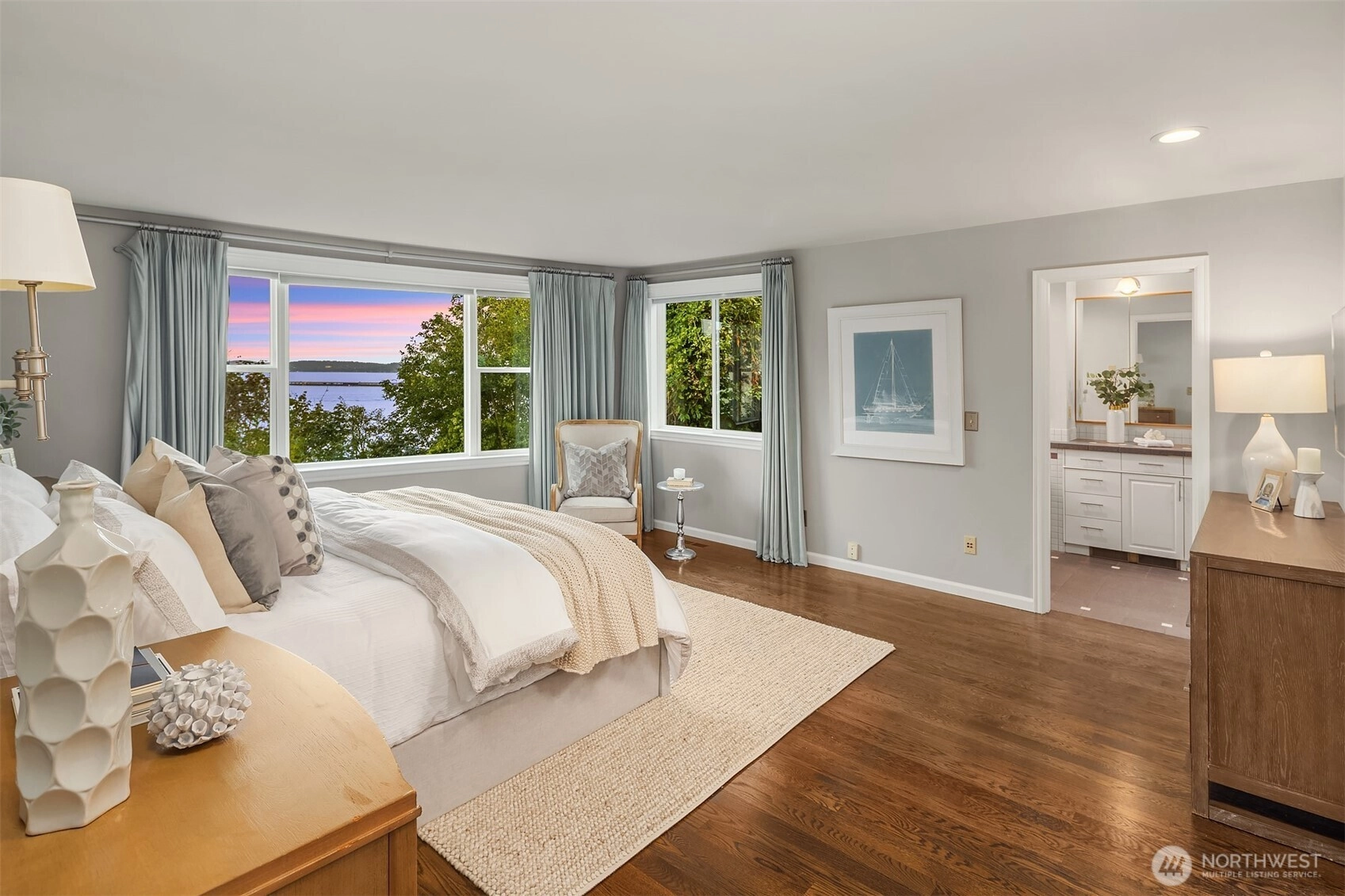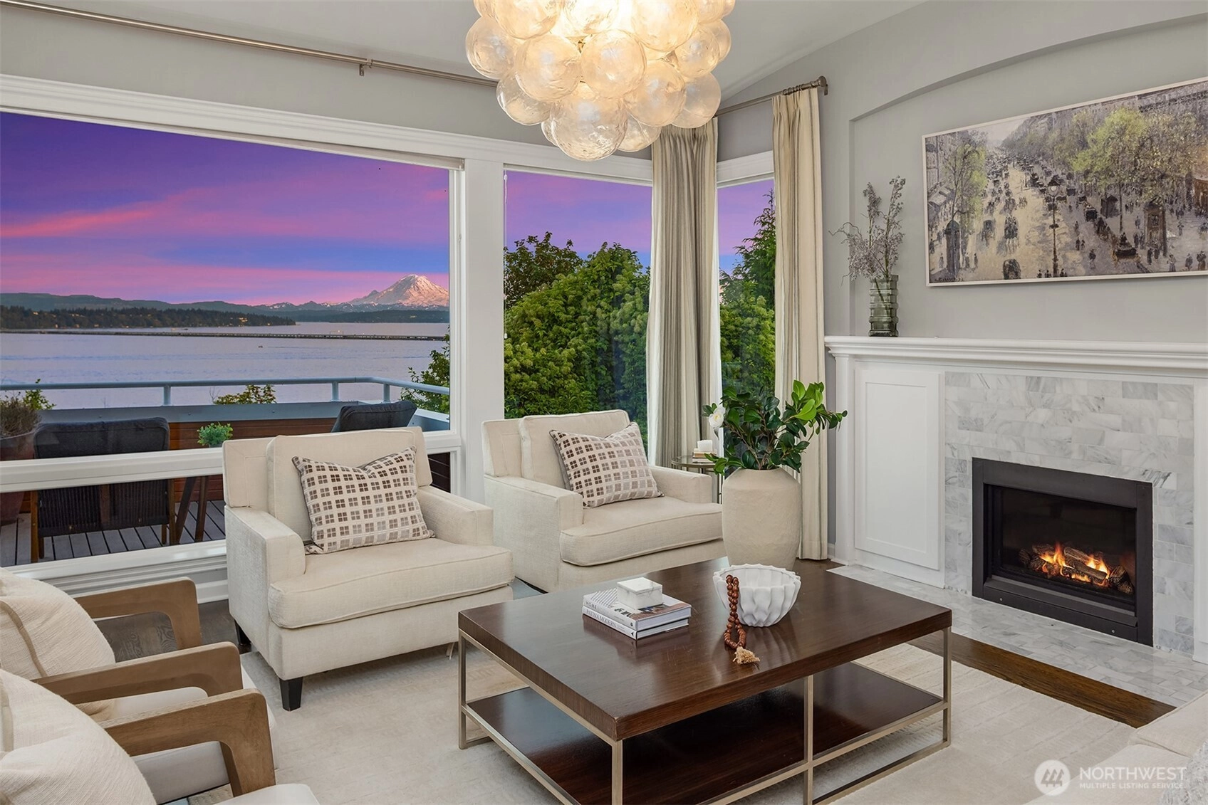 Privacy is paramount as you head down a private drive to this expanded daylight rambler with panoramic views of Mt Rainier and Lake Washington, from almost every room. The expansive main floor features formal areas with updated finishes, flowing into each other and extending to a curved deck—perfect for entertaining. The rooftop deck enhances the experience with endless sky and water views. All bedrooms, including the primary suite, are located on the same floor. The daylight basement provides versatile spaces, ideal for a recreation, media, or gym and opens onto a patio and lawn. A 2-car attached garage ensures convenience, and the nearby beach club adds extra amenities. A retreat in one of Seattle’s most coveted neighborhoods.