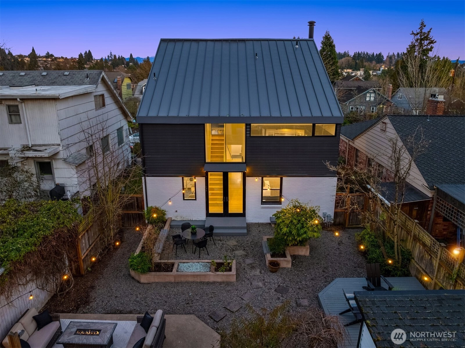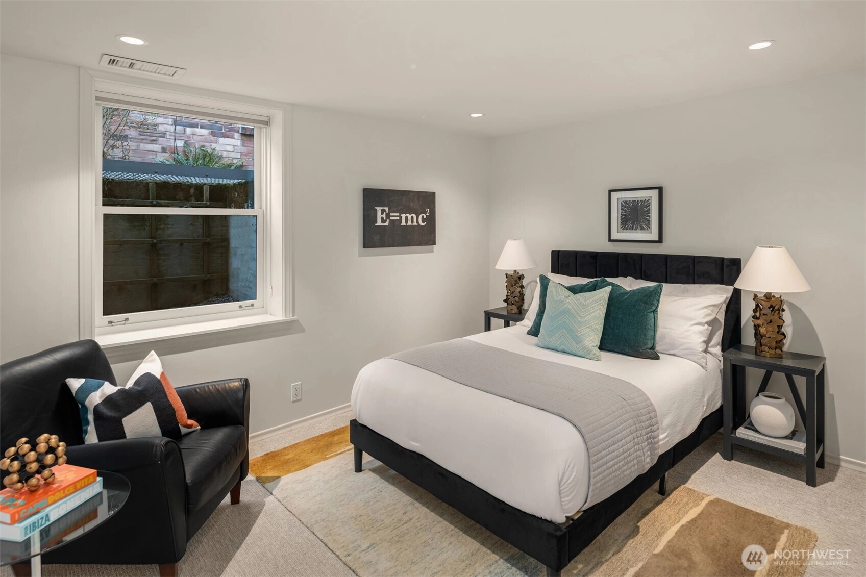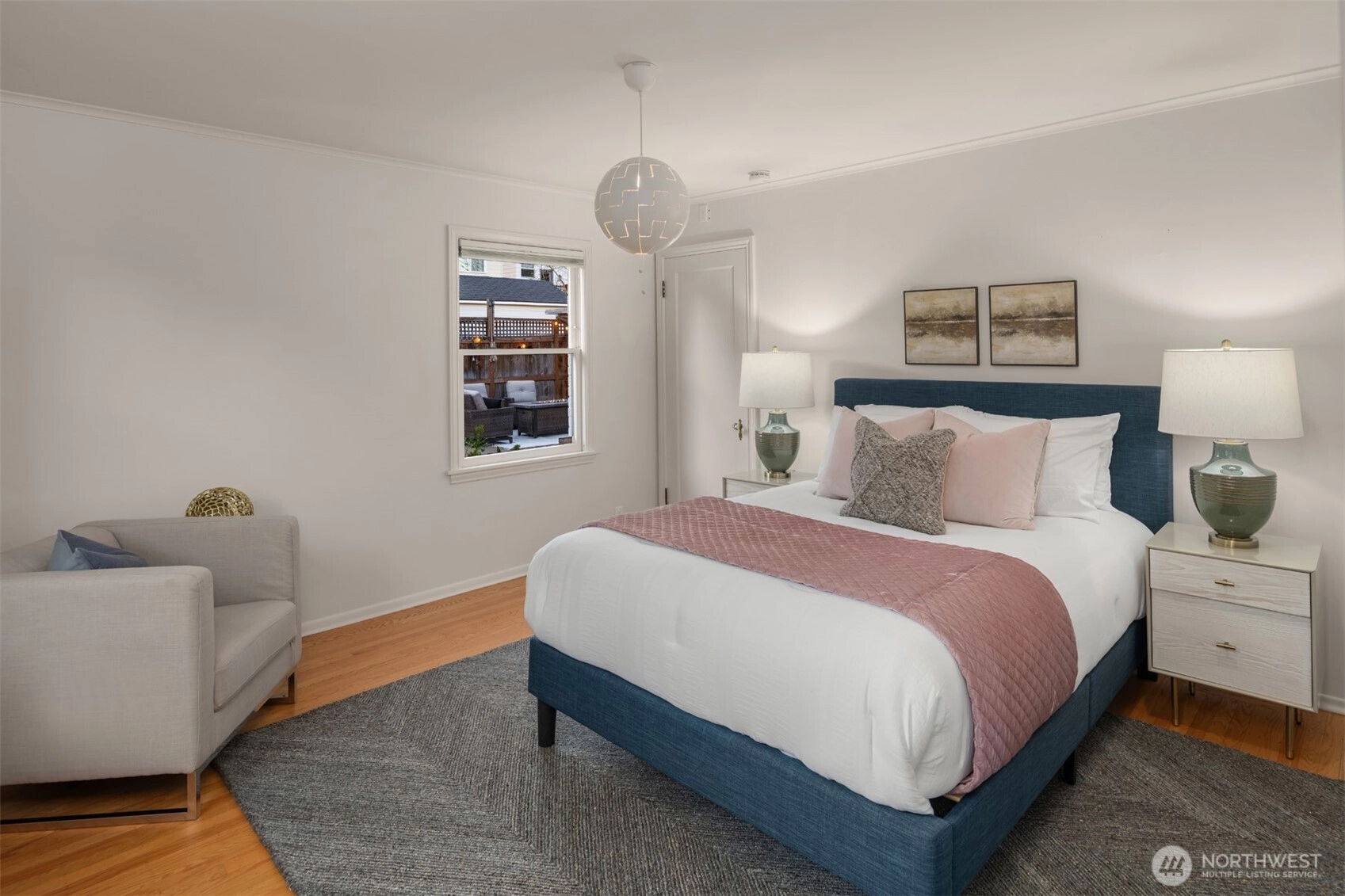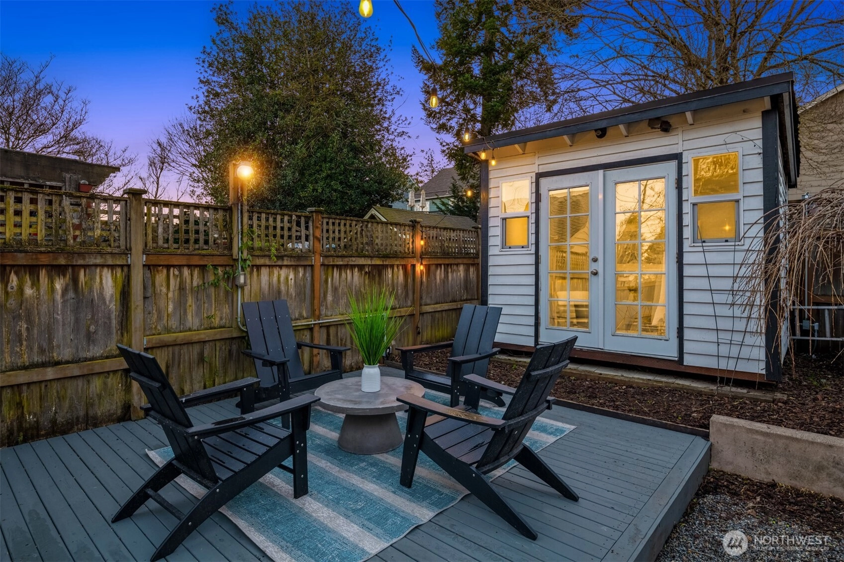 Blending architectural beauty + modern upgrades, Bryant home offers exceptional design at every turn. Refinished hardwoods + fireplace highlight main living area. Kitchen is functional + stylish with stainless appliances + glass-fronted white cabinets. Two bedrooms, including one with ensuite bath, on main floor with additional two bedrooms on finished lower level. Upstairs is serene primary suite with custom closets, soaking tub, monsoon shower + balcony. French doors lead to fenced backyard, deck + separate studio, offering ideal layout for indoor/outdoor living. Attached garage with addt’l off-street parking. Dining, shopping, parks + transit nearby.