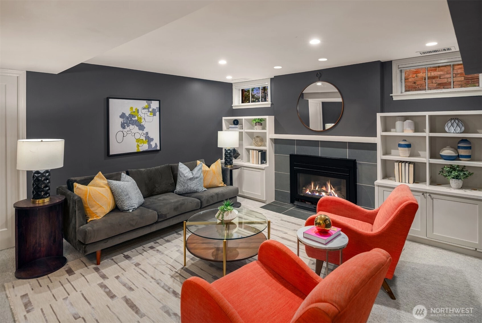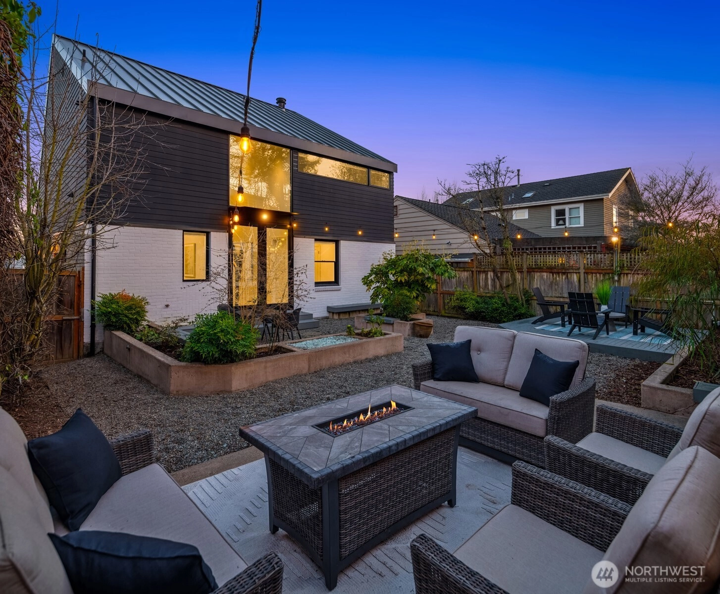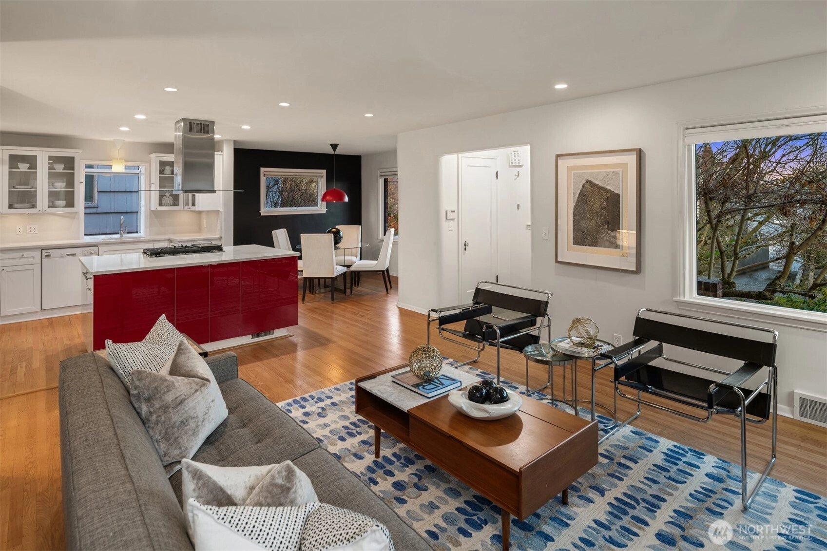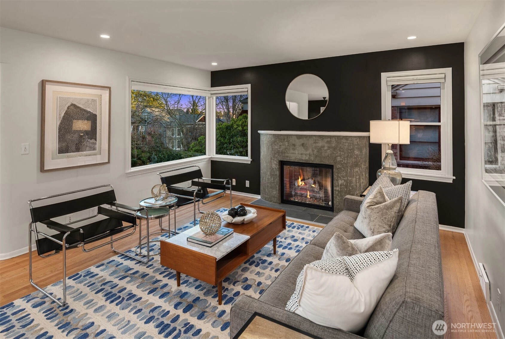 Blending architectural beauty + modern upgrades, Bryant home offers exceptional design at every turn. Refinished hardwoods + fireplace highlight main living area. Kitchen is functional + stylish with stainless appliances + glass-fronted white cabinets. Two bedrooms, including one with ensuite bath, on main floor with additional two bedrooms on finished lower level. Upstairs is serene primary suite with custom closets, soaking tub, monsoon shower + balcony. French doors lead to fenced backyard, deck + separate studio, offering ideal layout for indoor/outdoor living. Attached garage with addt’l off-street parking. Dining, shopping, parks + transit nearby.