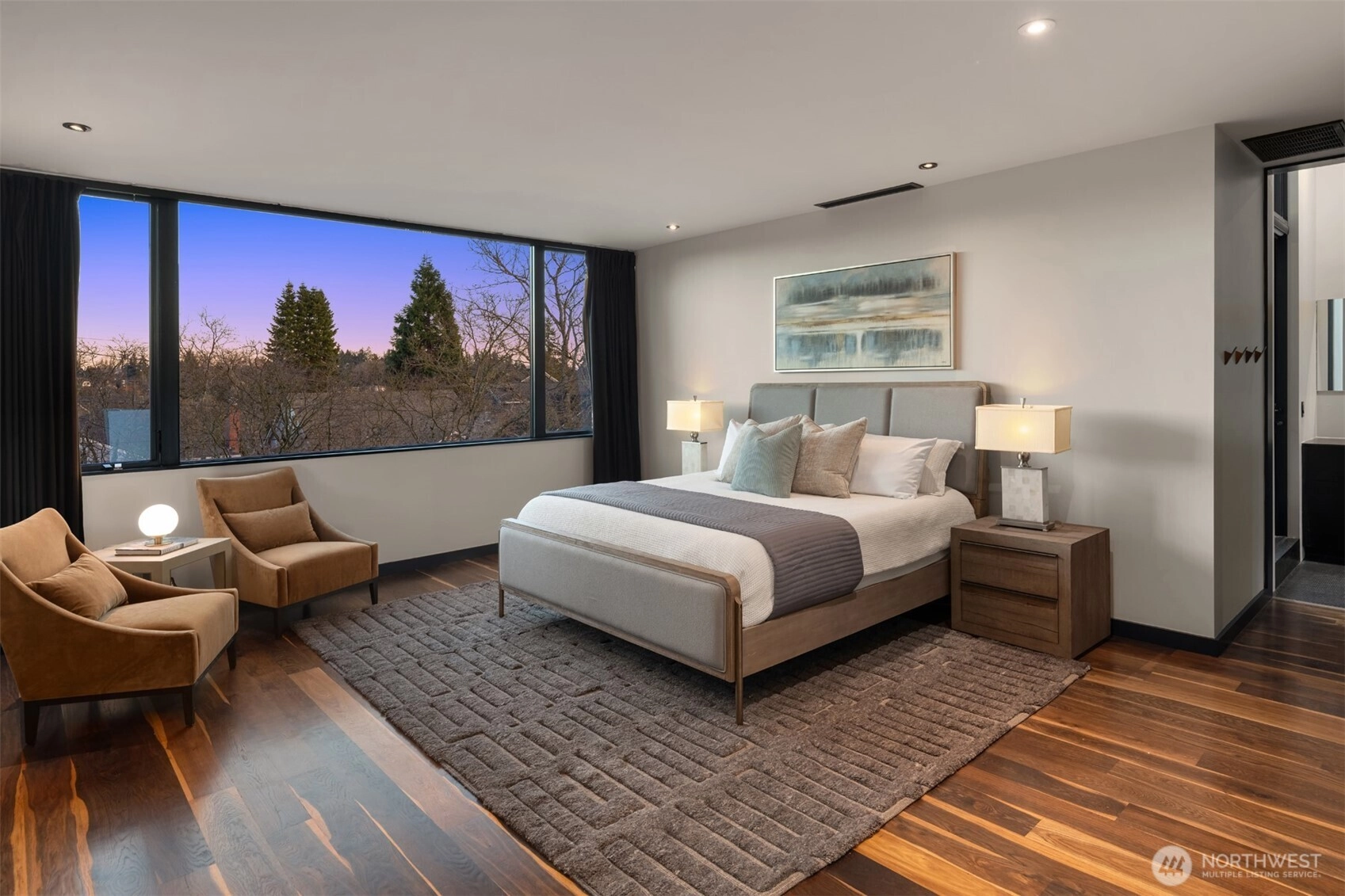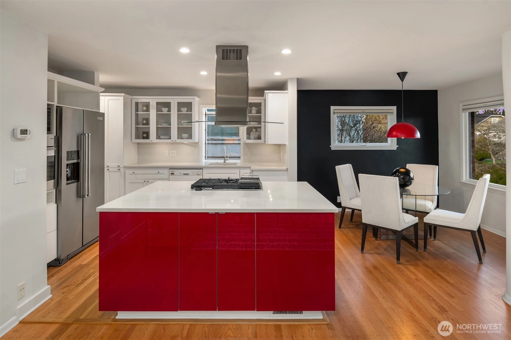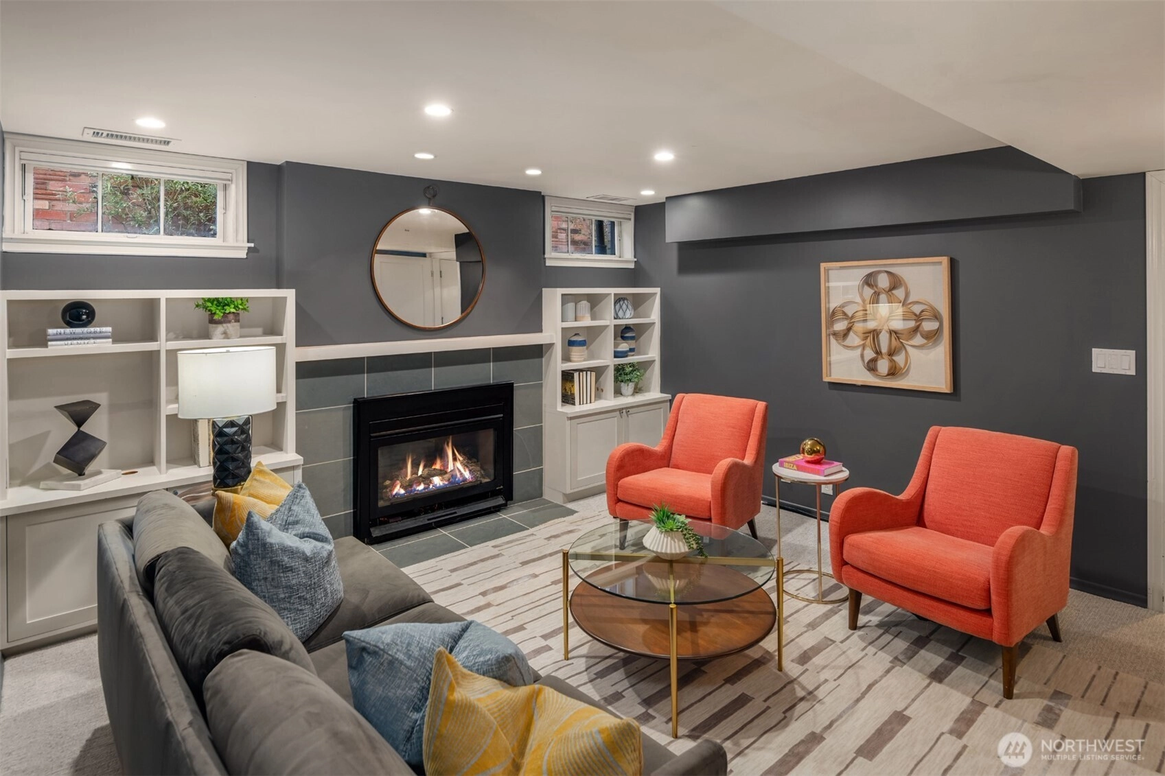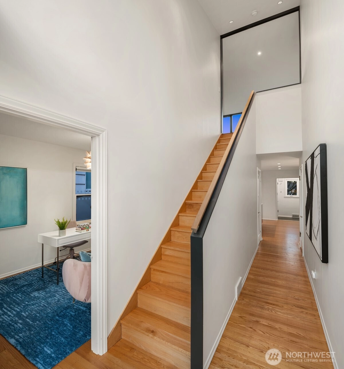 Blending architectural beauty + modern upgrades, Bryant home offers exceptional design at every turn. Refinished hardwoods + fireplace highlight main living area. Kitchen is functional + stylish with stainless appliances + glass-fronted white cabinets. Two bedrooms, including one with ensuite bath, on main floor with additional two bedrooms on finished lower level. Upstairs is serene primary suite with custom closets, soaking tub, monsoon shower + balcony. French doors lead to fenced backyard, deck + separate studio, offering ideal layout for indoor/outdoor living. Attached garage with addt’l off-street parking. Dining, shopping, parks + transit nearby.