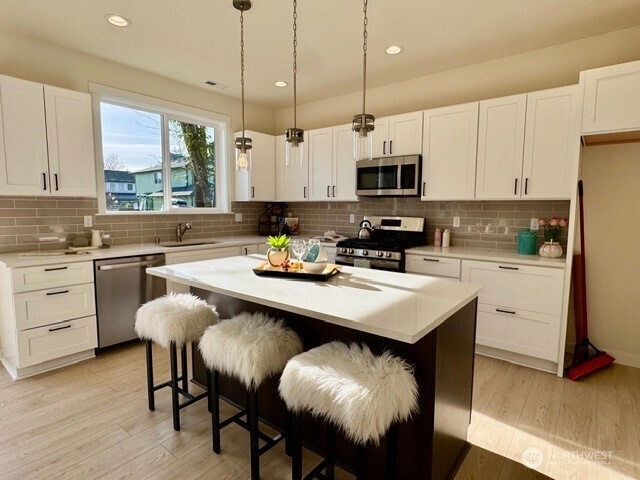 NEW CONSTRUCTION in SeaTac! Rare opportunity on a huge lot with outstanding future potential for a DADU, pool, sport court, gardens, and more. Tucked away on a quiet dead-end lane, with the street scheduled to be fully repaved—offering privacy, minimal traffic, and long-term appeal. This 2,468 SF modern home showcases thoughtful design and quality craftsmanship throughout. The covered front porch welcomes you into a cozy living room and an open-concept great room featuring a gas fireplace—perfect for everyday living and entertaining. The stylish kitchen is a standout, offering a large island, butler’s pantry, and a spacious dining area that opens directly to the patio, creating seamless indoor/outdoor living with expansive back and side yards. The main level also includes a powder room and a functional mudroom for added convenience. Elegant LVP flooring and high-end finishes are featured throughout the main living areas, providing both durability and modern style. Upstairs, enjoy a generous primary suite, four additional bedrooms, a full bath, and a dedicated laundry room—ideal for today’s flexible living needs. The home is complete with a two-car garage equipped with an EV charger, adding convenience for electric vehicle owners and future-ready living. Ideally located near Sea-Tac Airport, major freeways, restaurants, shopping, and everyday amenities, offering excellent accessibility while still feeling tucked away. Home ready for occupancy in early March.