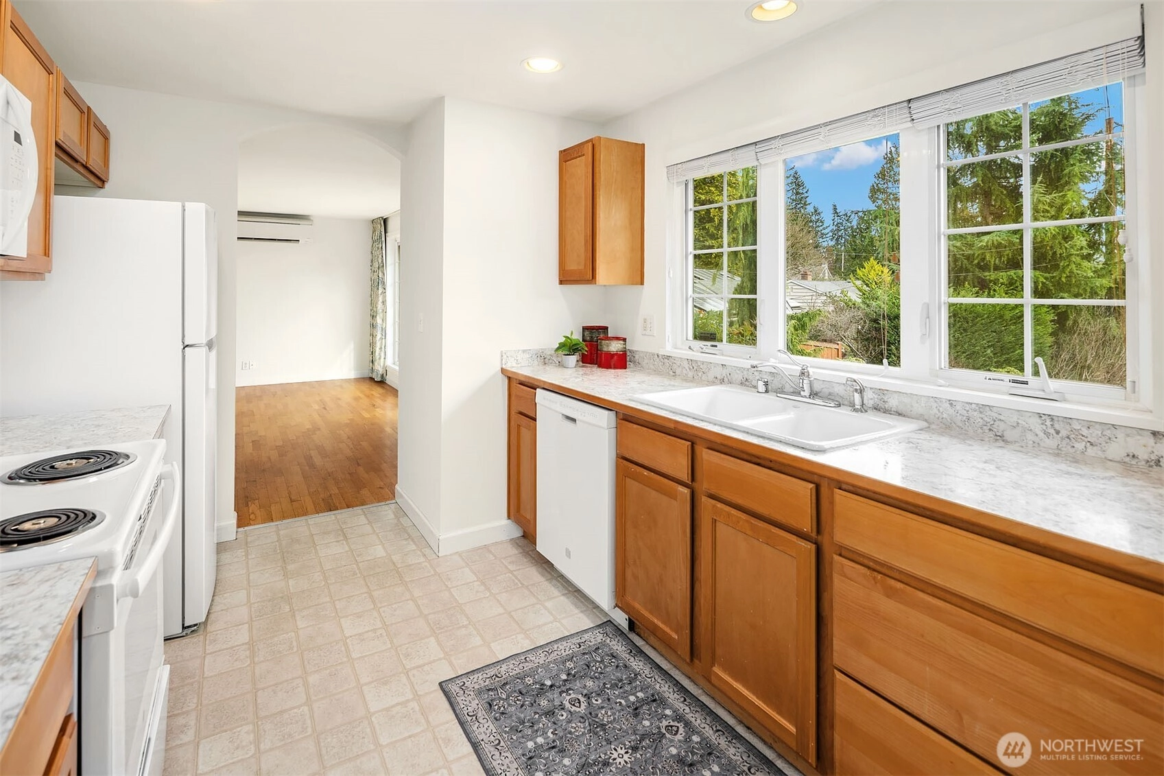 This charming home offers comfortable one-level living in a quiet cul-de-sac just blocks from Lake Ballinger, the Interurban Trail and Nile Shrine Golf Course. Enjoy a variety of outdoor recreation opportunities while remaining conveniently close to shopping, freeways, the light rail station, and the ferry terminal. The living room includes a large picture window showcasing brilliant sunrises and views of the beautifully landscaped front yard and the tops of the Cascade Mountains. The dining room is highlighted by rich cherry floors and opens to the light-filled kitchen featuring a pantry with pull-out shelving and a newer refrigerator. The primary bedroom offers a private bathroom and a slider to the backyard. Hardwood floors line the living room, dining room and all 3 bedrooms. Ductless heat and air conditioning provide year-round comfort. Enjoy peaceful outdoor living in the fully fenced backyard with landscaped garden beds and a patio. Finished, oversized single-car garage with workbench and access to the backyard. Ample off-street parking with room for a boat and/or small RV. New interior and garage paint. Excellent Edmonds schools.