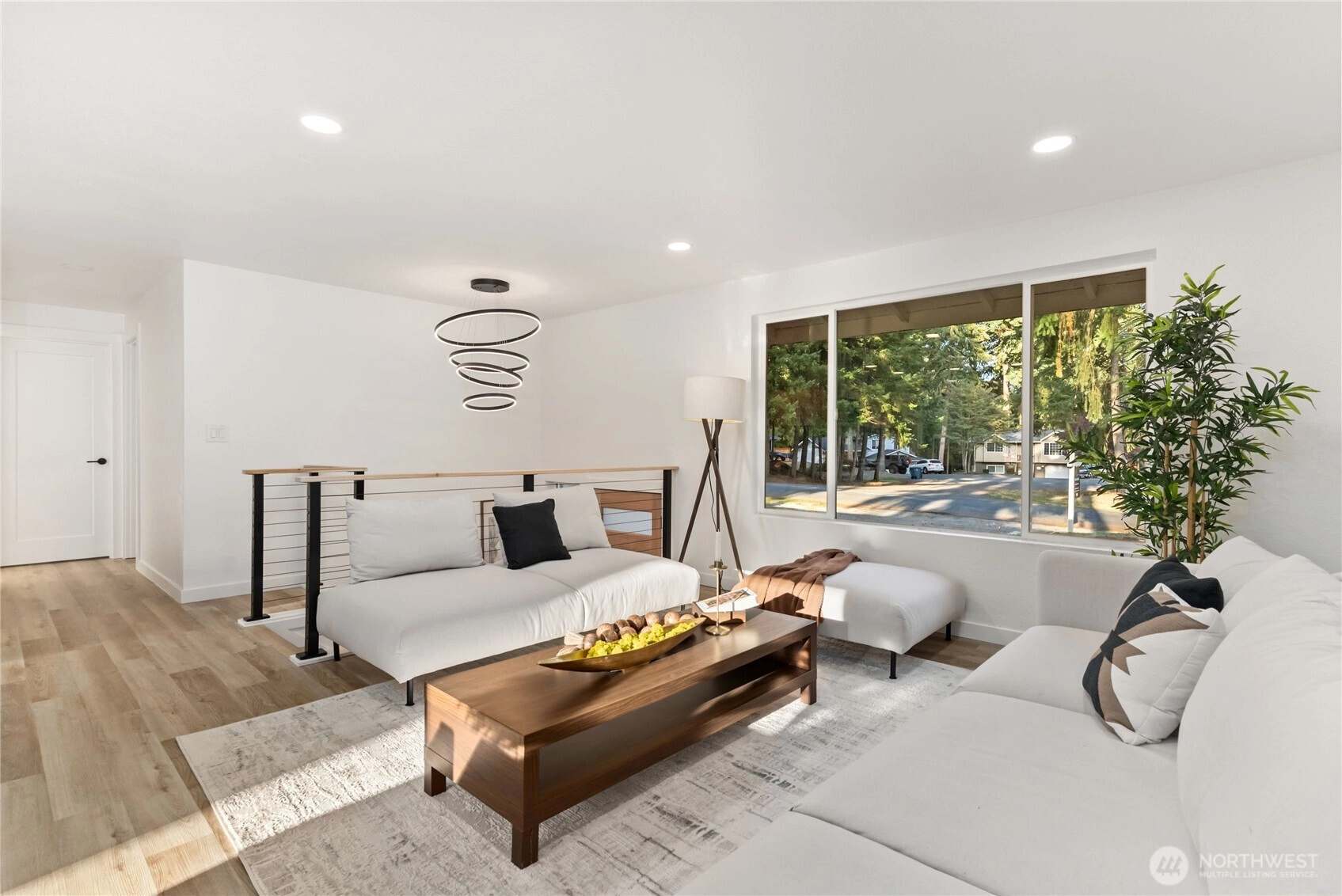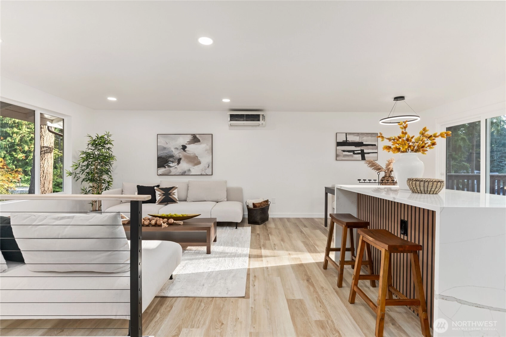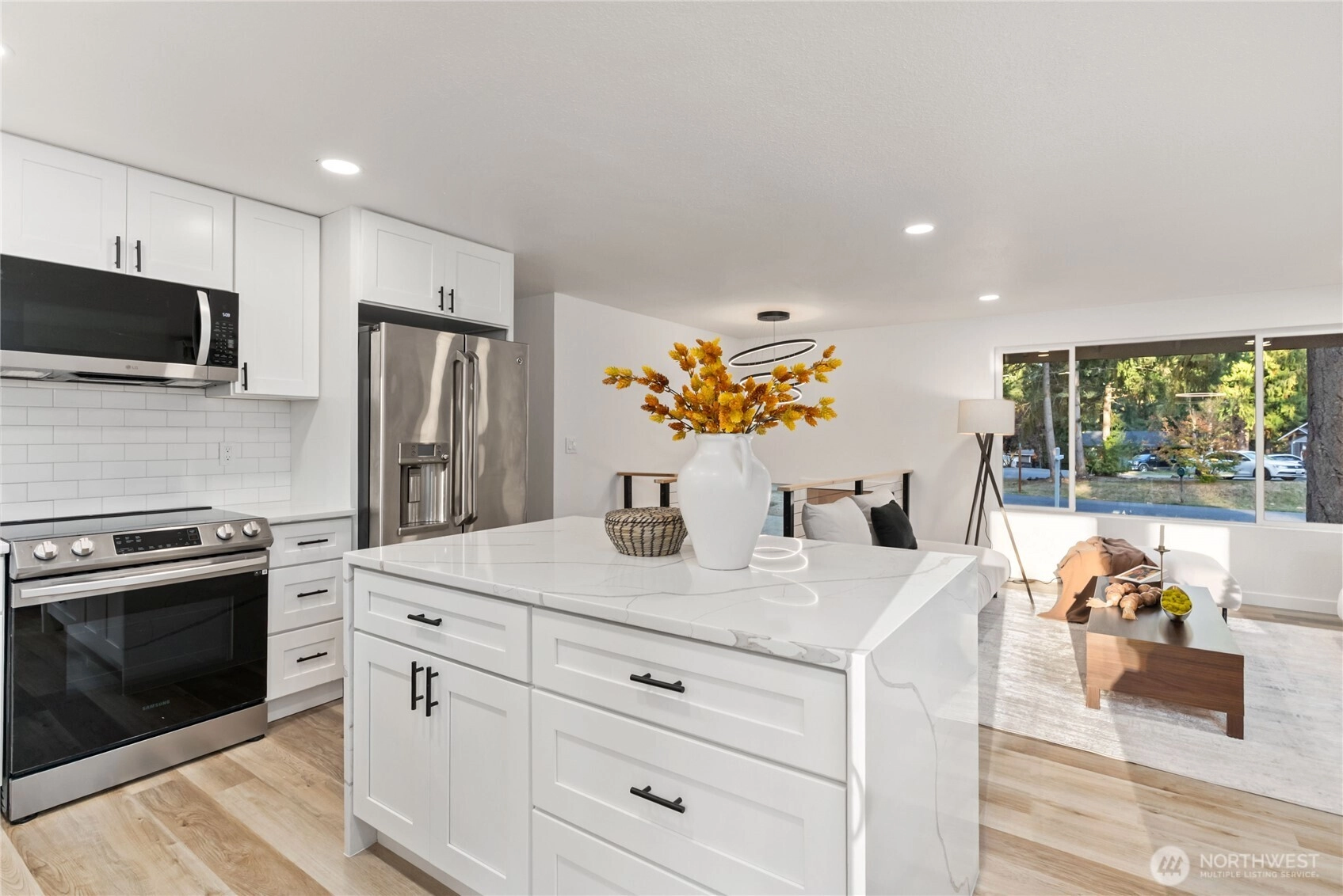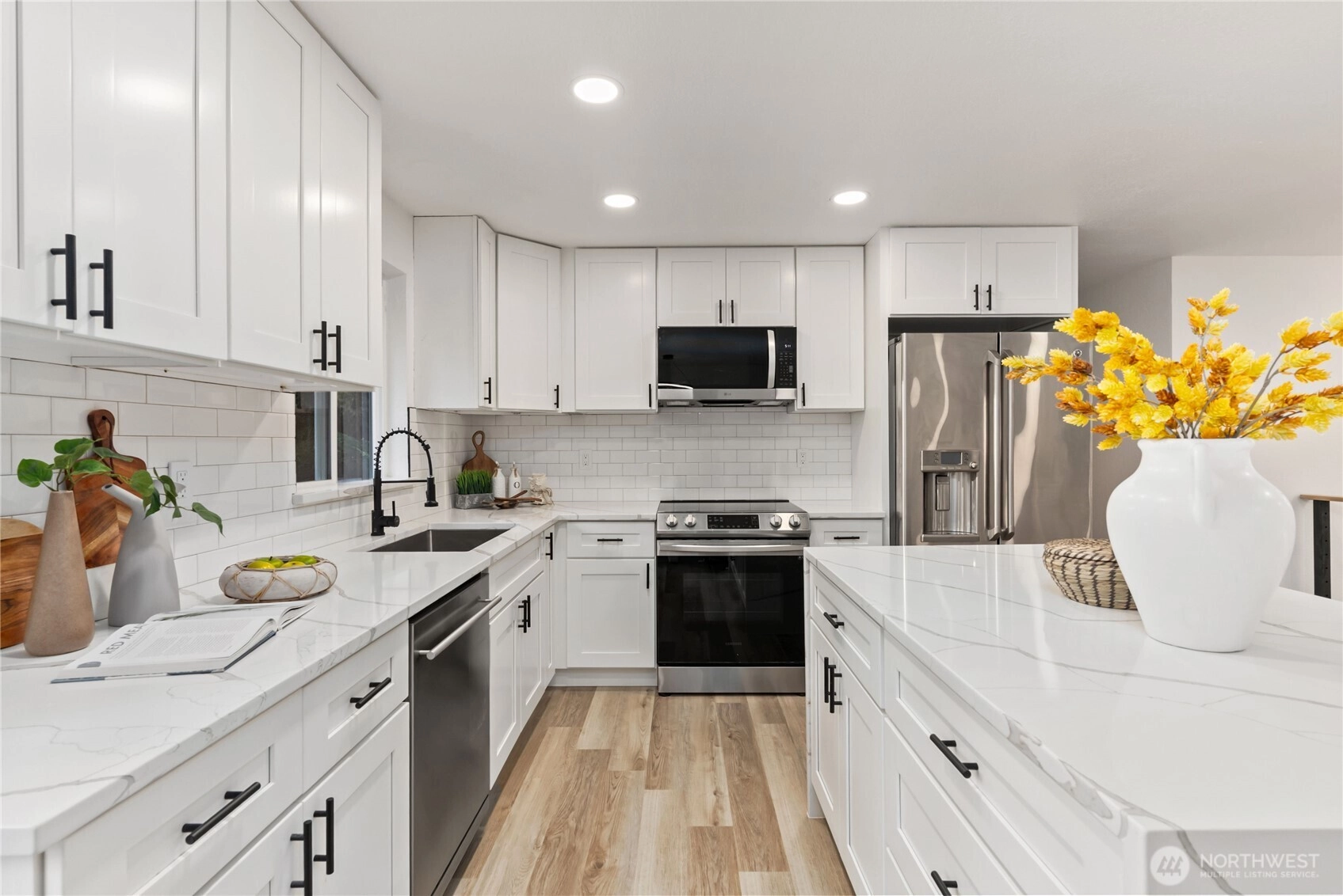Stunning remodeled split-entry home with newer roof and sleek glass garage doors, nestled on a fully fenced lot backing to a tranquil greenbelt. Enjoy exclusive access to Jenks Park with private beach, tennis courts, and boat launch—perfect for outdoor recreation. The upper level features 2 bedrooms, an office, and a beautifully updated kitchen with soft-close cabinets, stainless steel appliances, and a waterfall island, complemented by a mini-split unit in the living room for year-round comfort. Downstairs boasts a spacious primary suite with walk-in closet, ensuite bath, and a cozy family room. Combining modern upgrades, serene outdoor spaces, and coveted private park privileges, this home is truly a must-see!Come See TODAY!