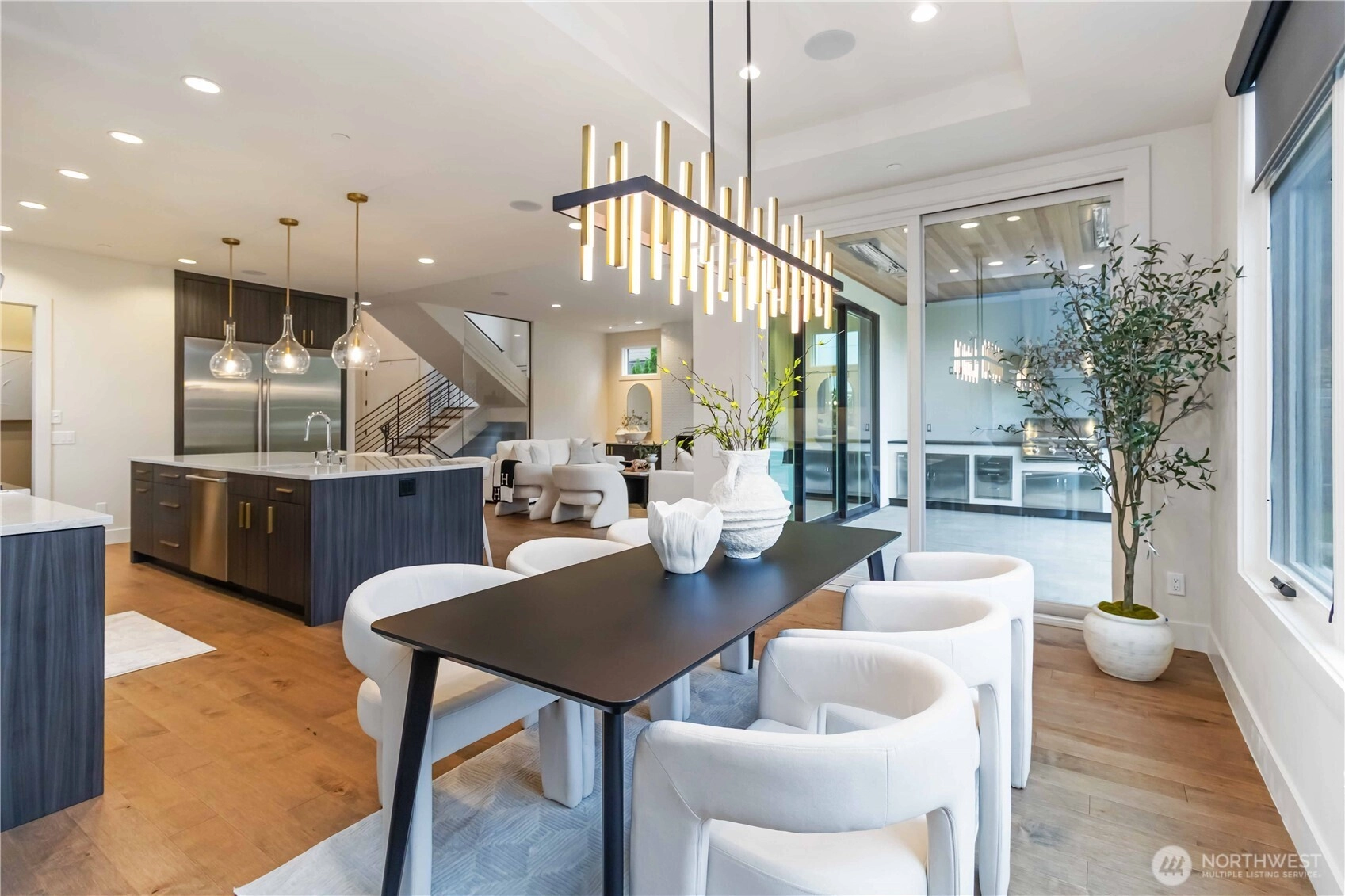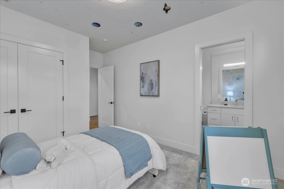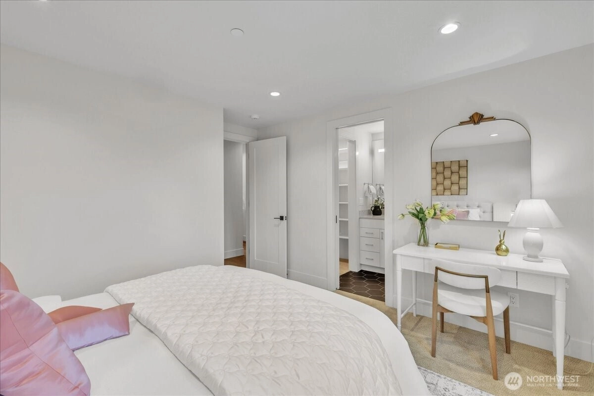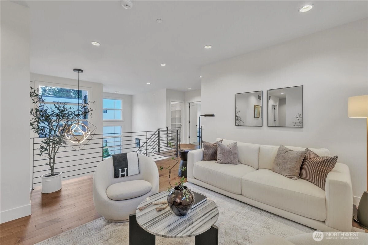 Custom-built by Bordner Construction in October 2022, this modern, minimalistic home blends luxury and comfort in Medina. A dramatic entry opens to light-filled living spaces with Lutron smart lighting and refined finishes throughout. The chef’s kitchen features custom cabinetry, quartz countertops, high-end appliances, and a butler’s pantry. The main level includes a bedroom that can also serve as an office. Upstairs, the owner’s suite offers a fireplace, balcony, dual closets, and spa bath. The lower level features a media room, wine cellar, and guest suite. Enjoy a flat backyard with covered patio, outdoor kitchen, and heaters—just minutes from Bellevue, dining, parks, and top-rated schools.