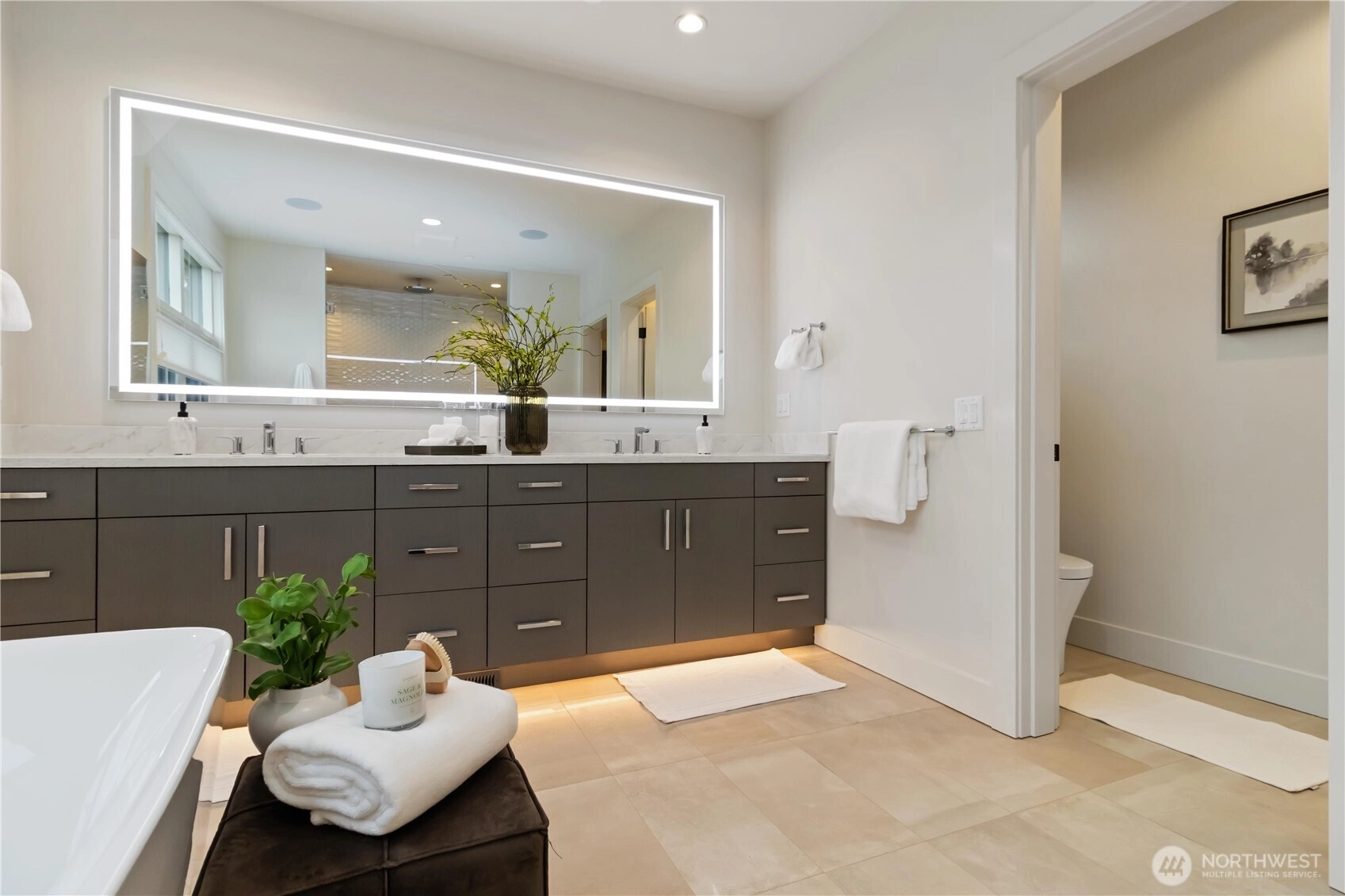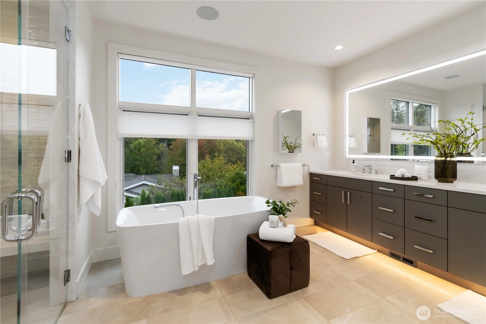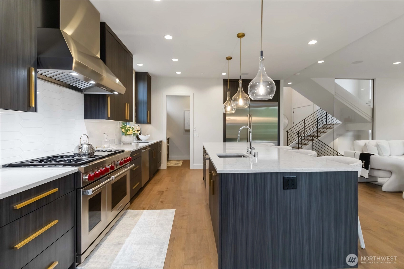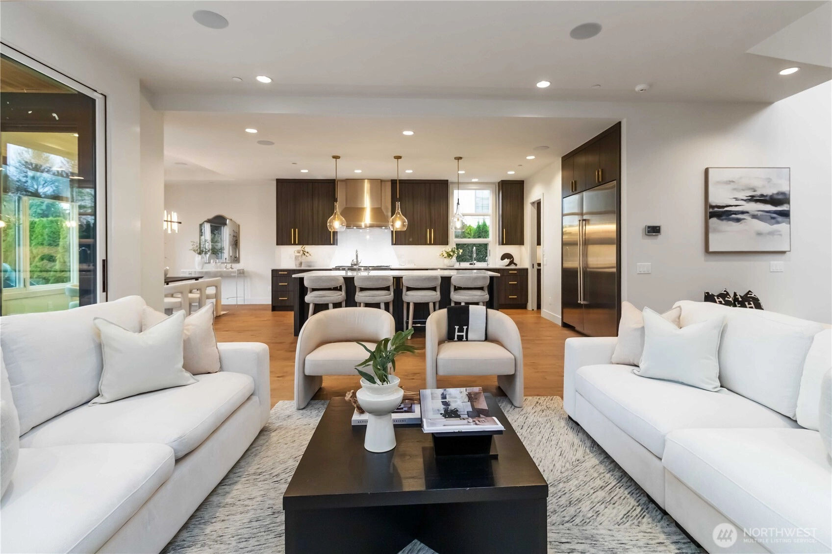 Custom-built by Bordner Construction in October 2022, this modern, minimalistic home blends luxury and comfort in Medina. A dramatic entry opens to light-filled living spaces with Lutron smart lighting and refined finishes throughout. The chef’s kitchen features custom cabinetry, quartz countertops, high-end appliances, and a butler’s pantry. The main level includes a bedroom that can also serve as an office. Upstairs, the owner’s suite offers a fireplace, balcony, dual closets, and spa bath. The lower level features a media room, wine cellar, and guest suite. Enjoy a flat backyard with covered patio, outdoor kitchen, and heaters—just minutes from Bellevue, dining, parks, and top-rated schools.