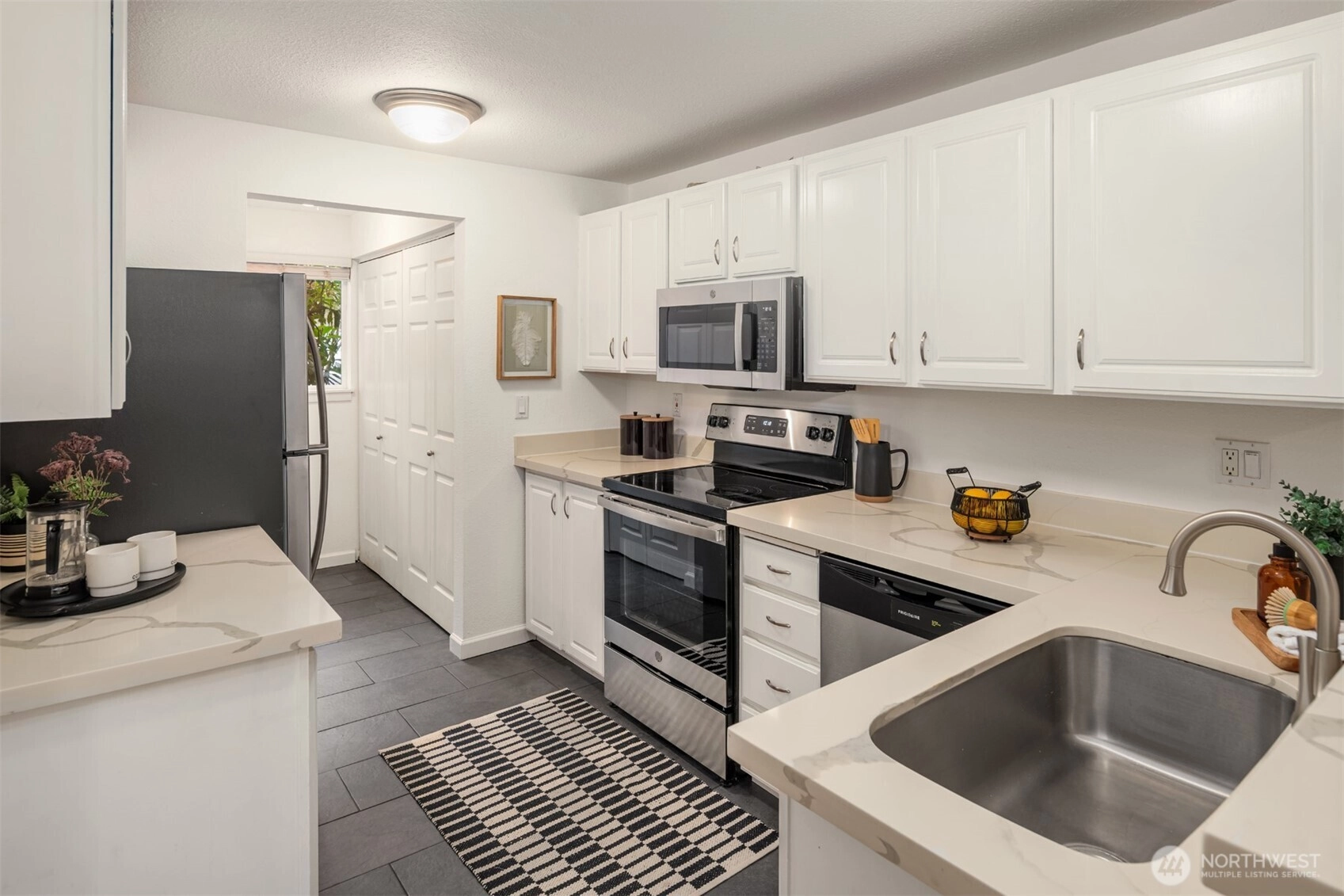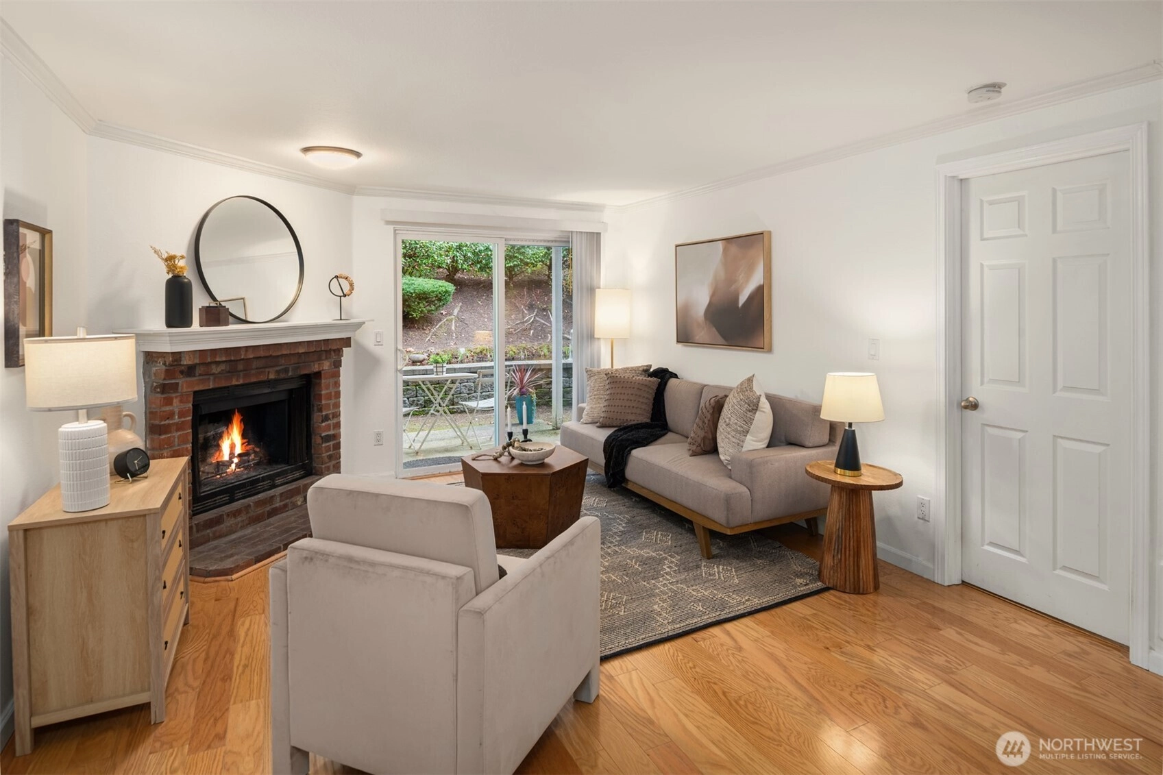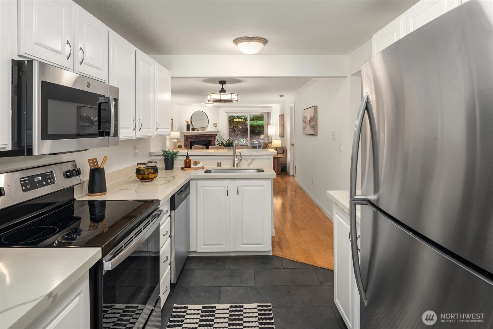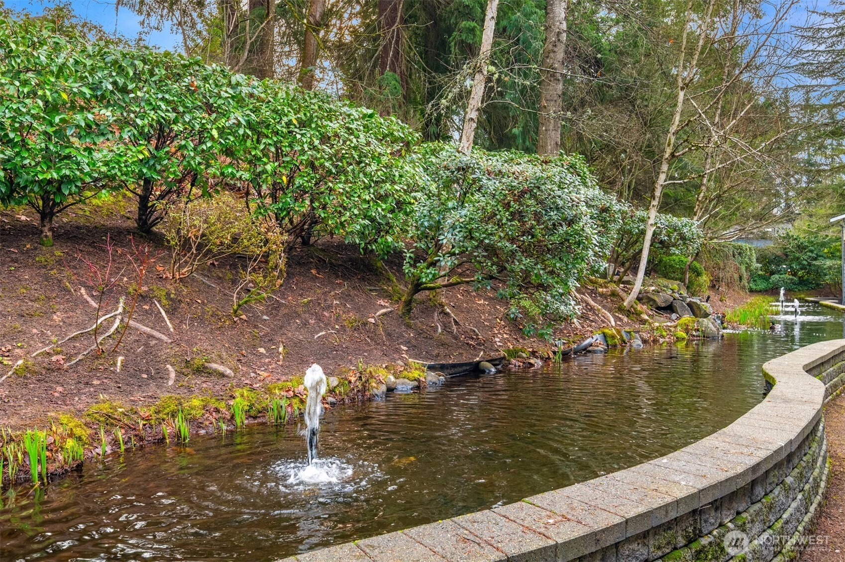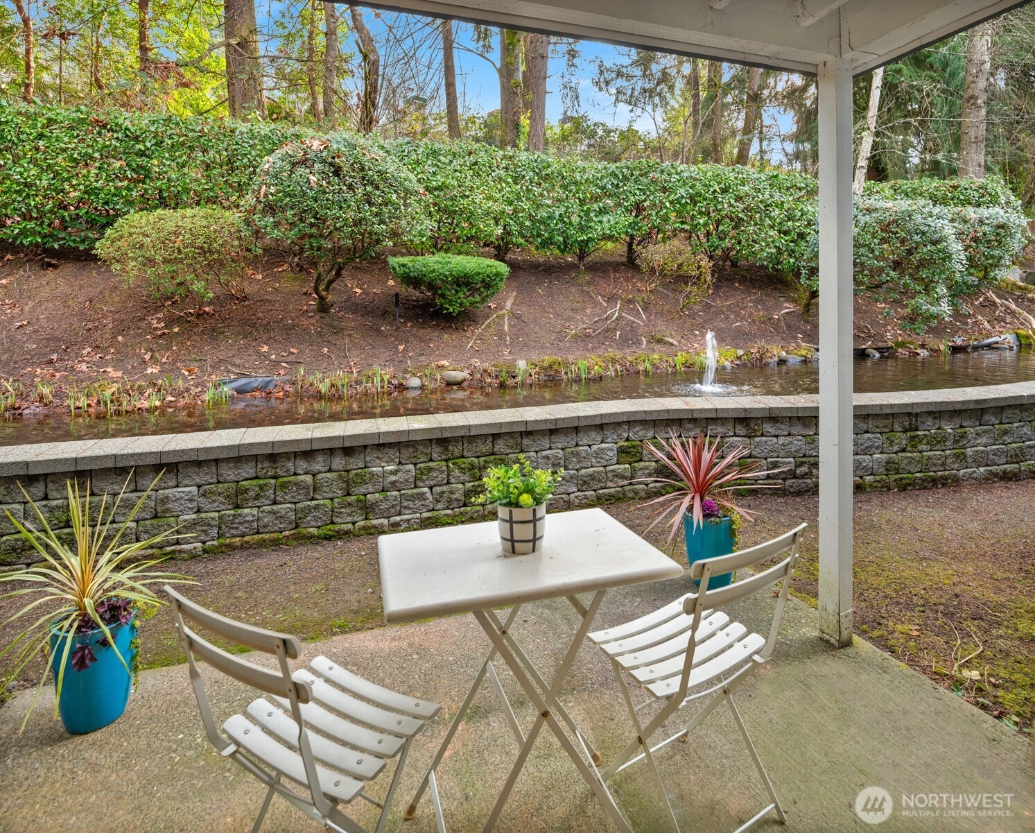 Tucked into the peaceful, well-maintained Kirkland Springs community, this updated ground-floor unit offers 980 square feet of comfortable, easy living. With a private exterior entrance and no common hallways, access is both convenient and welcoming. The ideal floor plan lives large, featuring an open layout with a dedicated dining area, a cozy wood-burning fireplace, and two generously sized bedrooms. The living space opens to a serene outdoor retreat with a private patio overlooking a tranquil pond and fountain. Recent upgrades include fresh interior paint, new tile flooring in the entry, kitchen, and bathrooms, marble kitchen countertops, and brand-new appliances including a refrigerator, dishwasher, and range. Both bathrooms have been refreshed with new tile flooring and countertops for an upgraded modern look. This unit checks all the boxes on your condo list with an assigned covered parking space plus additional owner and guest parking, in-unit laundry, and amenities including a clubhouse, pool, hot tub, fitness room, and basketball court. Located just a short stroll or roll to shopping and dining at Juanita Village and Juanita Beach Park, and minutes to The Village at Totem Lake and downtown Kirkland's lively waterfront. Convenient to I-405 for easy access to downtown Bellevue, Google Kirkland, and Microsoft. No rental cap, no special assessments, and located in the award winning Lake Washington School District.